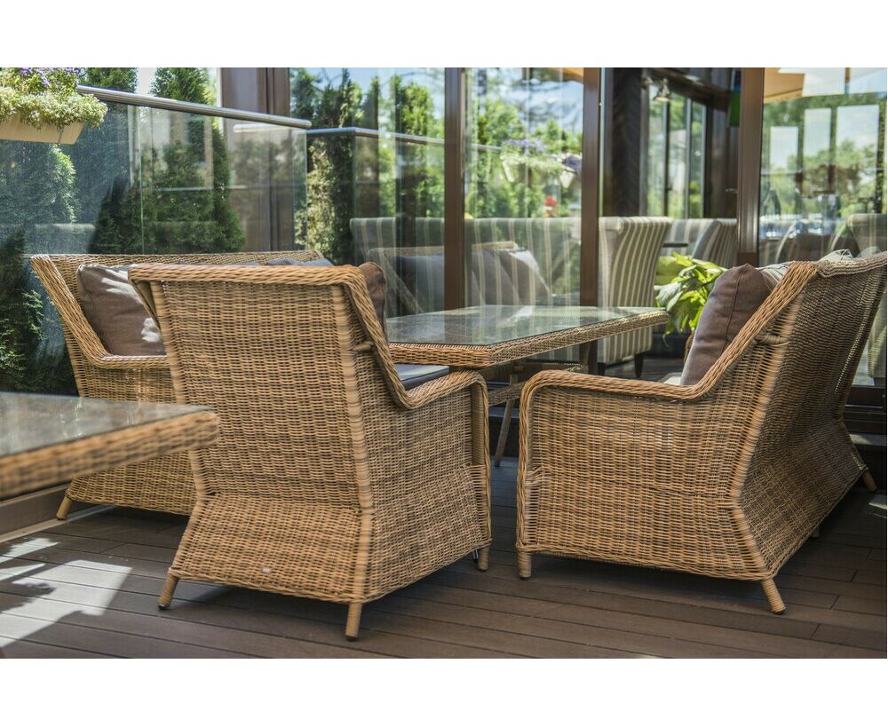Каркас мебели сделан из прочного алюминия с высокими эксплуатационными качествами. Оплетен вручную с помощью круглого искусственного ротанга. Представлено в соломенном оттенке.