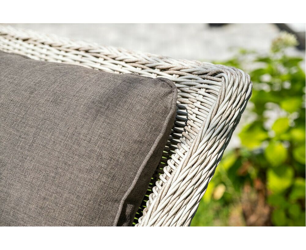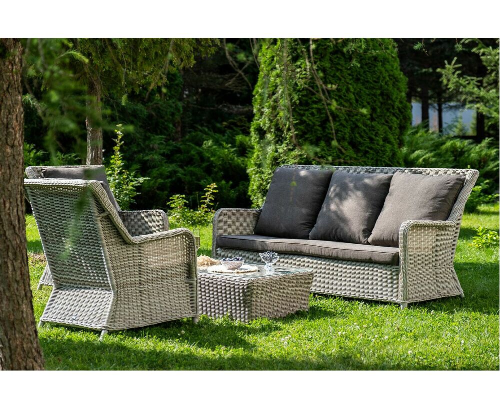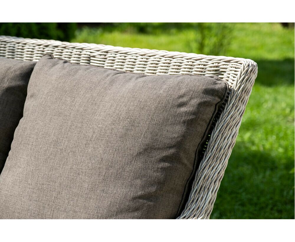 Плетеная мебель дополнена удобными подушками в серо-коричневых чехлах. При их изготовлении используют полиэстер, плотность – 230гр/м2. Он обрабатывается влагоотталкивающей пропиткой для повышения защитных свойств материала.
