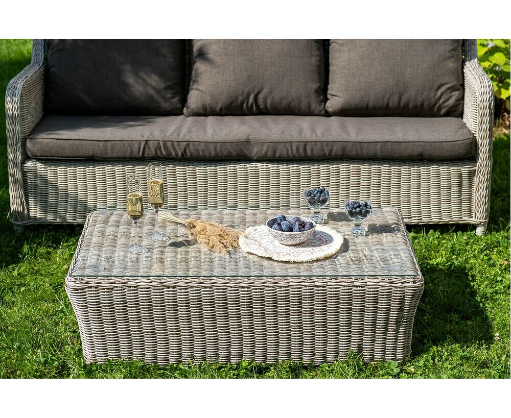 Журнальный столик оснащен столешницей из закаленного стекла толщиной 5 мм. На ножках закриплены пластиковые загрушки, предотвращающие царапины на поверхности пола. "Гляссе" диван трехместный из искусственного ротанга, цвет бежевый 1шт. 1 900Х880Х990, "Гляссе" кресло плетеное из искусственного ротанга, цвет бежевый 2шт. 730Х880Х990, "Капучино" журнальный столик из искусственного ротанга, цвет бежевый 1шт. 1 100Х660Х340,