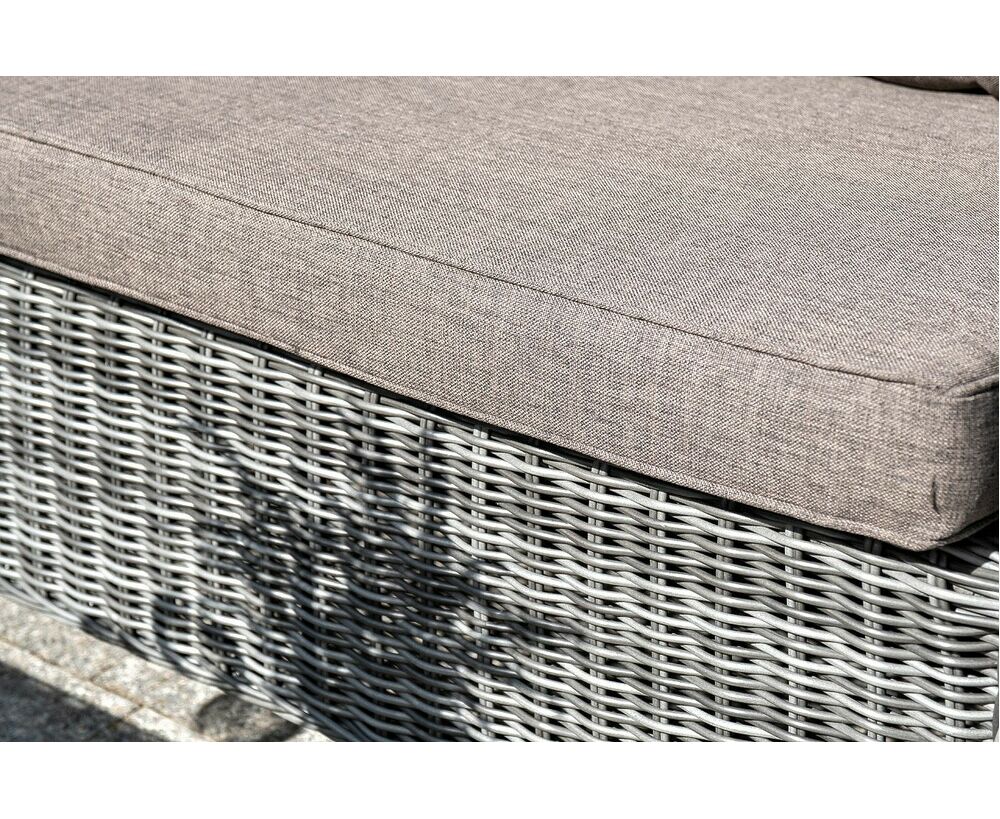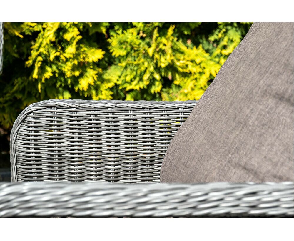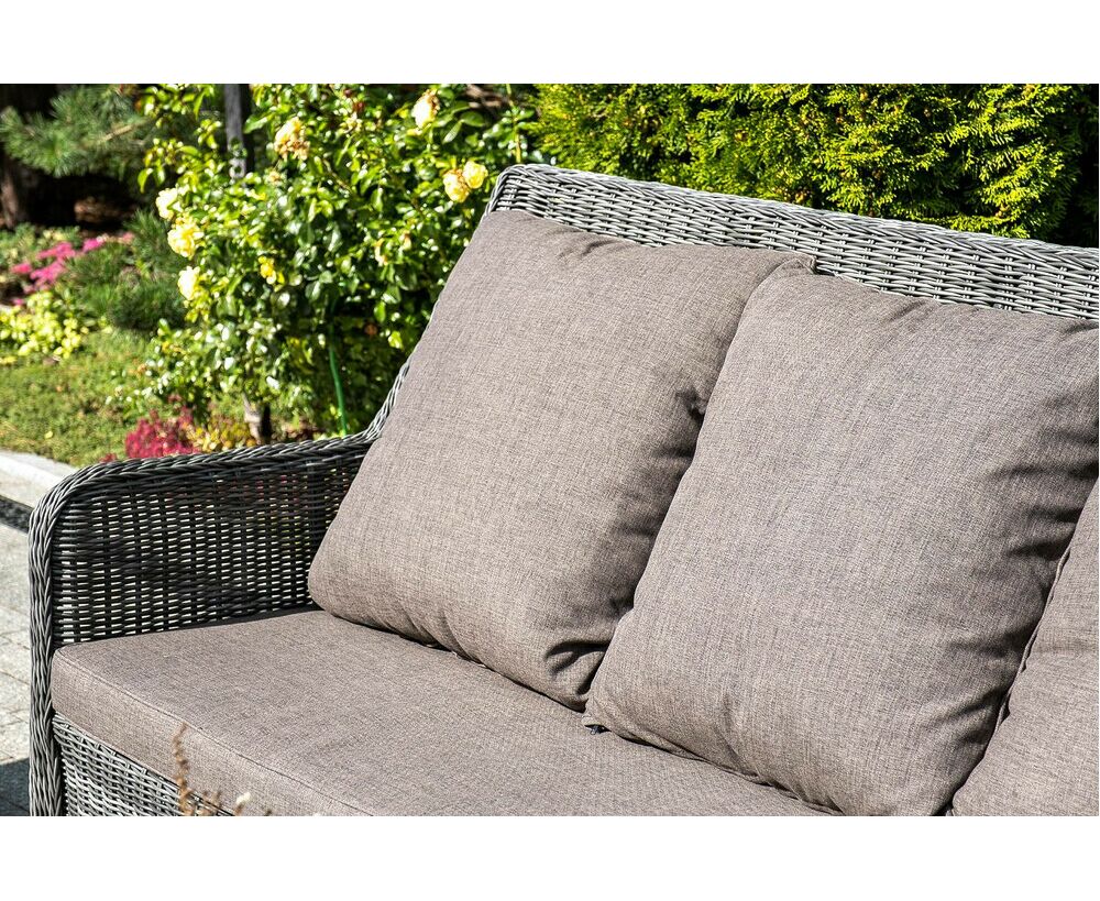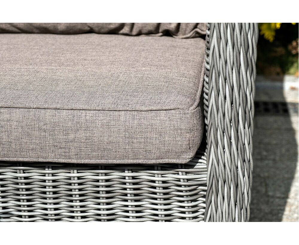 Плетеная мебель дополнена удобными подушками в серо-коричневых чехлах. При их изготовлении используют полиэстер, плотность – 230гр/м2. Он обрабатывается влагоотталкивающей пропиткой для повышения защитных свойств материала.