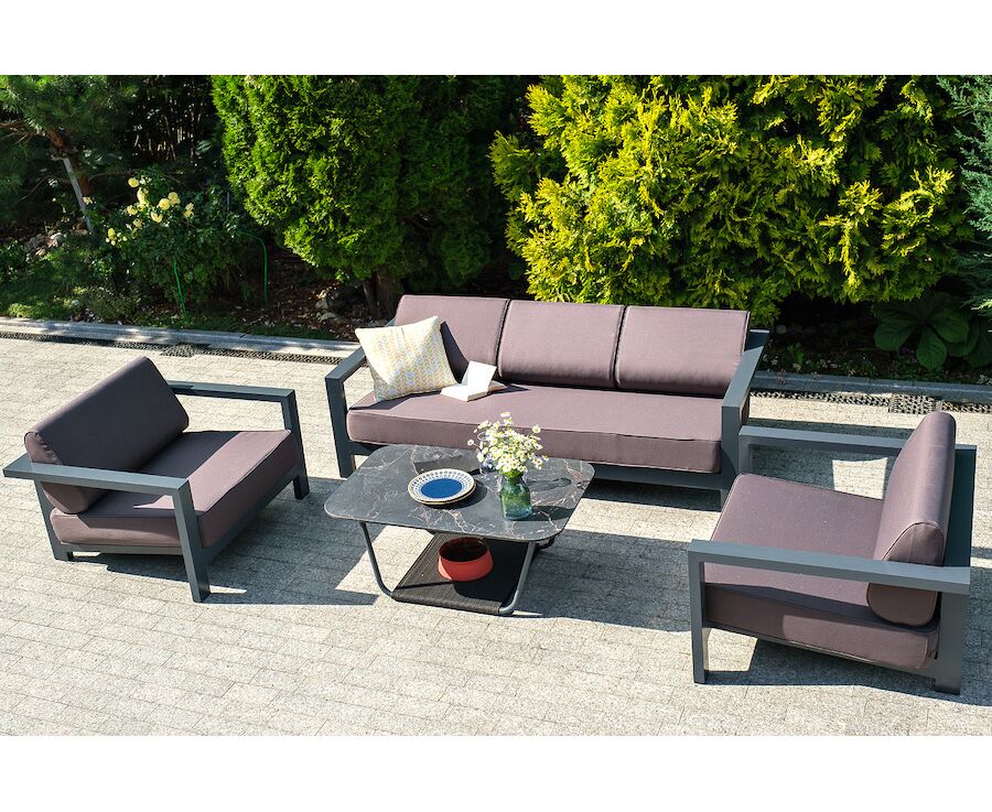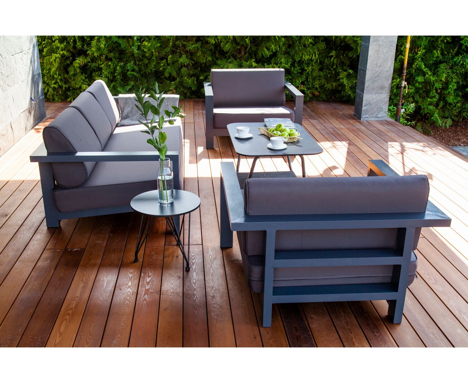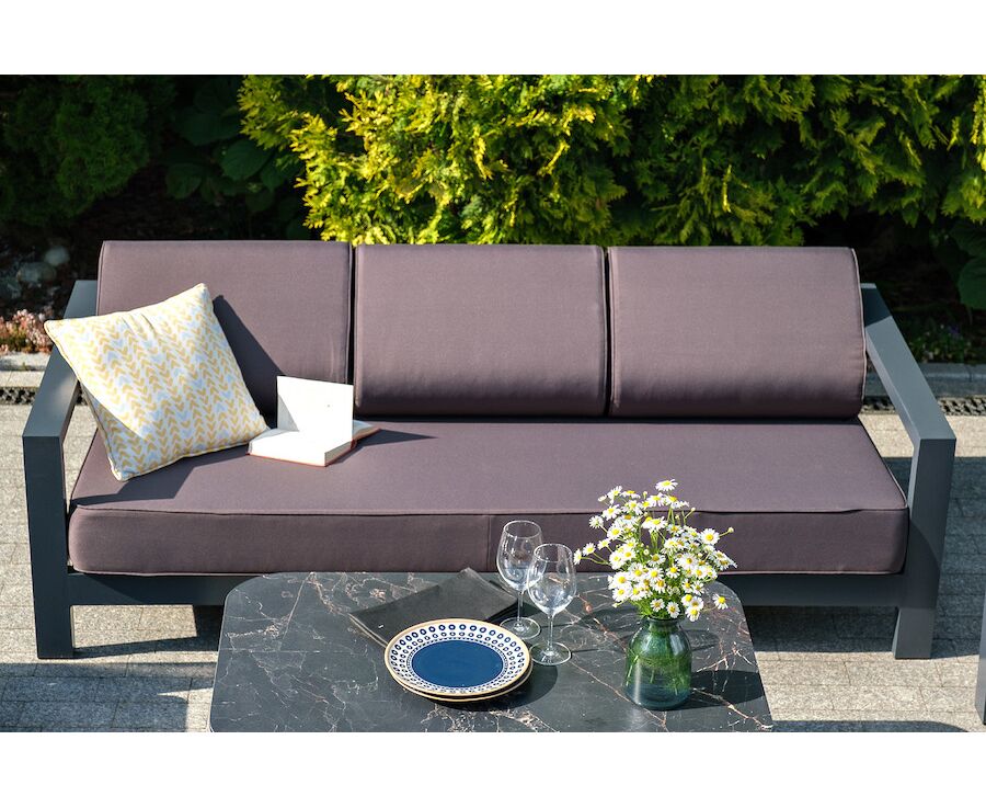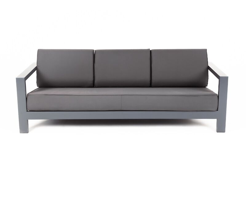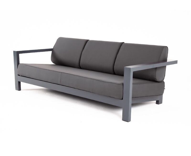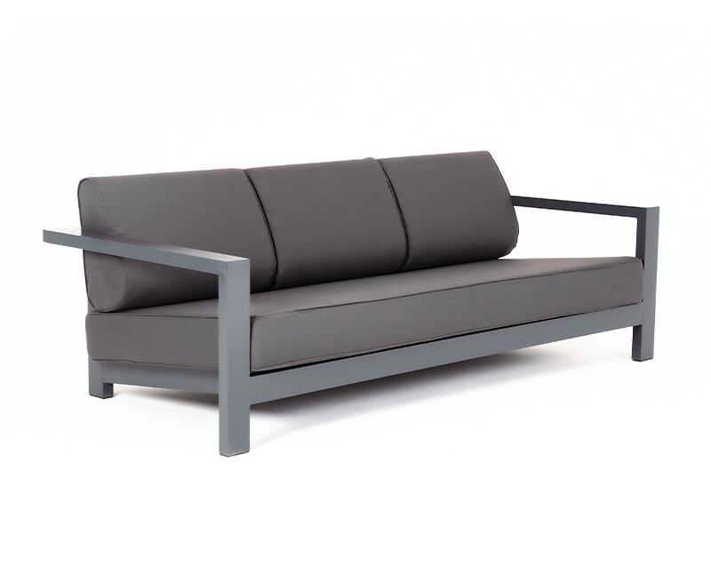 Стильный трехместный диван «Гранада» для обустройства зоны отдыха на балконе, в кафе или летней веранде. Каркас изготовлен из высокопрочного алюминия темно-серого (RAL7024) цвета.