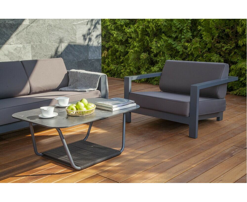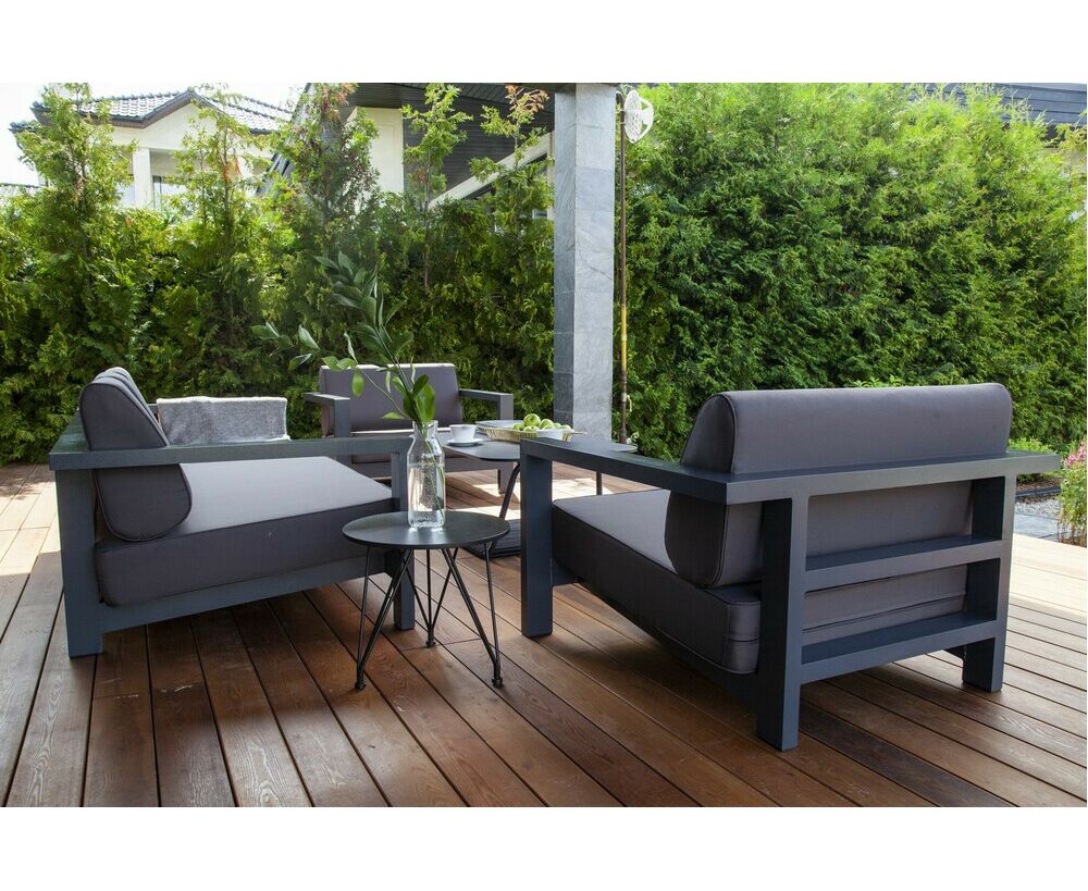 Стильное кресло «Гранада» для создания зоны отдыха. Каркас выполнен из высокопрочного легкого алюминия темно-серого (RAL7024) цвета. На сидениях и спинке предусмотрены подушки темно-серого оттенка.