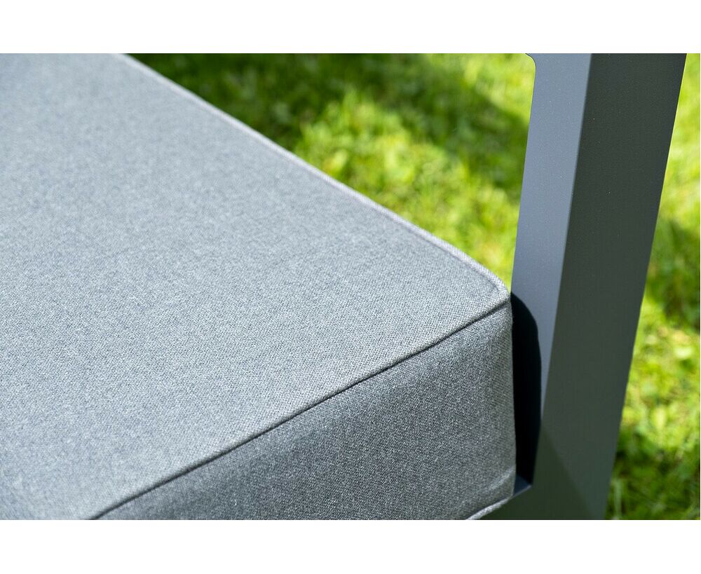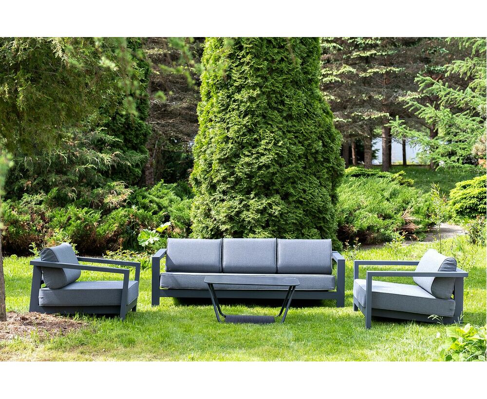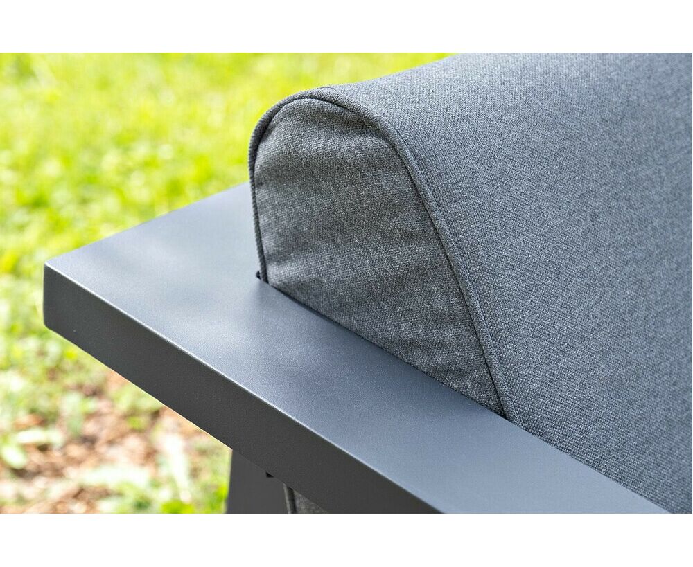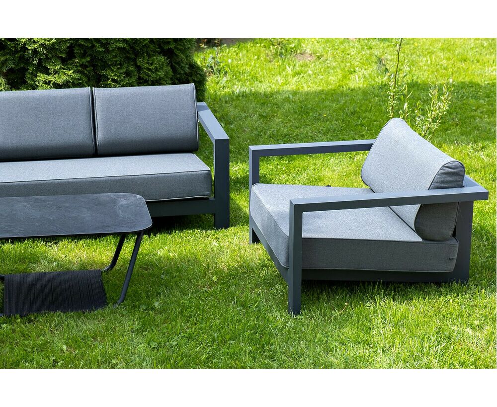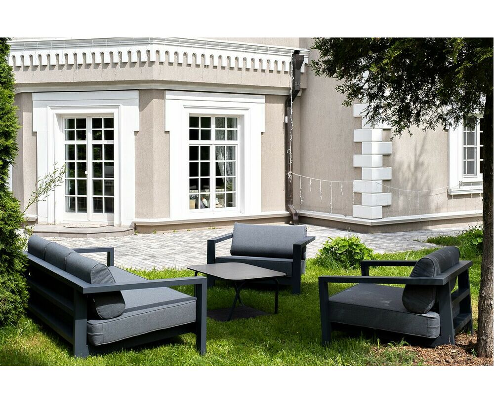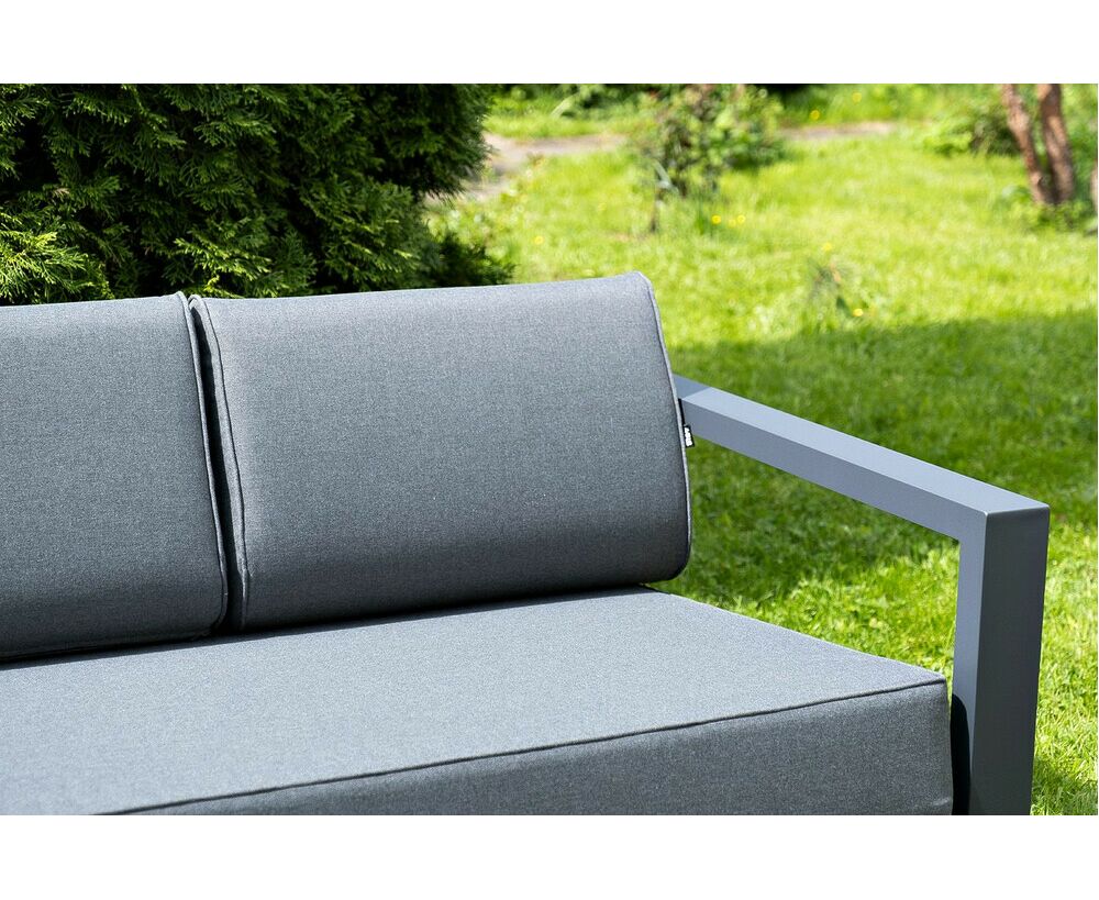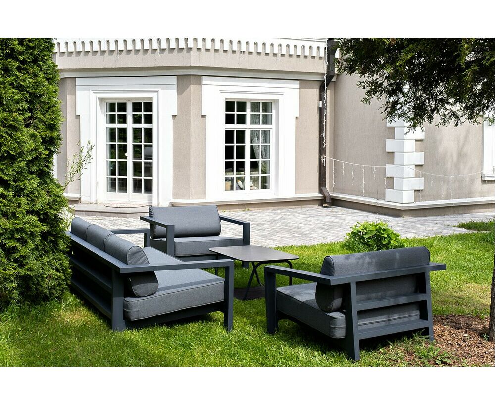 Каркас мебели выполнен из алюминиевого профиля, окрашенного в темно-серый (RAL7024) цвет. Дополняют комплект подушки со съемными чехлами.