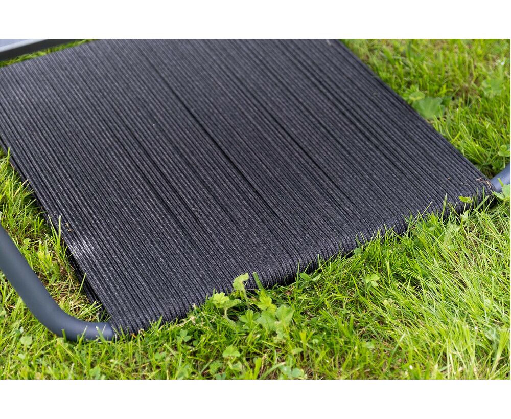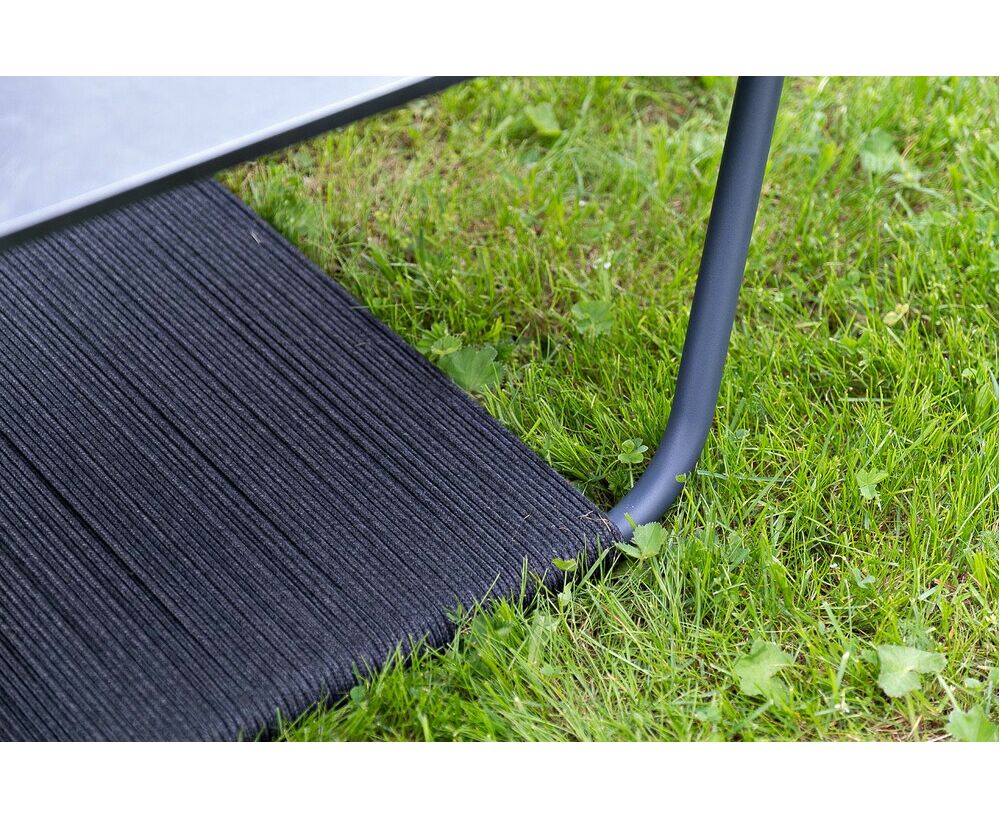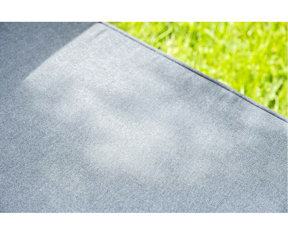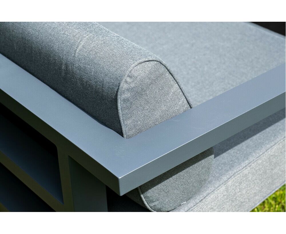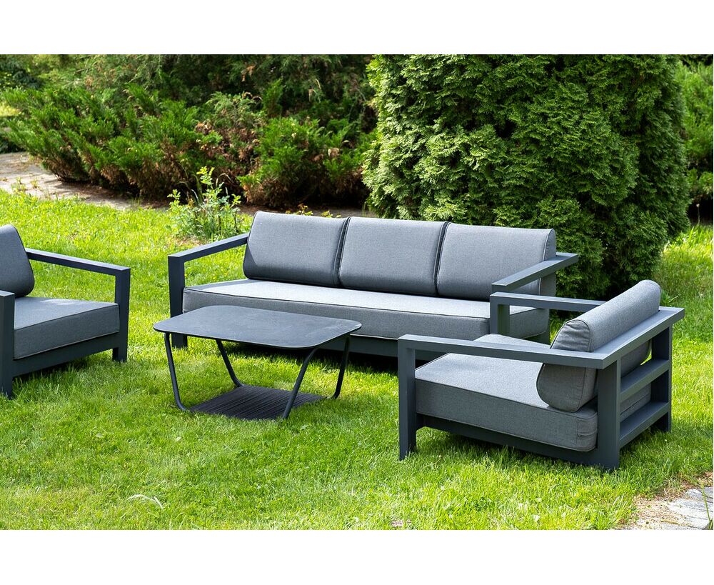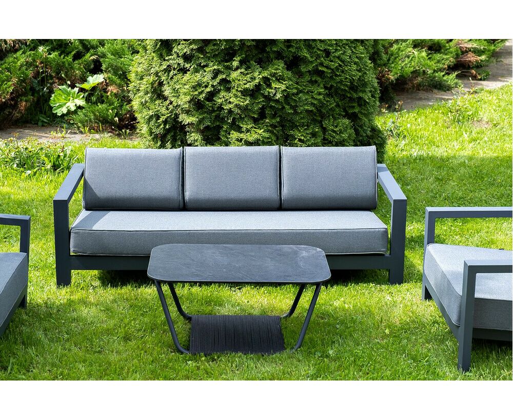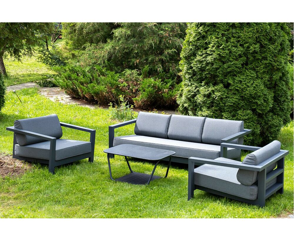 Каркас мебели выполнен из алюминиевого профиля, окрашенного в темно-серый (RAL7024) цвет. Дополняют комплект подушки со съемными чехлами.