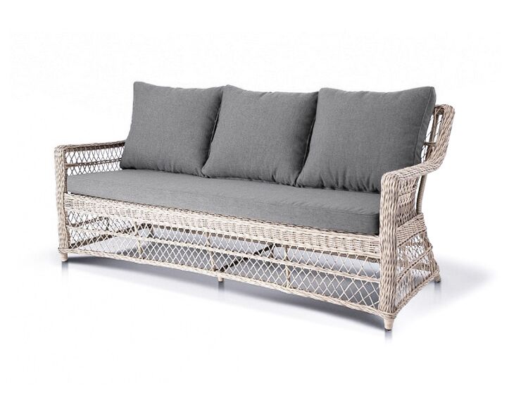 Модель выполнена с помощью ручного круглого плетения из искусственного ротанга. Трехместный диван представлен в бежевом цвете.