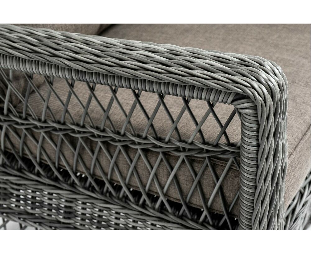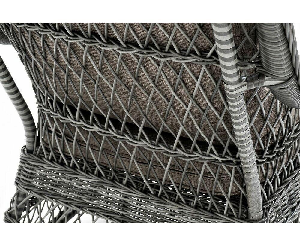 Укомплектовано плетеное кресло удобными мягкими подушками, одна из которых располагается в области спинки. Они выполнены в серо-коричневом оттенке. При пошиве тканевых изделий используется полиэстер, плотностью 230гр/м2. Он в обязательном порядке проходит обработку влагоотталкивающей пропиткой.