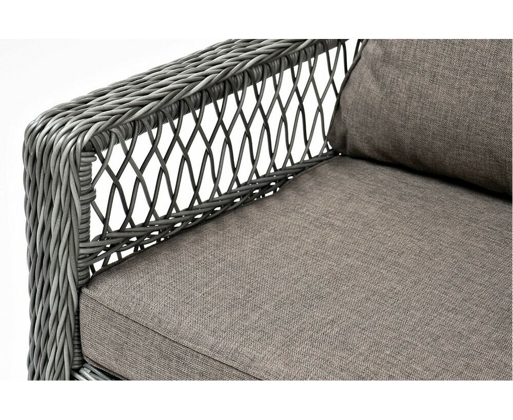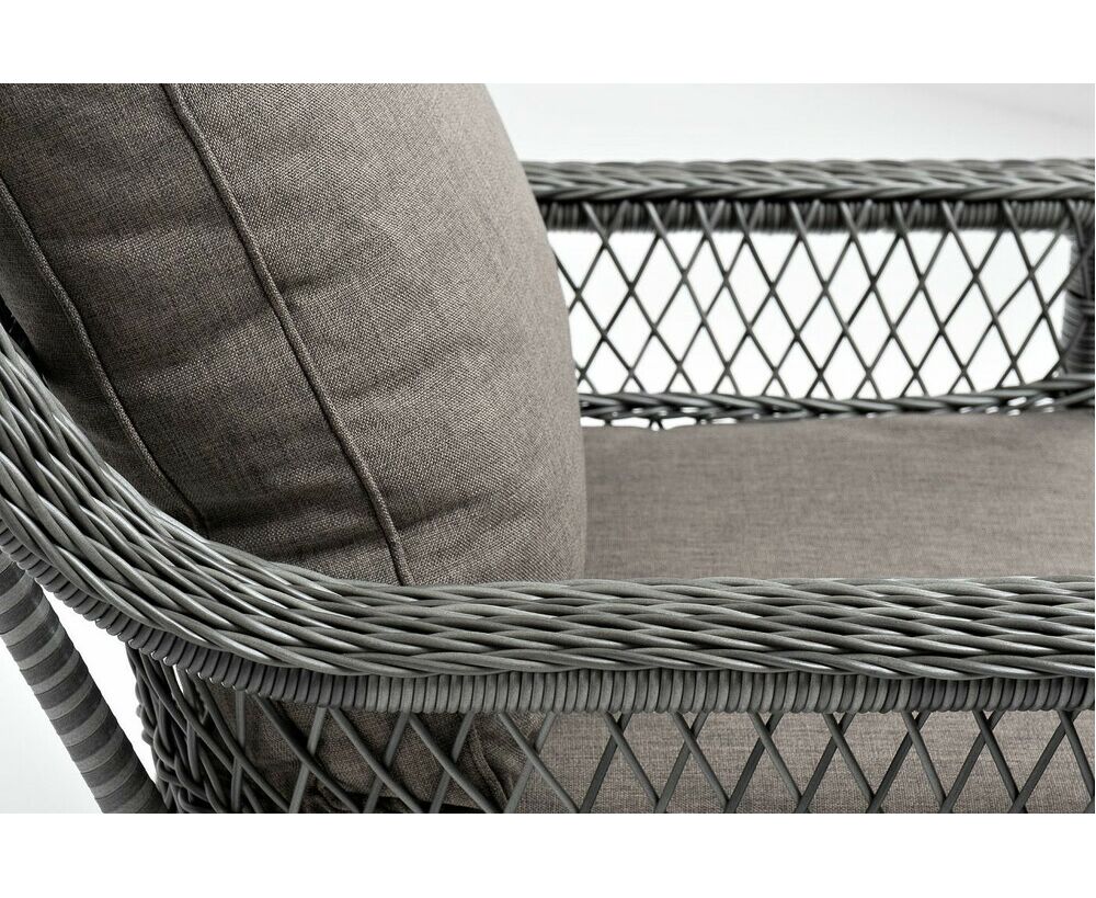 Кресло изготовлена из устойчивого алюминиевого каркаса. Искусственный ротанг украшает мебель в качестве круглого ручного плетения. Оно представлено в цвете "графит".
