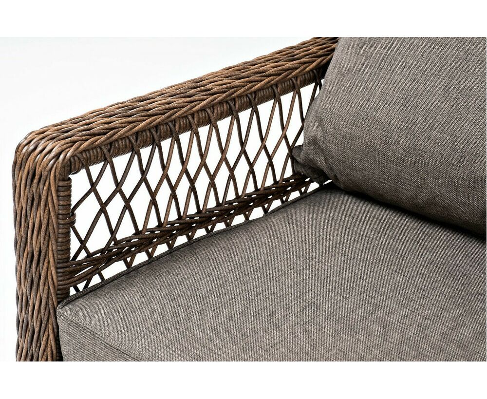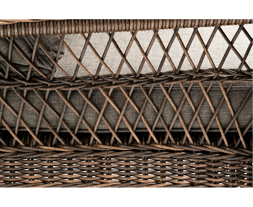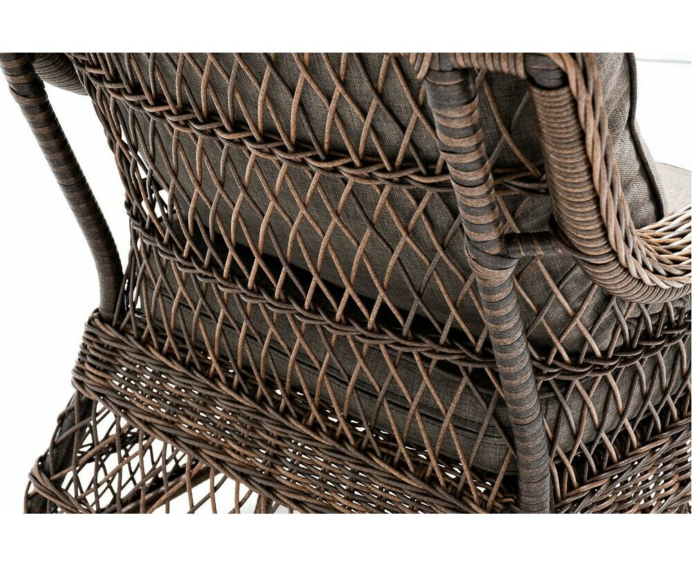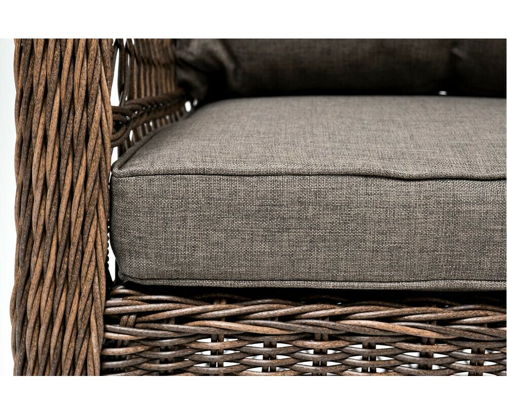 Укомплектовано плетеное кресло удобными мягкими подушками, одна из которых располагается в области спинки. Они выполнены в серо-коричневом оттенке. При пошиве тканевых изделий используется полиэстер, плотностью 230гр/м2. Он в обязательном порядке проходит обработку влагоотталкивающей пропиткой.
