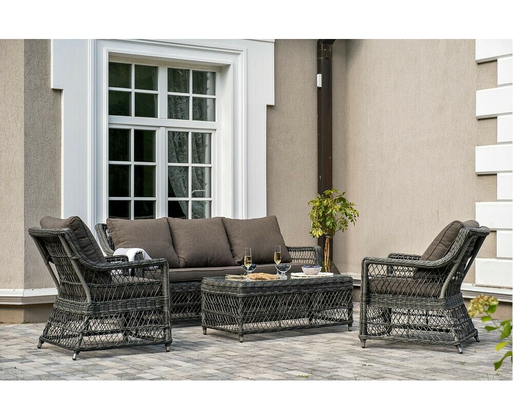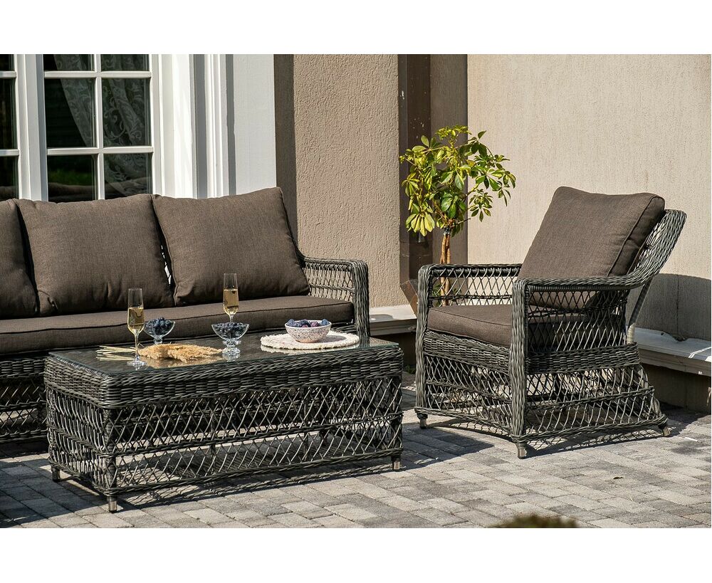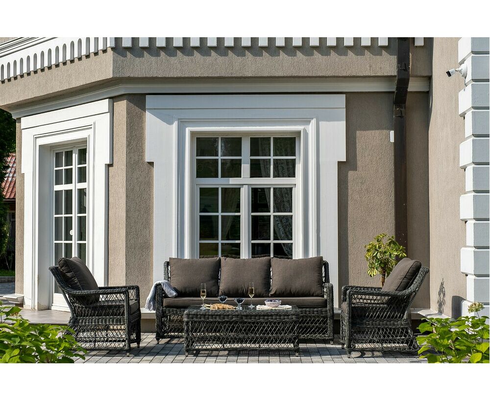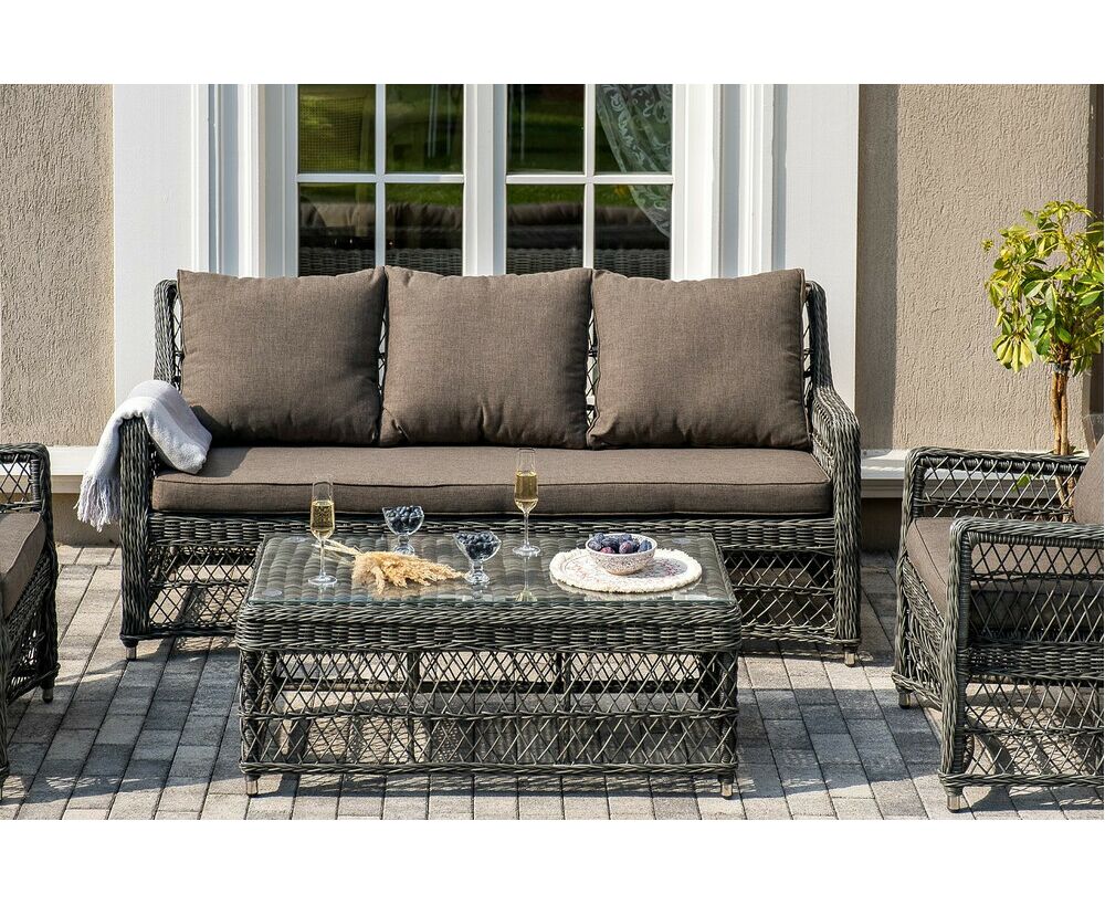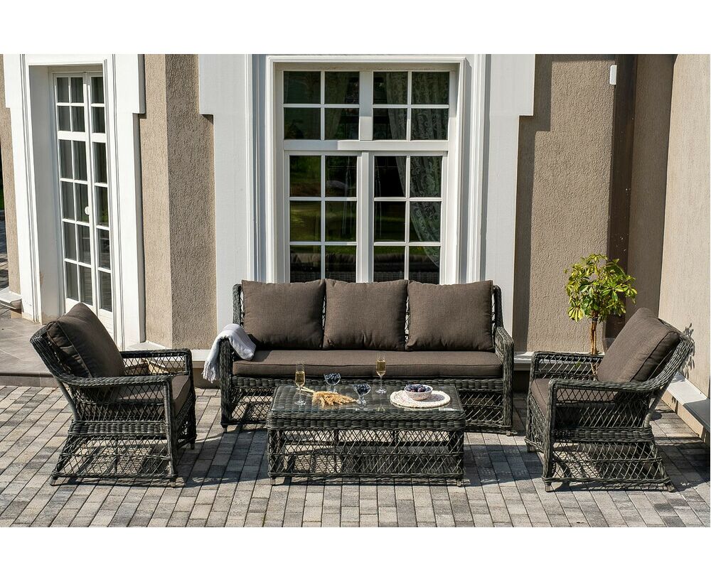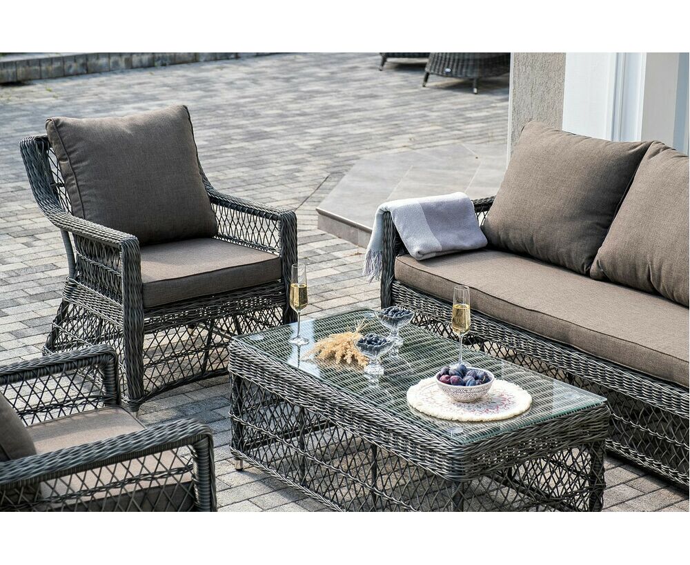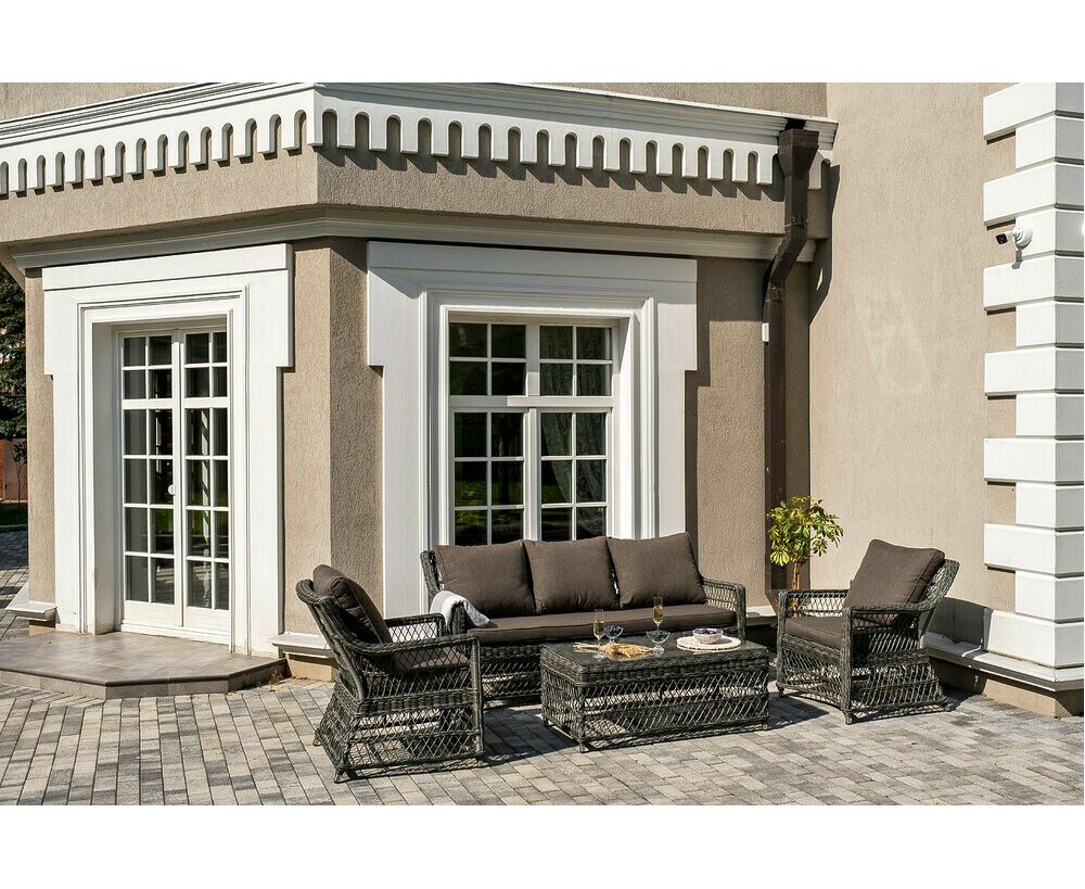 Уличная мебель имеет алюминиевый каркас с ручным плетением из искусственного ротанга в цвете "графит". Предусмотрены мягкие подушки из полиэстера серо-коричневого цвета с плотностью 230гр/м2. Они имеет влагоотталкивающую пропитку. Рабочая поверхность столика изготовлена из закаленного стекла толщиной 5 мм.