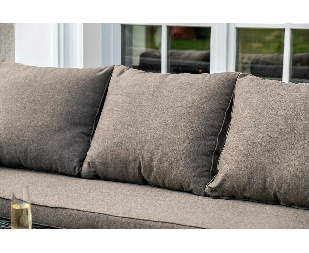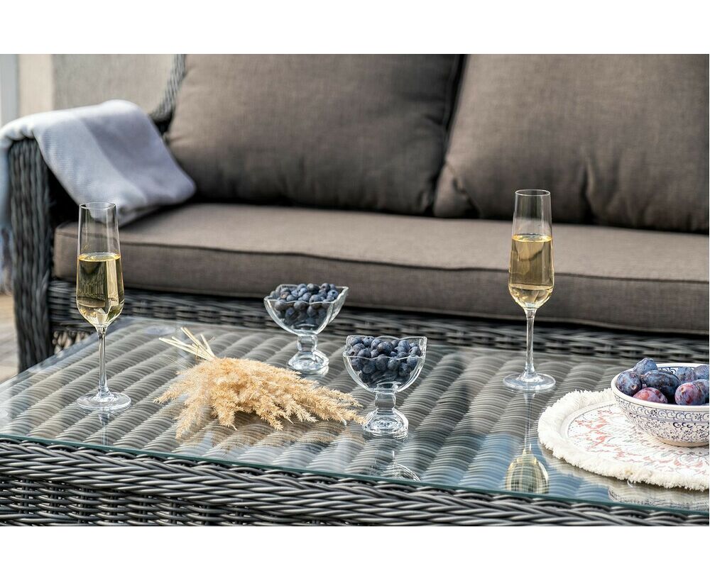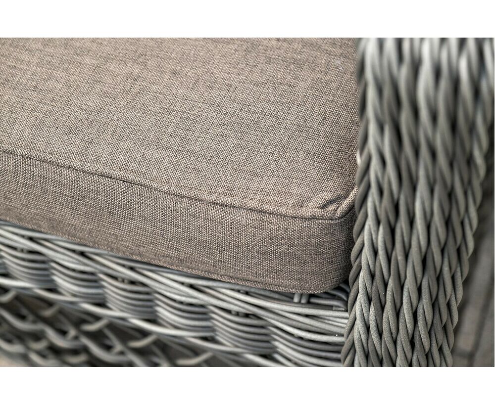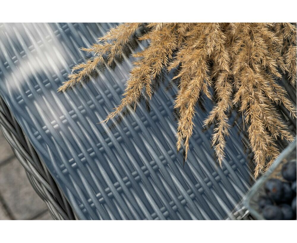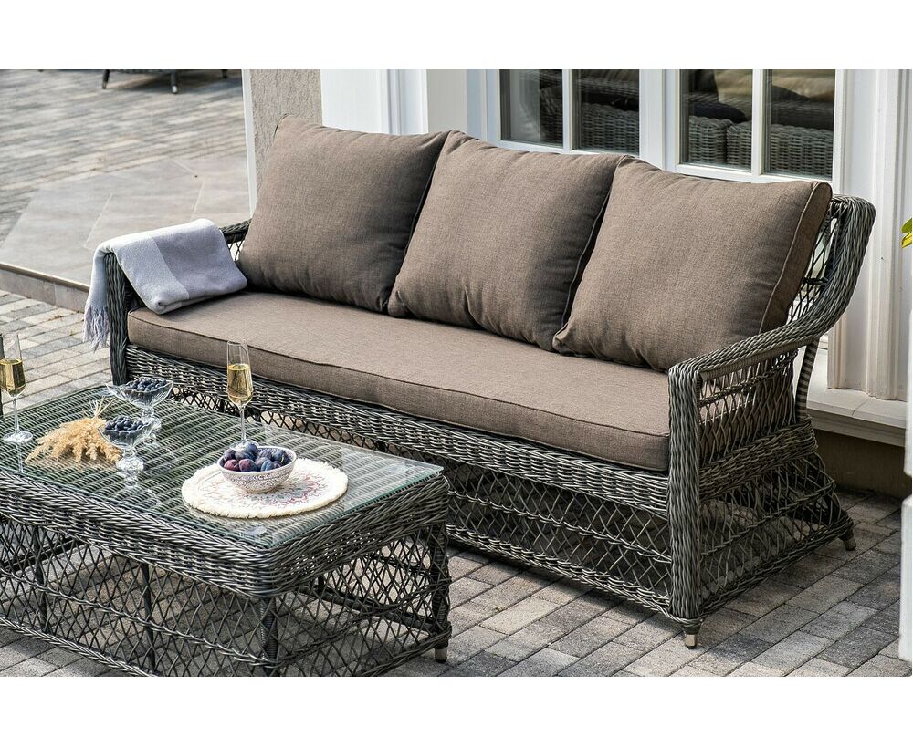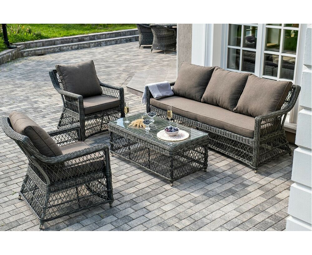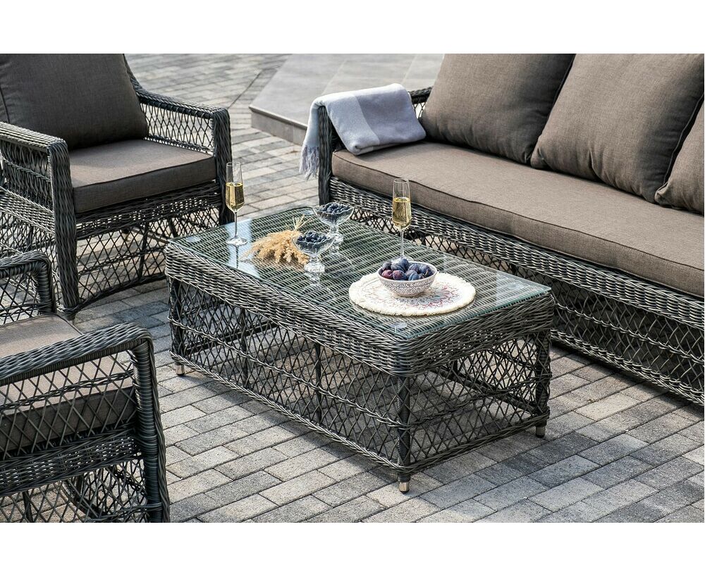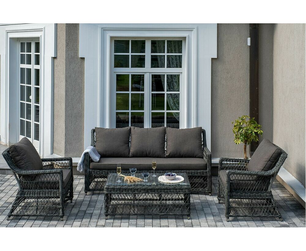 Уличная мебель имеет алюминиевый каркас с ручным плетением из искусственного ротанга в цвете "графит". Предусмотрены мягкие подушки из полиэстера серо-коричневого цвета с плотностью 230гр/м2. Они имеет влагоотталкивающую пропитку. Рабочая поверхность столика изготовлена из закаленного стекла толщиной 5 мм.