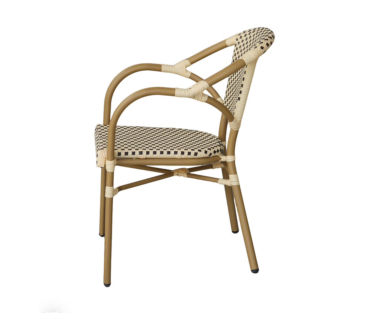 В набор входят квадратный стол и четыре стула, объединённые единым дизайнерским решением: изысканное ручное плетение из плоского искусственного ротанга в бежево‑коричневой гамме эффектно дополняет прочный алюминиевый каркас с износостойким покрытием.