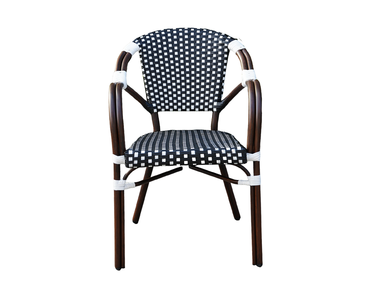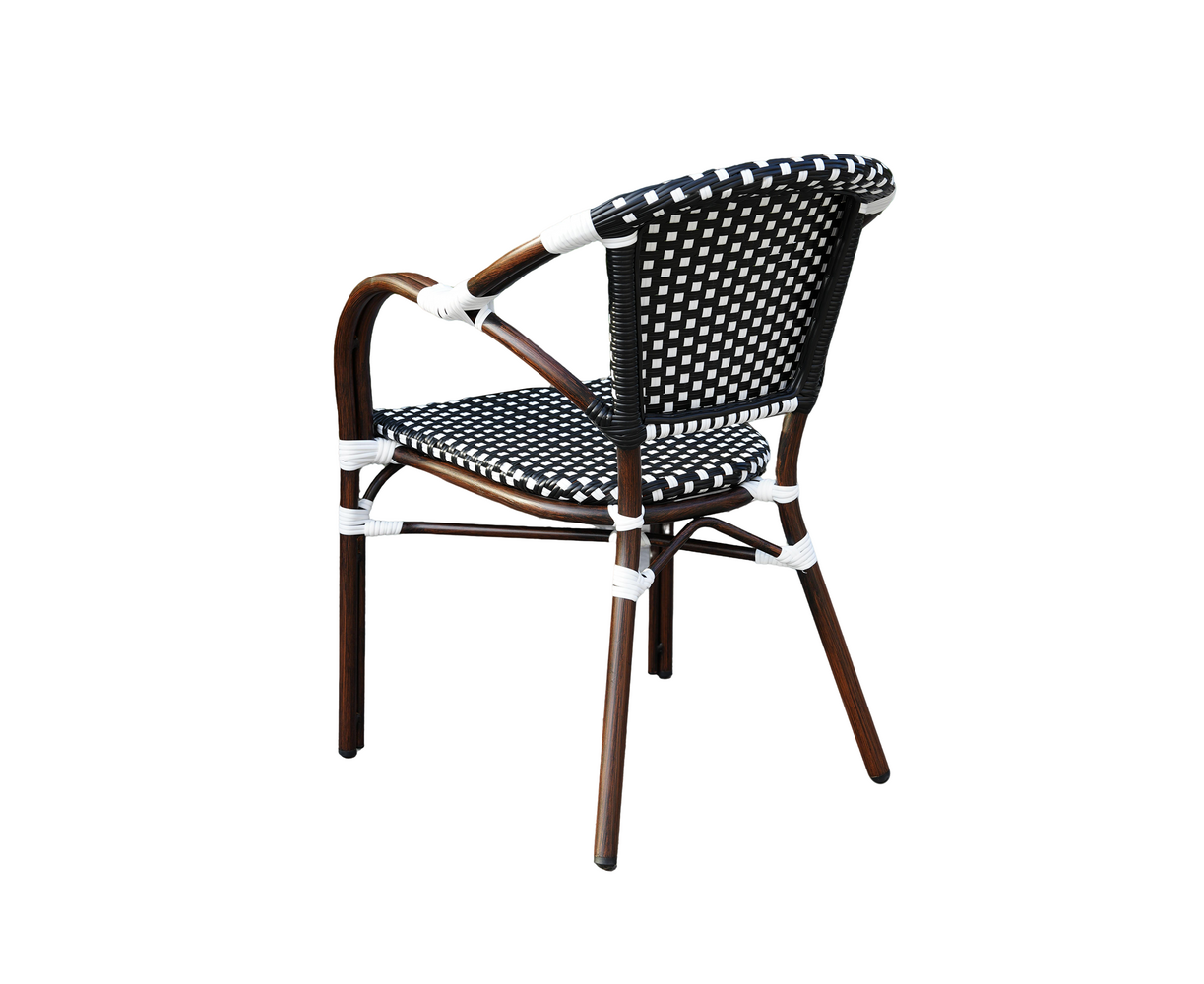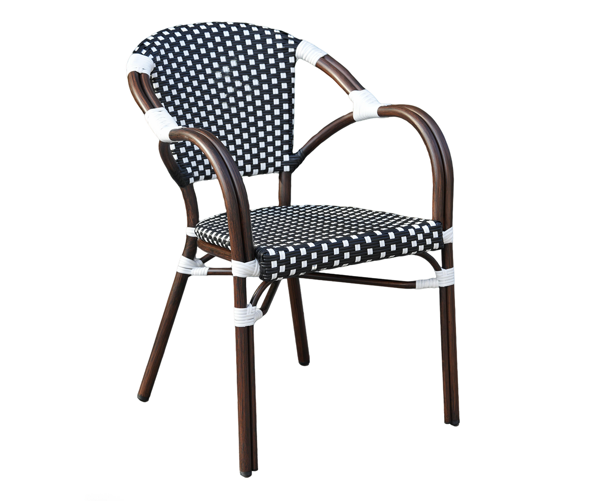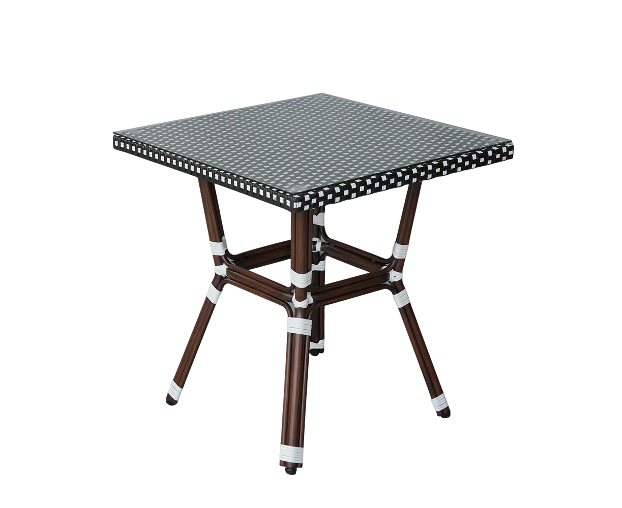 В набор входят квадратный стол и четыре стула, объединённые единым дизайнерским решением: изысканное ручное плетение из плоского искусственного ротанга в черно‑белой гамме эффектно дополняет прочный алюминиевый каркас с износостойким покрытием.