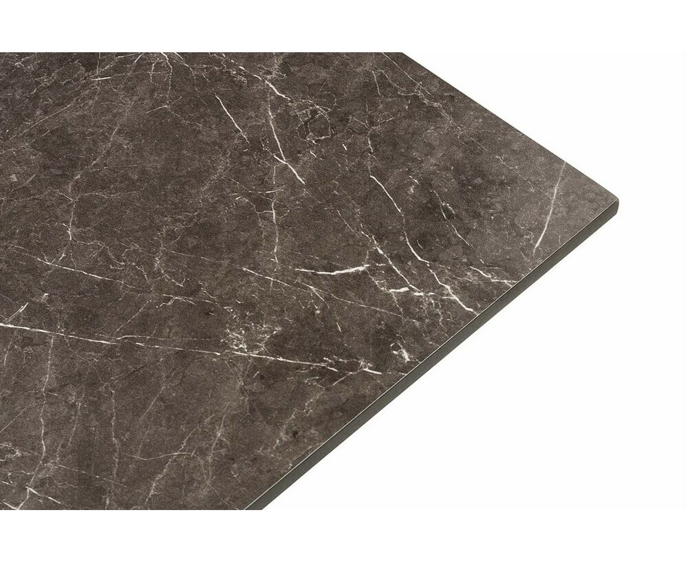 Интерьерный круглый стол «Каффе» со столешницей из HPL в цвете «серый мрамор». Это высококачественный ударопрочный компакт-пластик, обладающий низкой пористостью, что предотвращает впитывание жидкостей, поэтому столы из HPL идеально подходит для обеденных зон. Толщина столешницы – 12 мм.