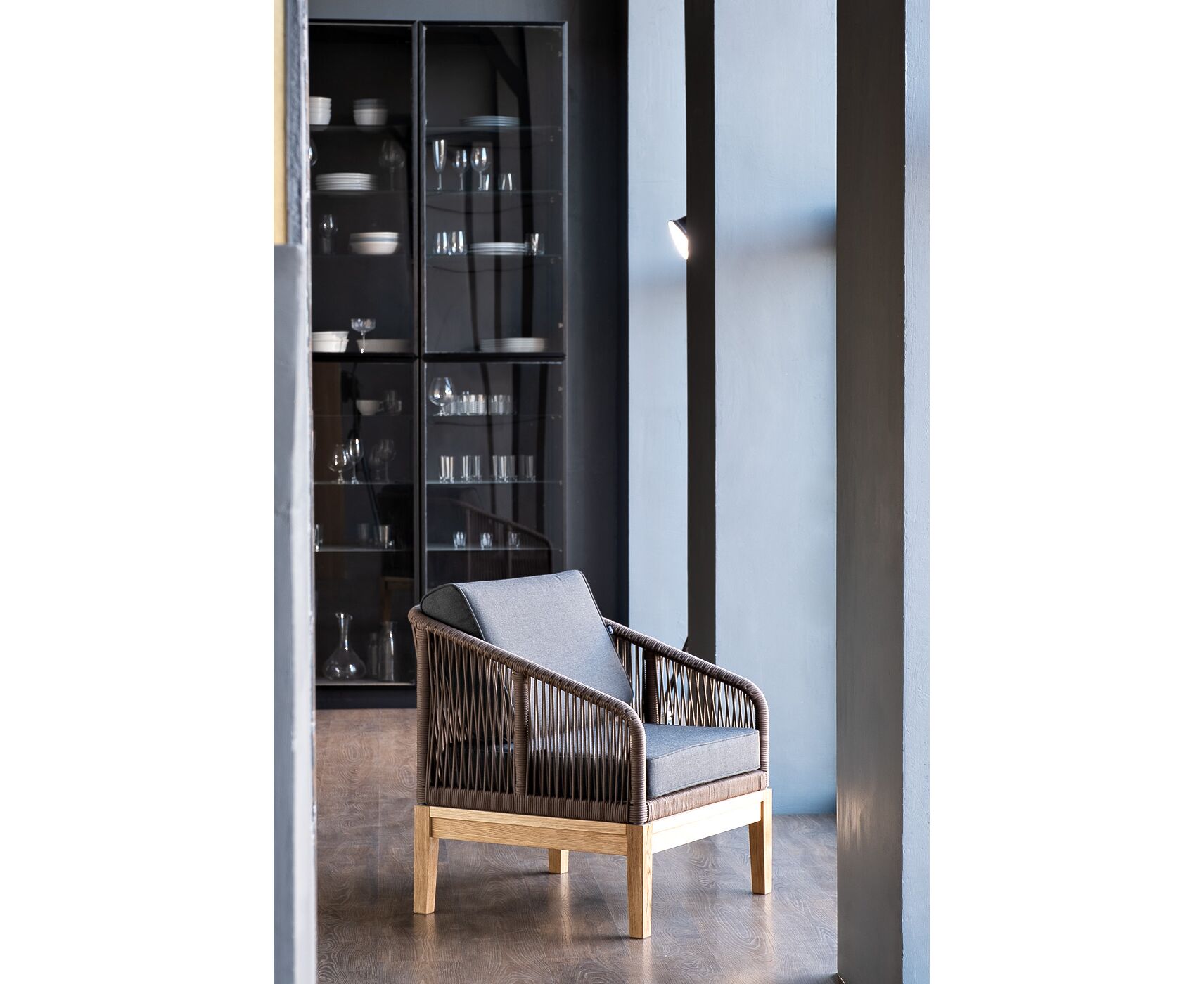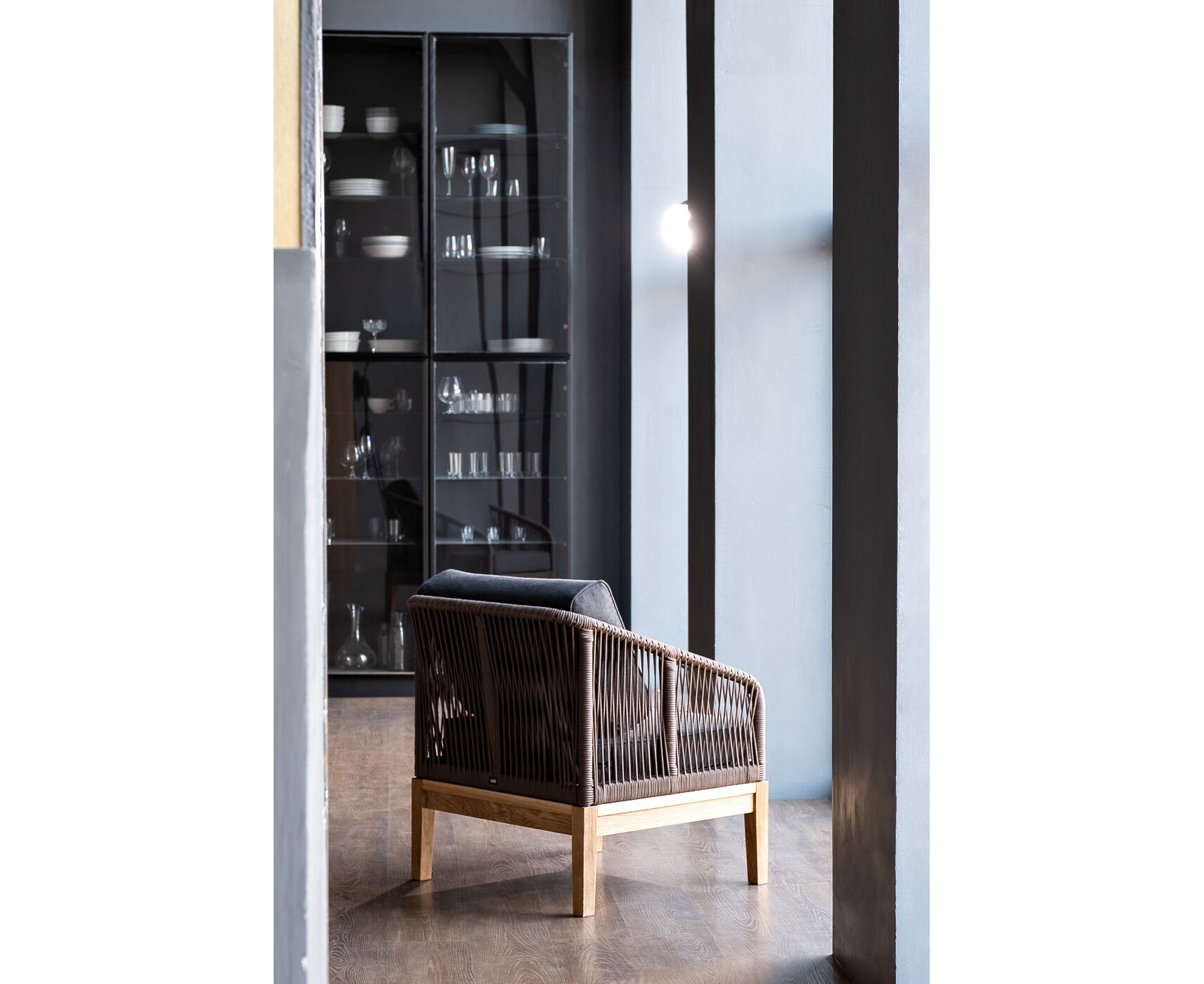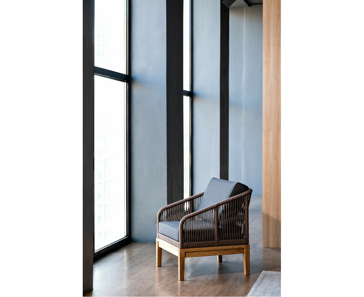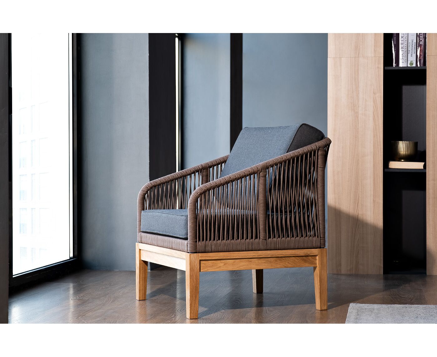 "Канны" кресло плетеное из роупа, основание дуб, роуп коричневый круглый, ткань темно-серая 027