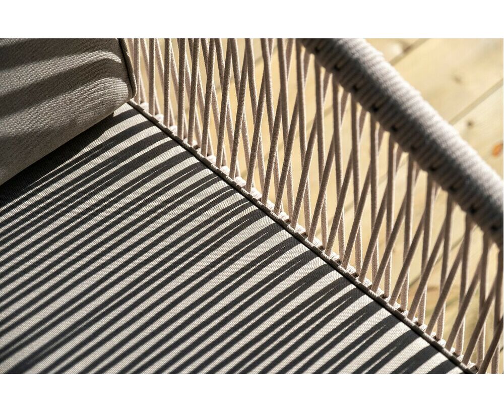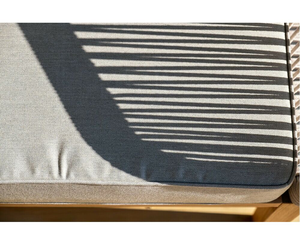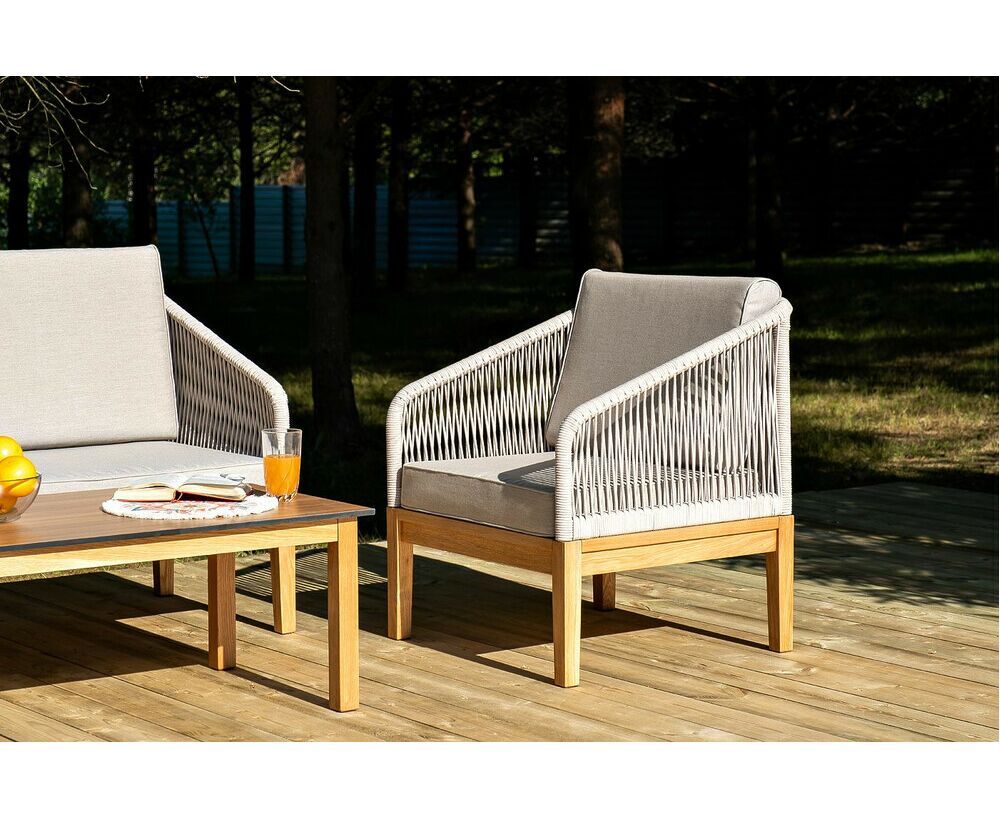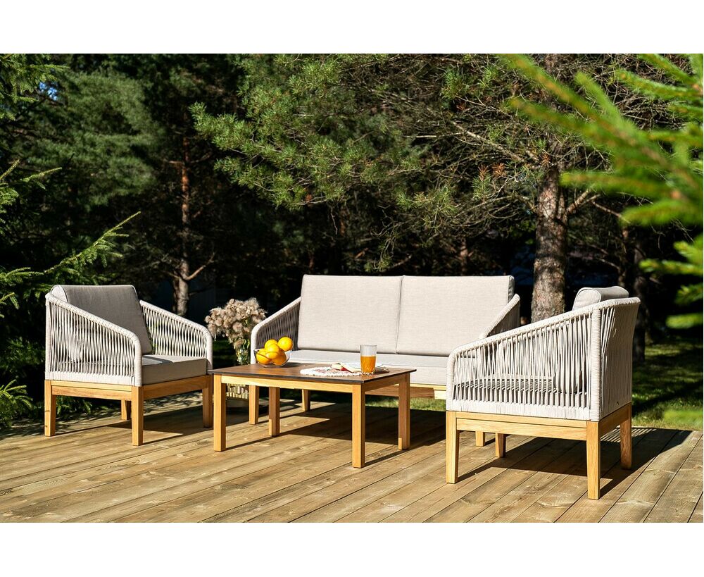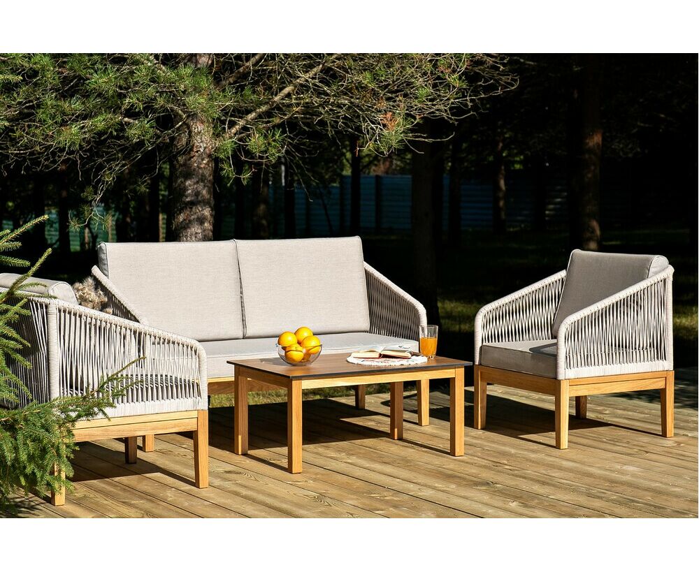 Каркас уличной мебели выполнен из дуба. Его дополняет бежевая оплетка, изготовленная на основе эластичных синтетических лент из полиэфирных волокон высокой прочности.