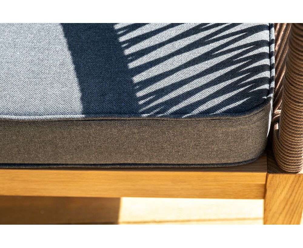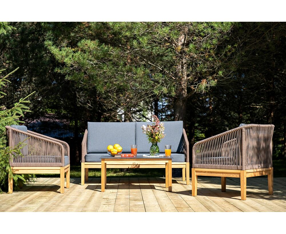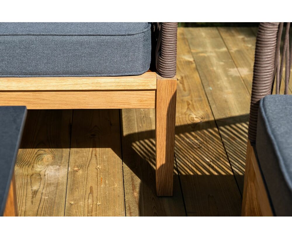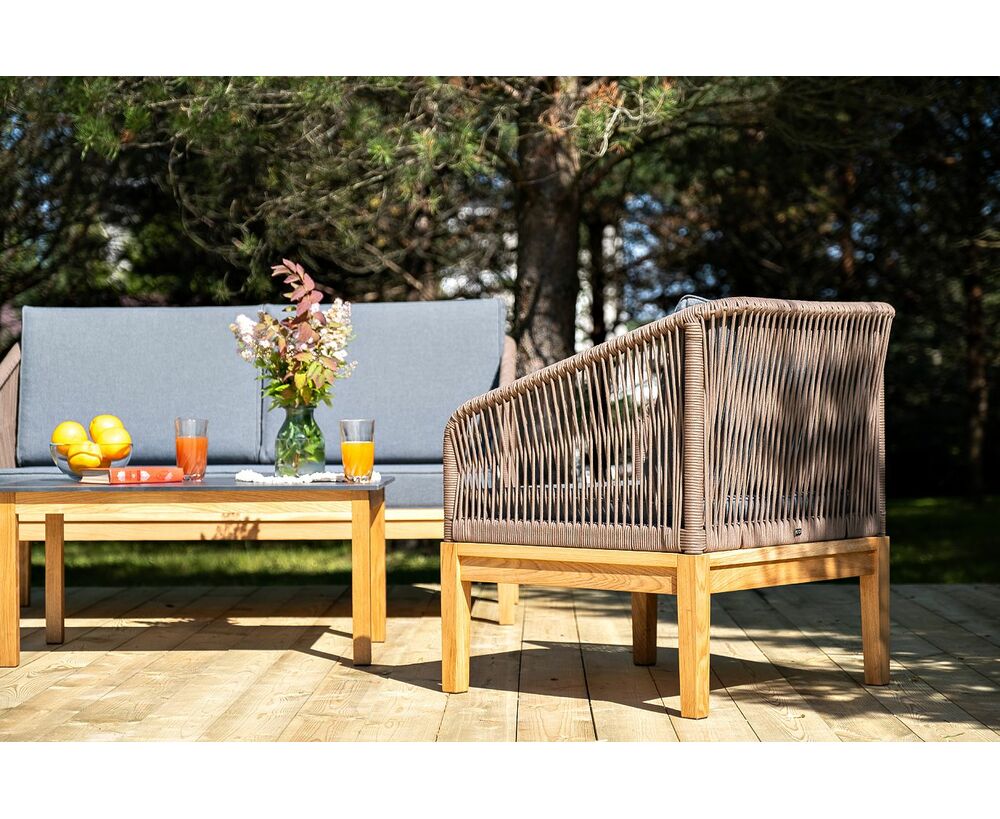 Каркас уличной мебели выполнен из дуба. Его дополняет коричневая оплетка, изготовленная на основе эластичных синтетических лент из полиэфирных волокон высокой прочности.
