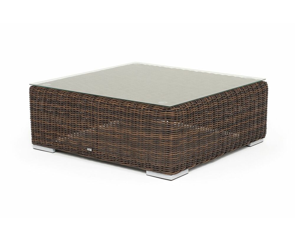 Размер модели – 950×950×350 мм. Ее каркас сделан из высокопрочного алюминия, который оплетен искусственным ротангом с помощью ручного круглого плетения. Столик представлен в коричневом цвете.