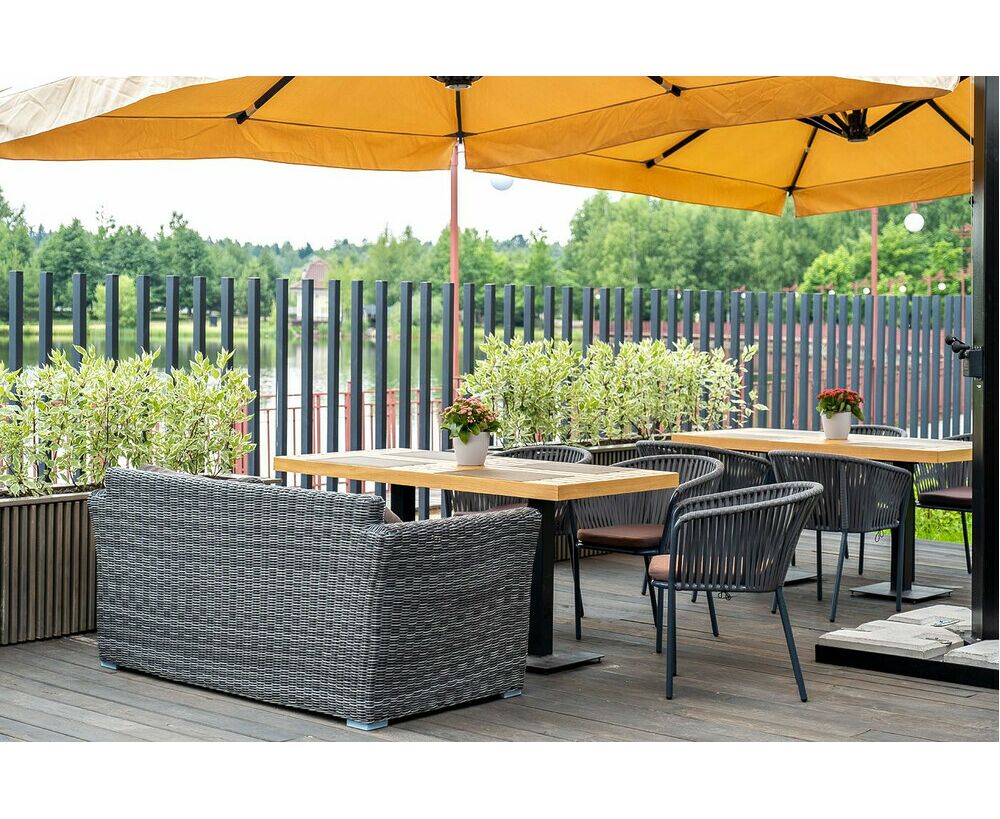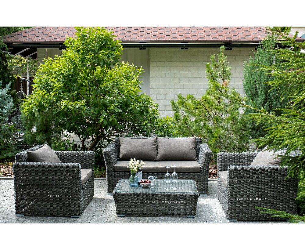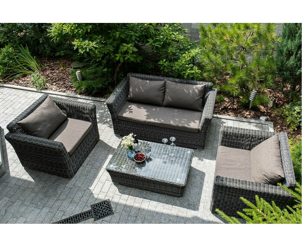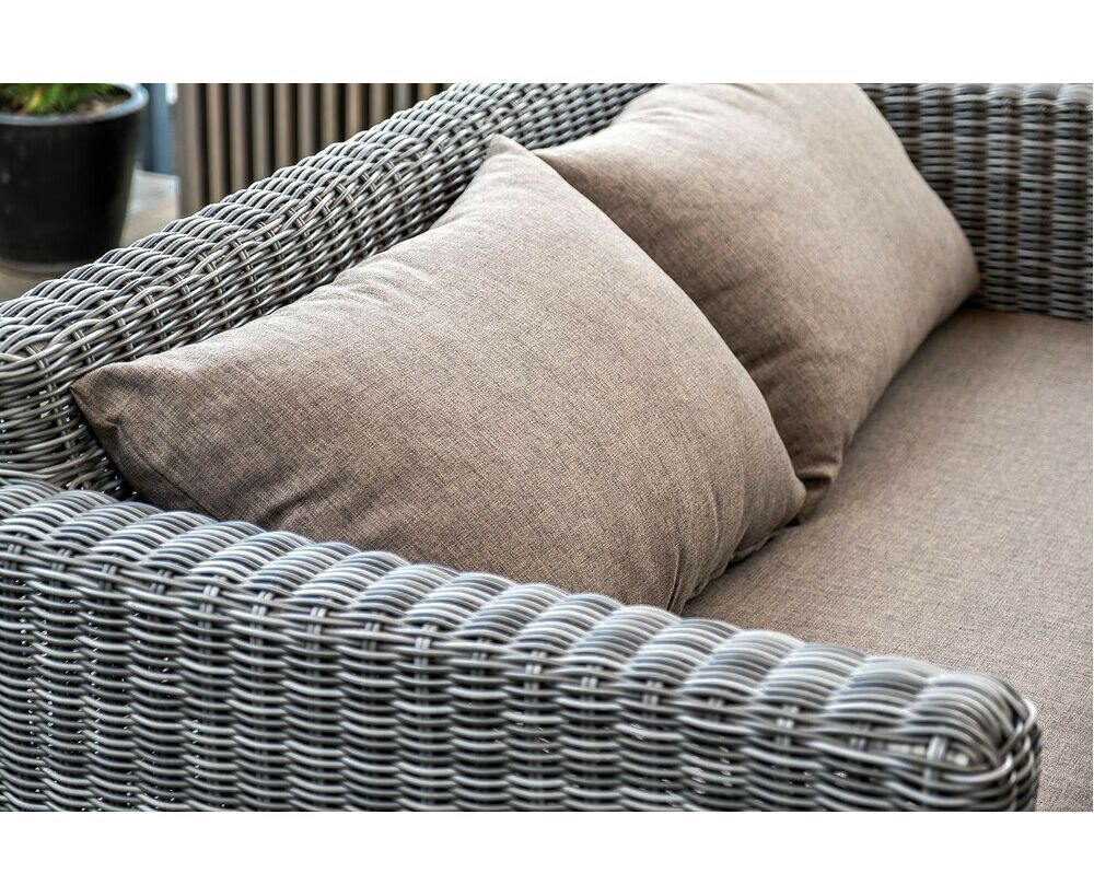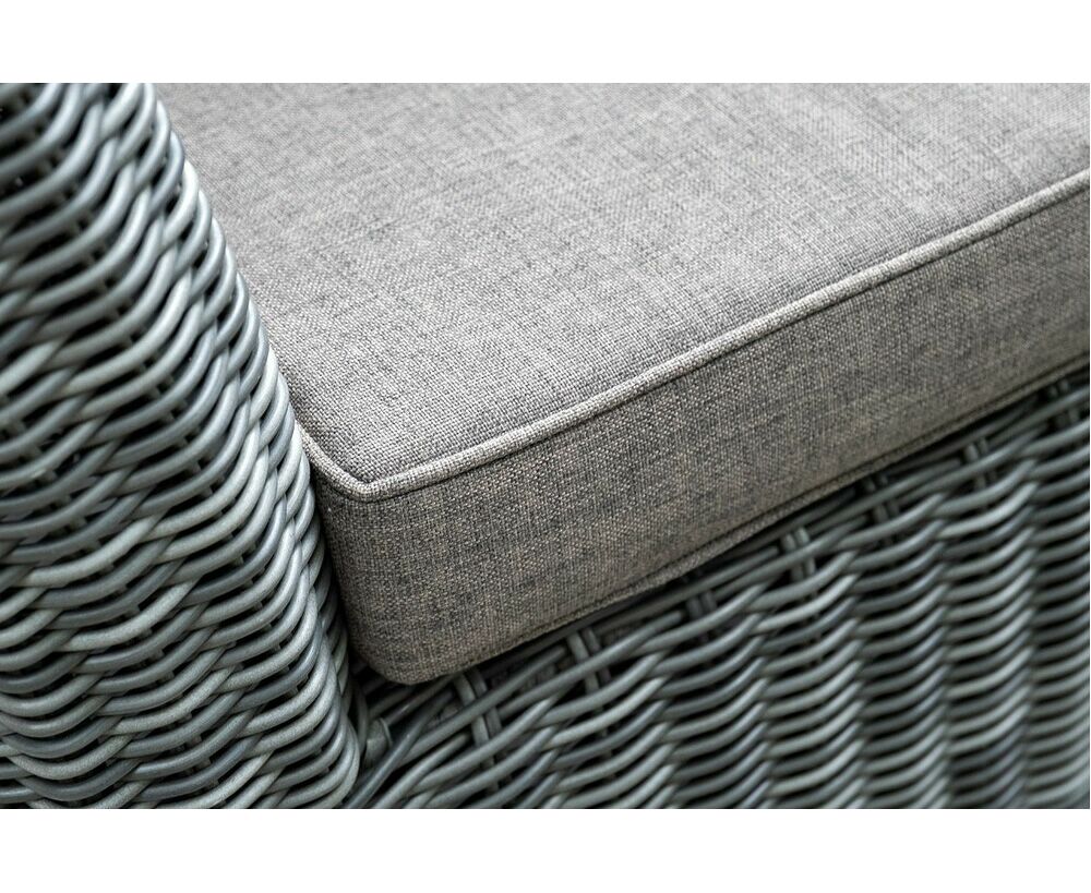 Диван выполнен из круглого искусственного ротанга графитового цвета, оплетенного вручную.