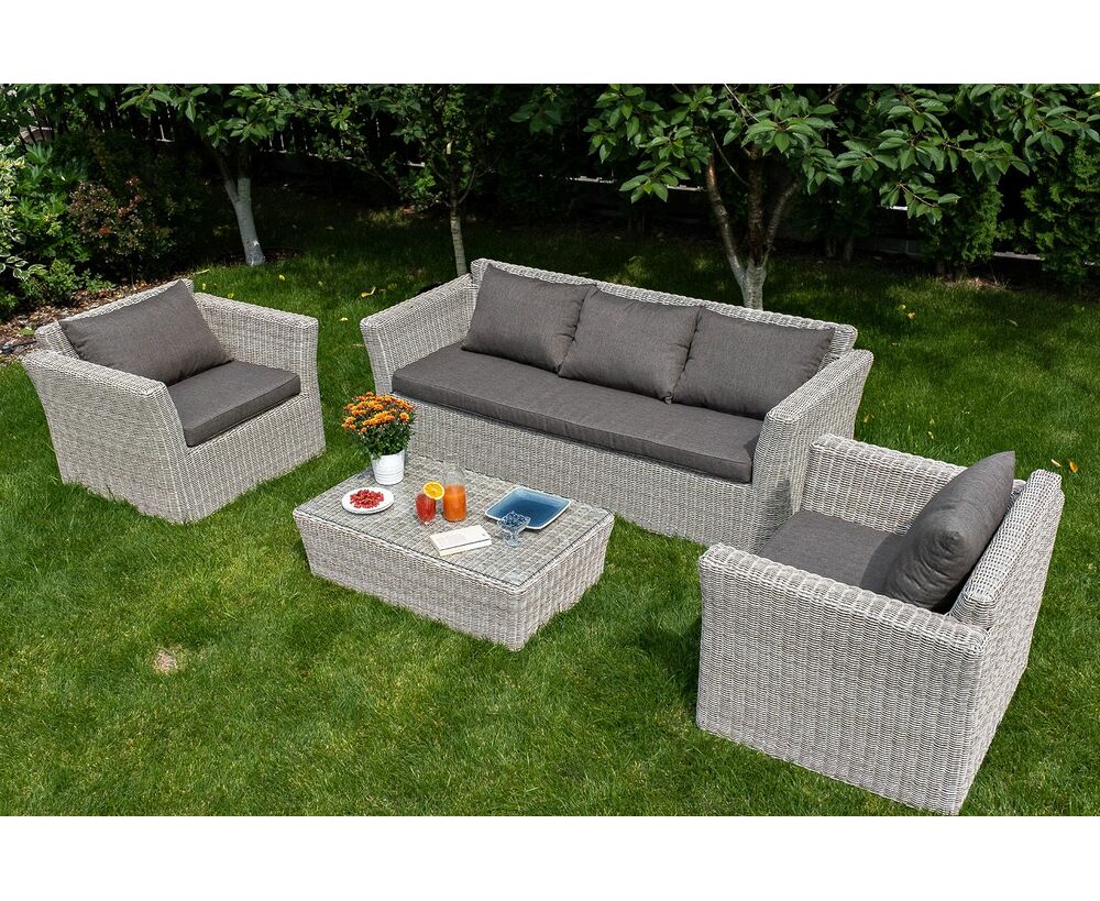 Размеры модели: 2220×865×815 мм, которые позволяют разместить трех человек. Подушки, входящие в комплект, выполнены из высококачественного полиэстера с влагоотталкивающей пропиткой.