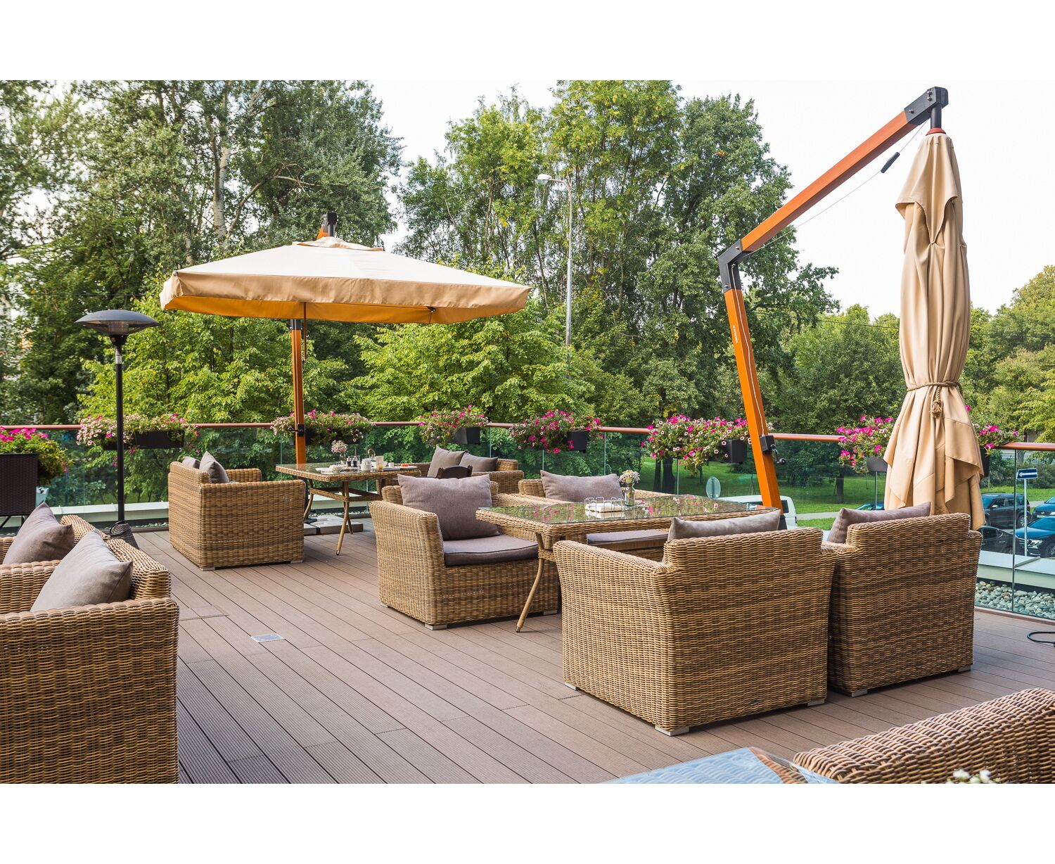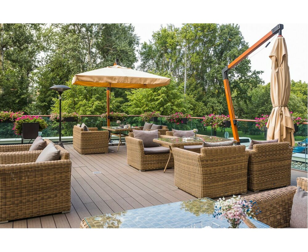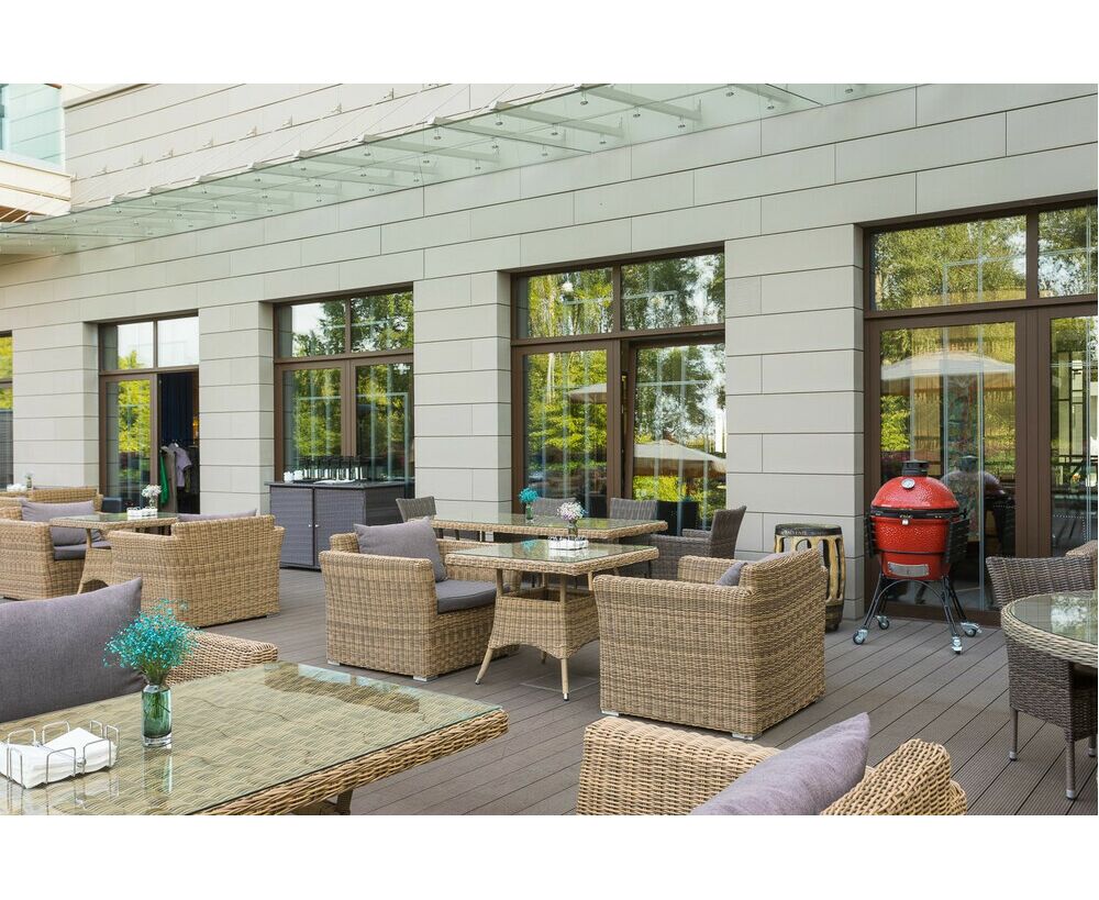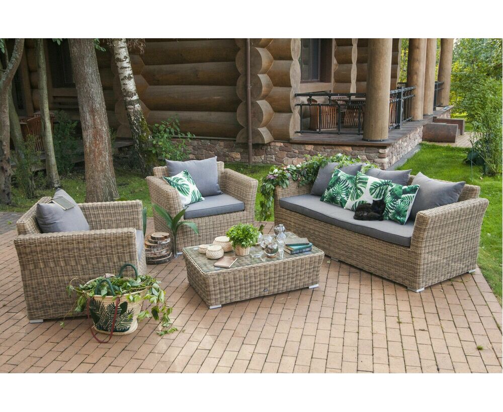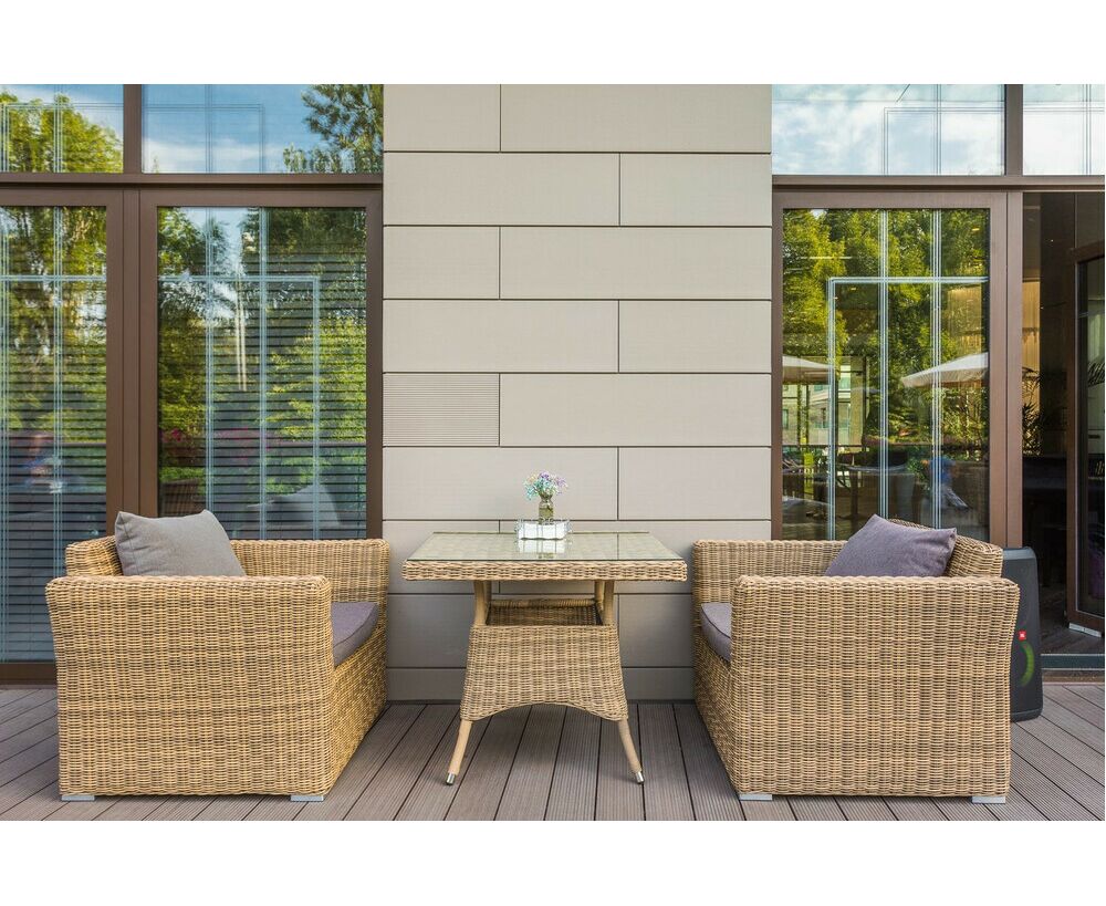 Ее отличает алюминиевый каркас высокой прочности. В качестве декоративной составляющей выступает ручное плетение на основе круглого искусственного ротанга. Оно выполнено в соломенном оттенке.