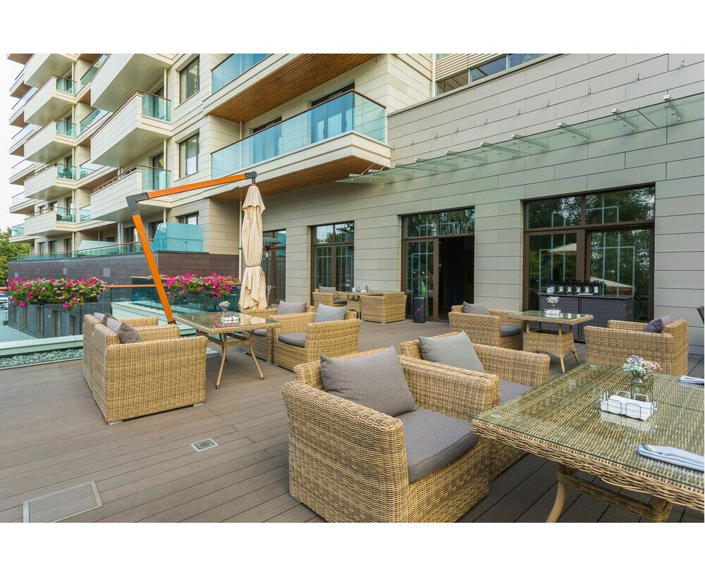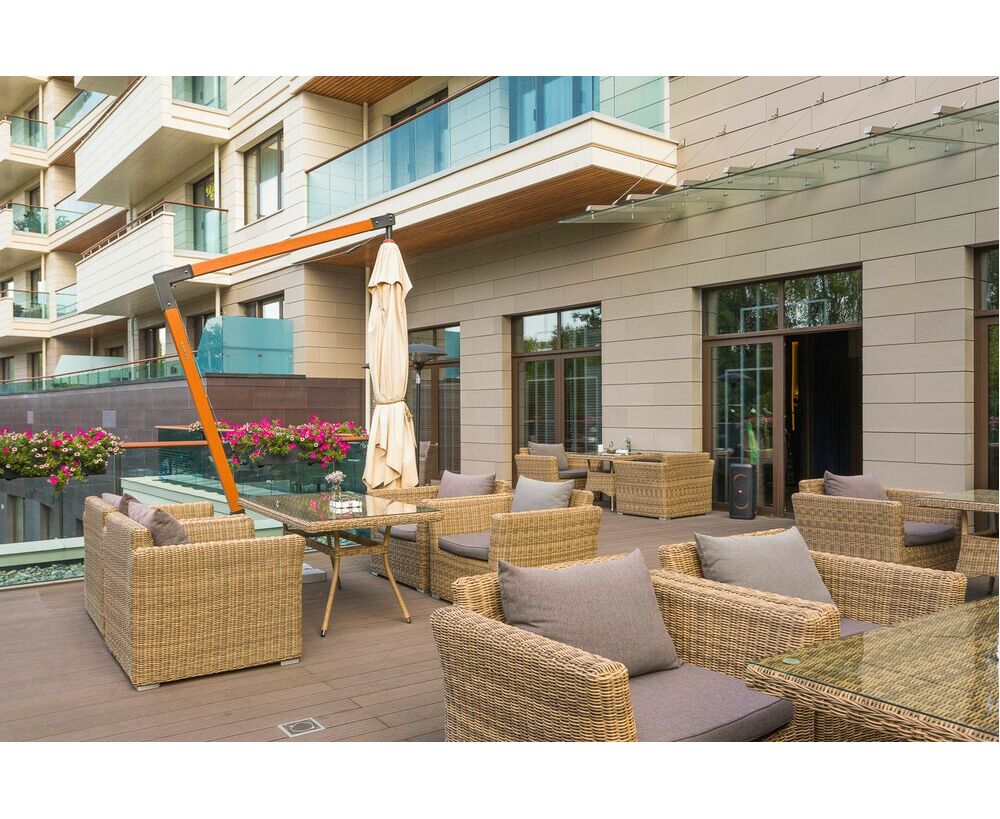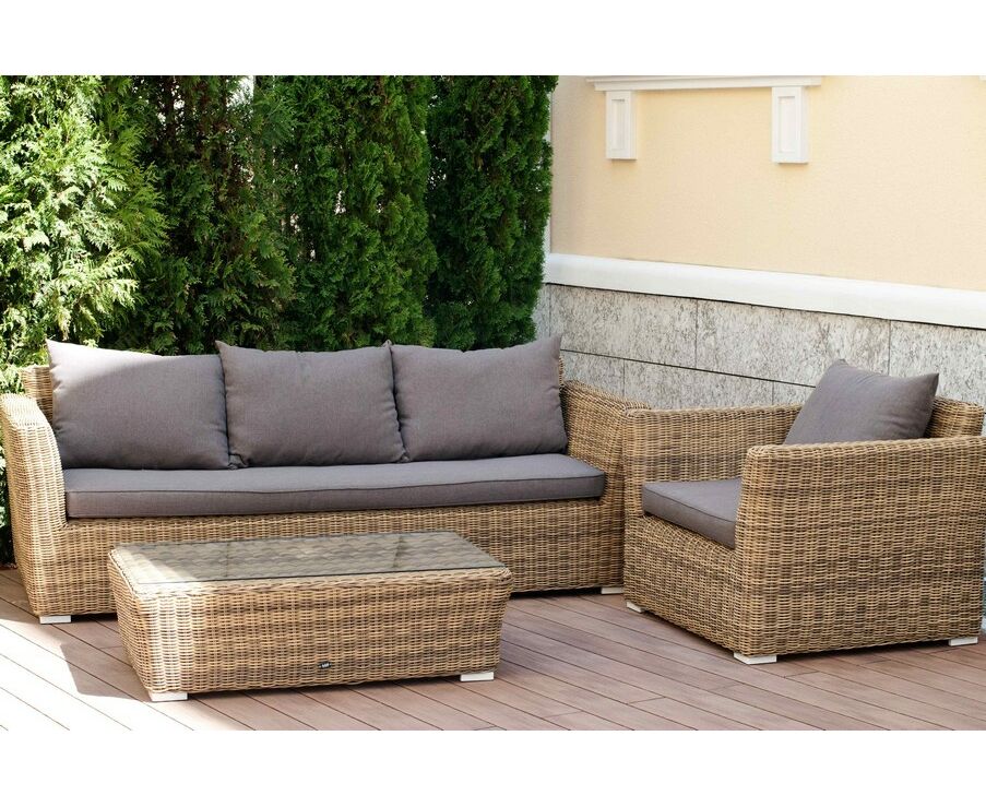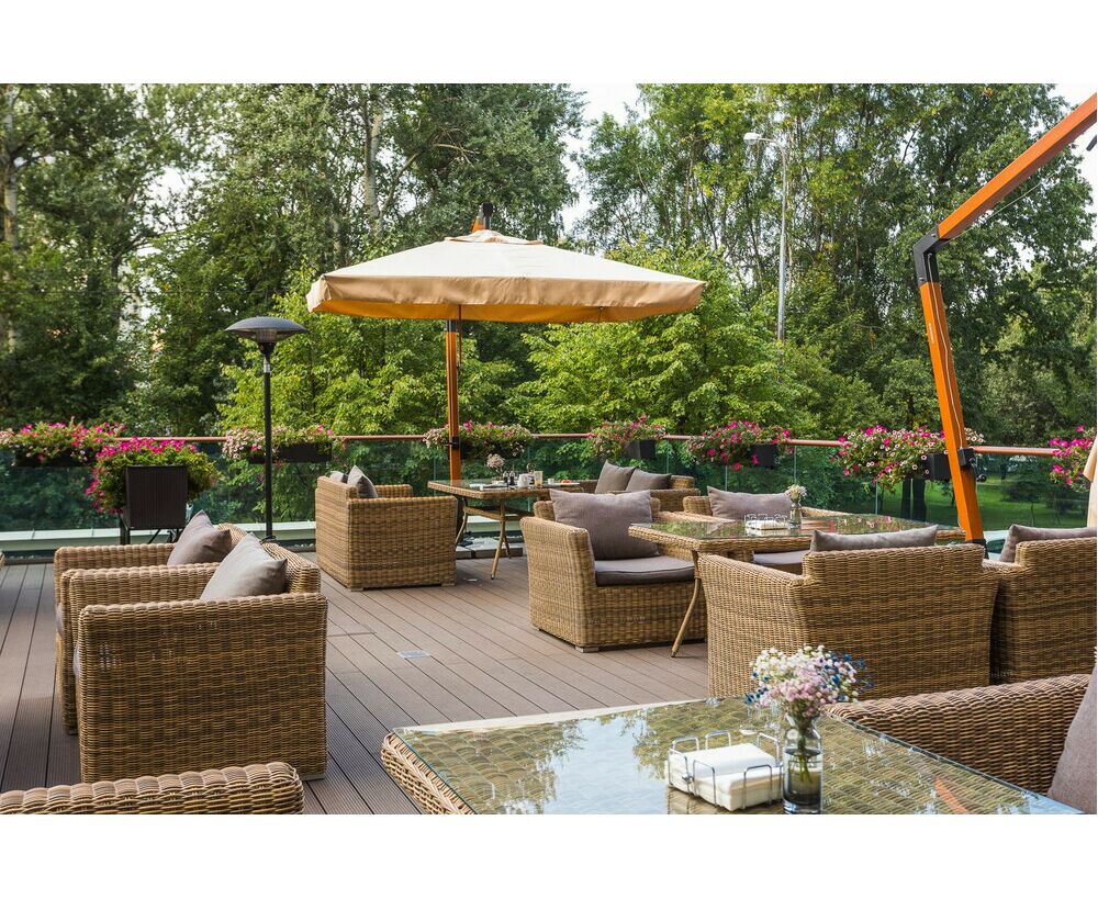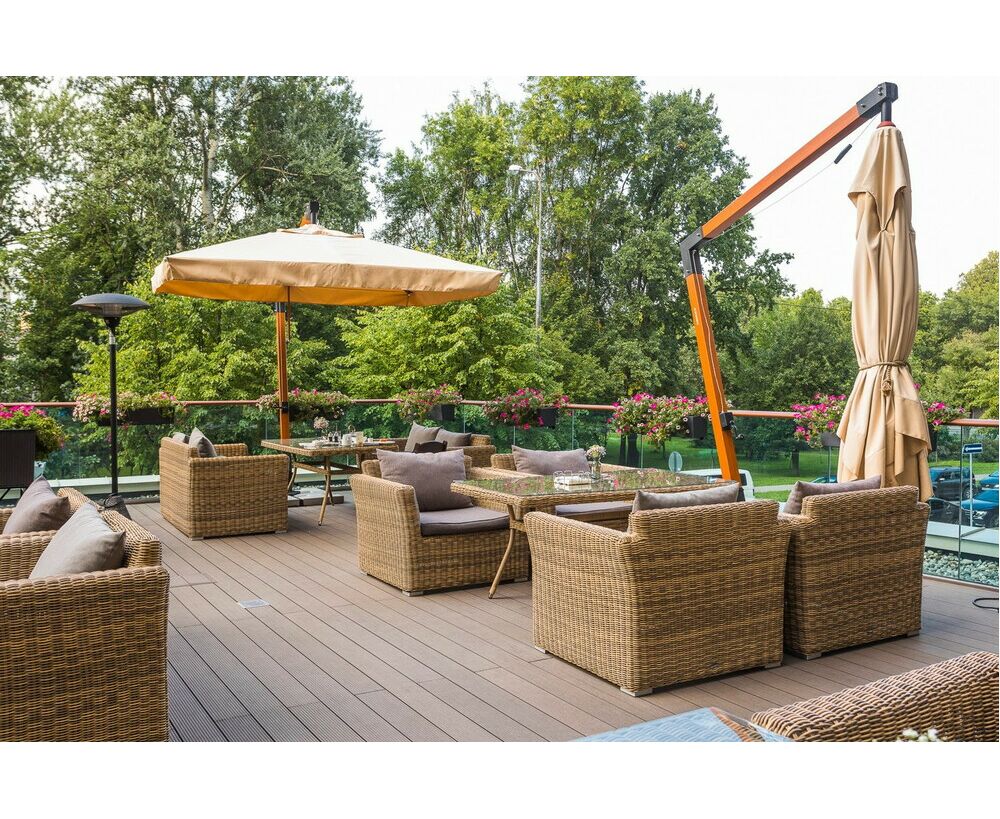 Ее отличает алюминиевый каркас высокой прочности. В качестве декоративной составляющей выступает ручное плетение на основе круглого искусственного ротанга. Оно выполнено в соломенном оттенке.