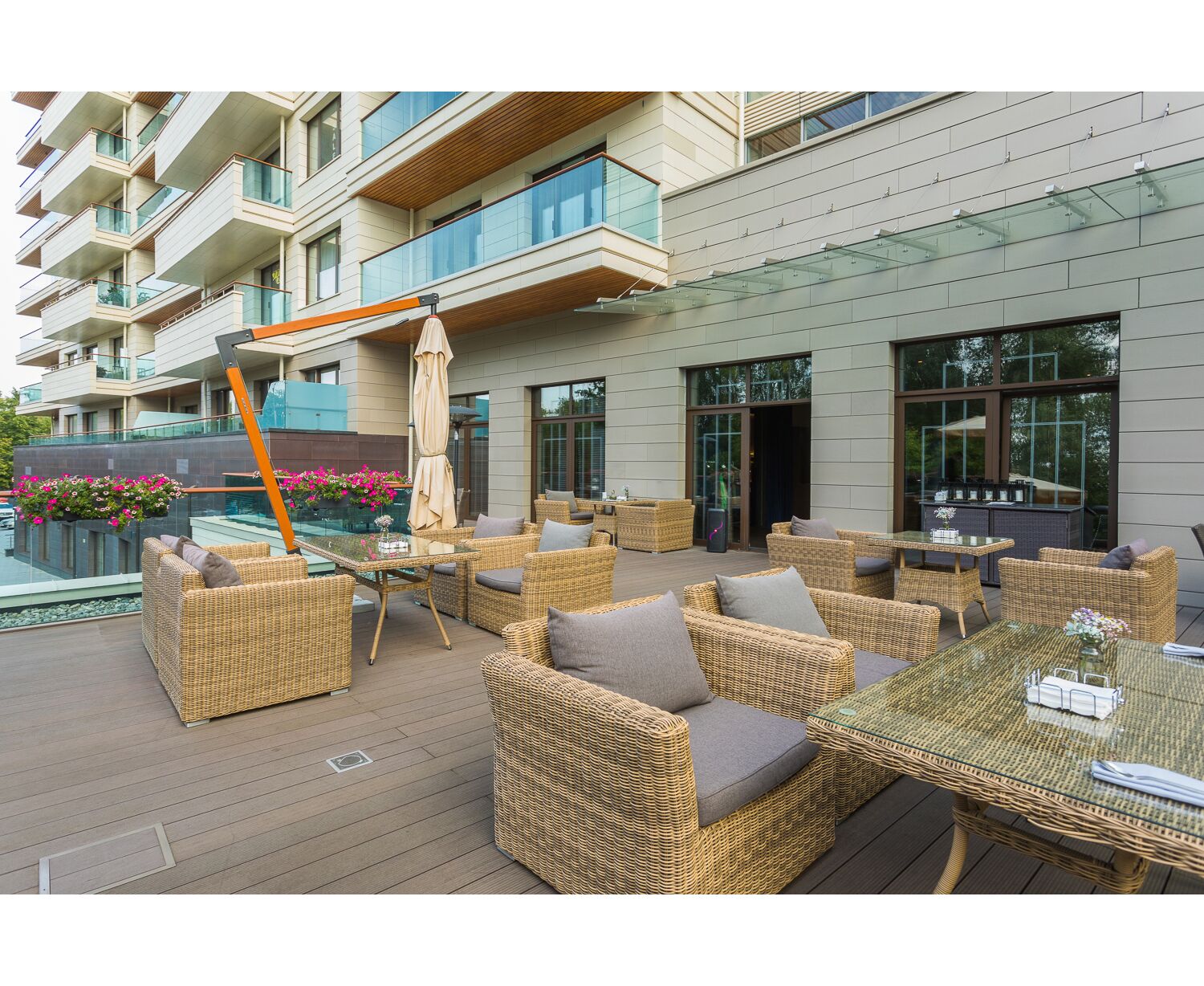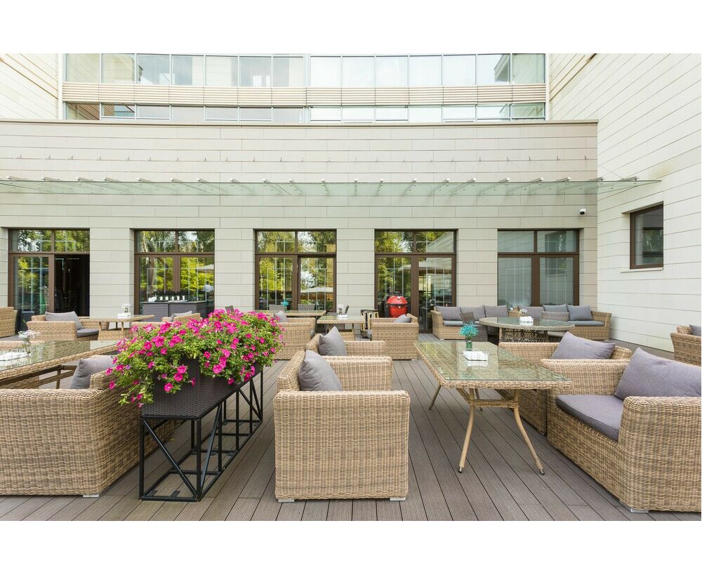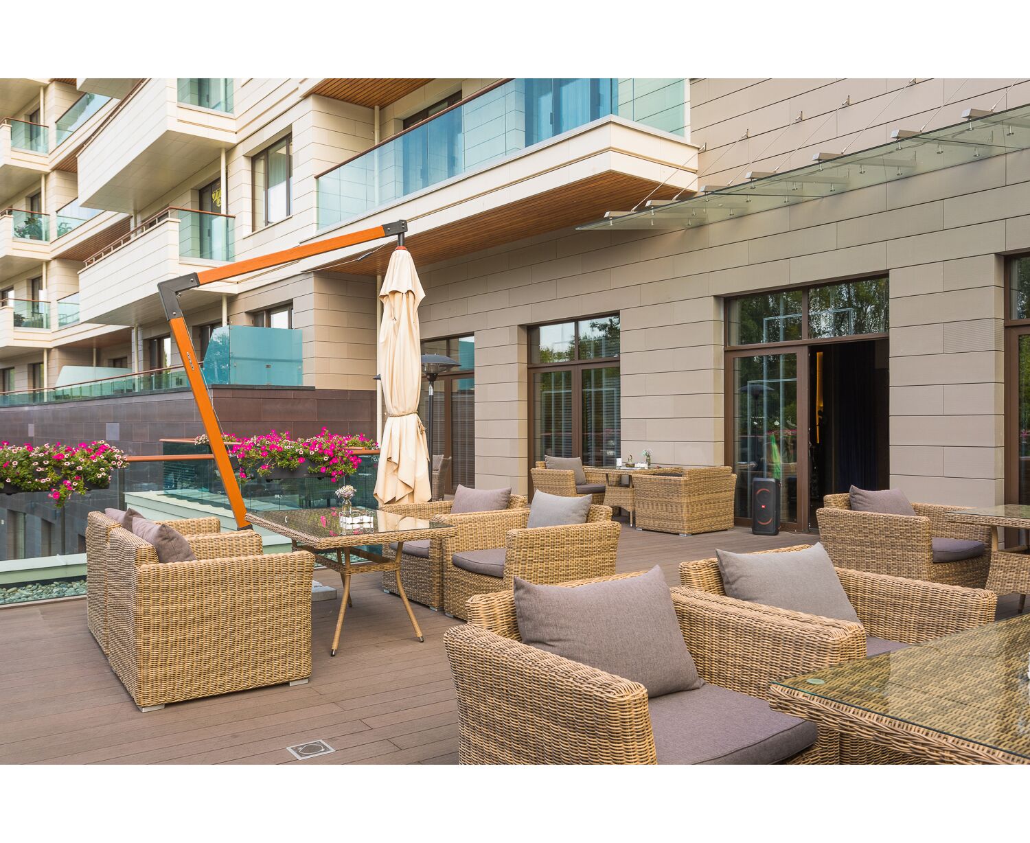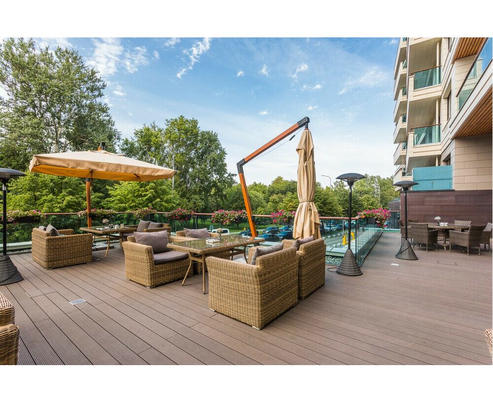 Ее отличает алюминиевый каркас высокой прочности. В качестве декоративной составляющей выступает ручное плетение на основе круглого искусственного ротанга. Оно выполнено в соломенном оттенке.