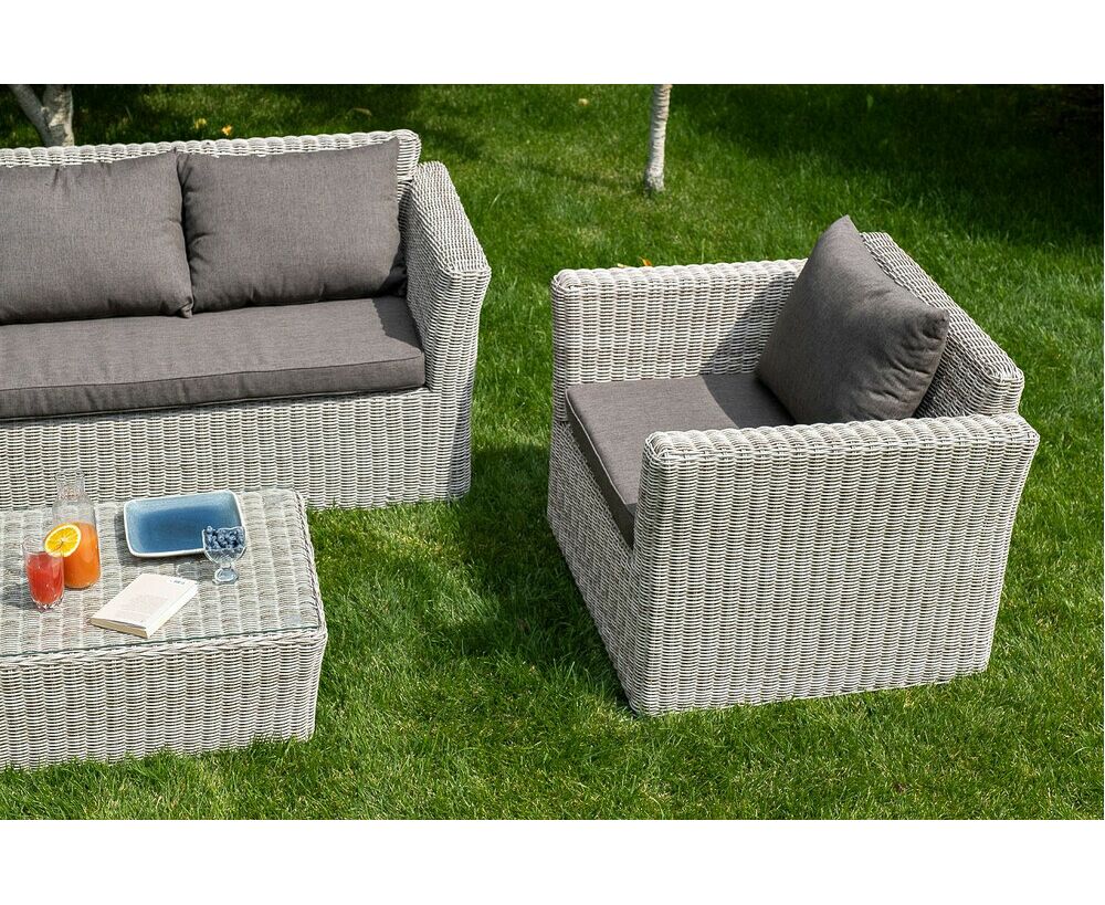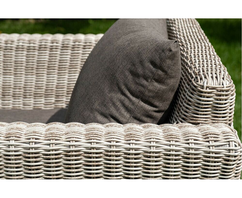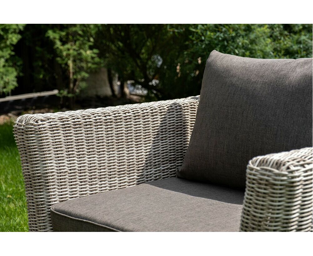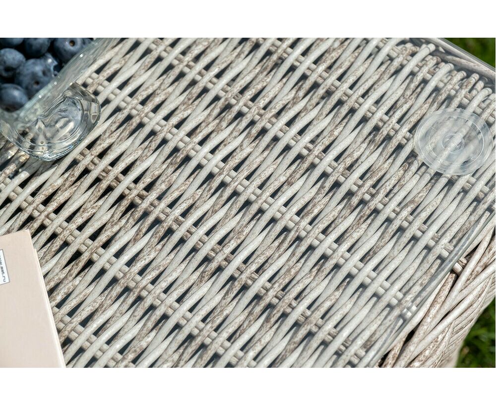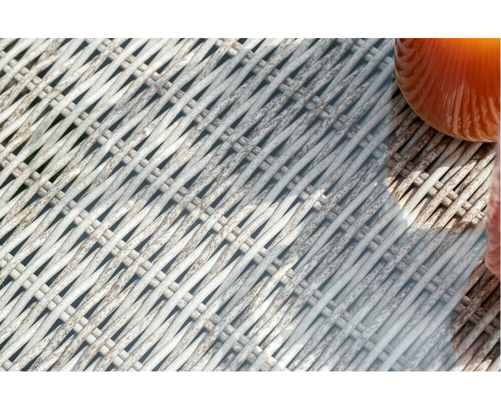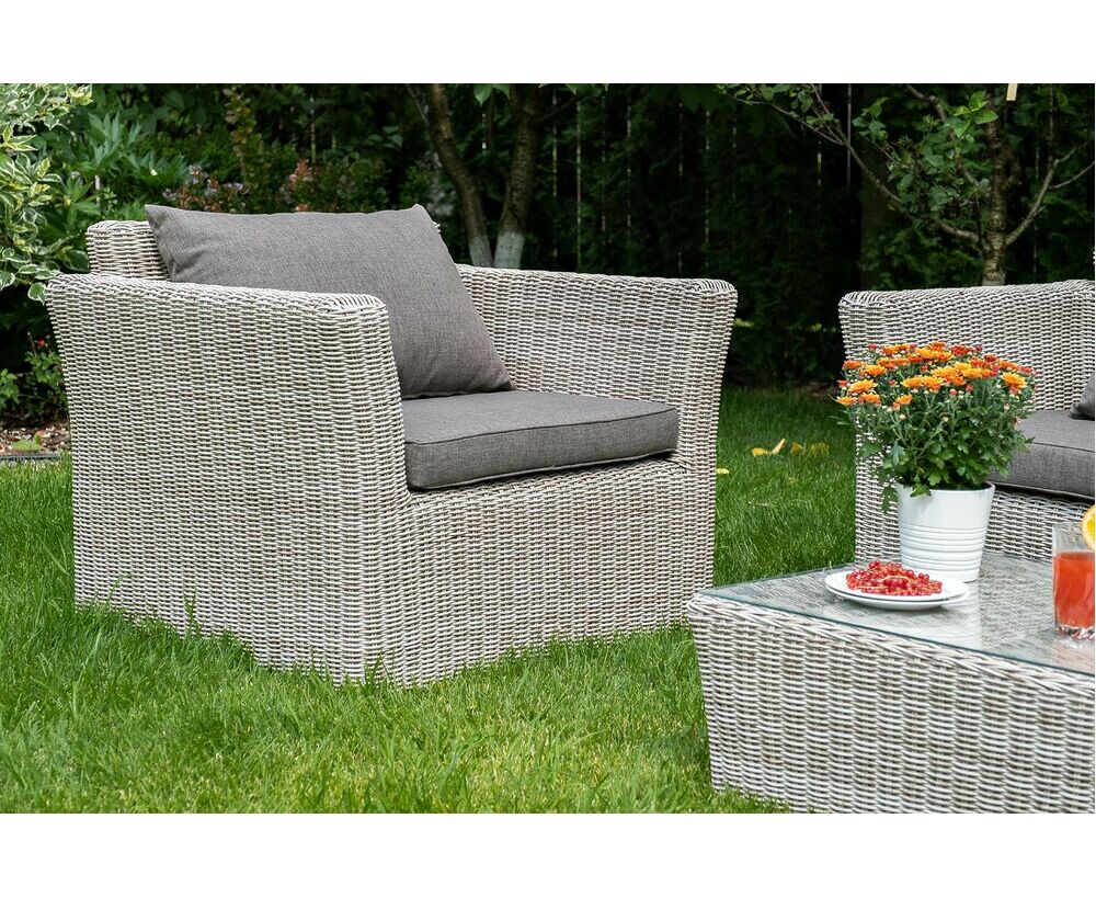 Из алюминия сделан устойчивый каркас мебели. Ее поверхность дополнена искусственным ротангом, из которого сделано ручное плетение, цвет бежевый.