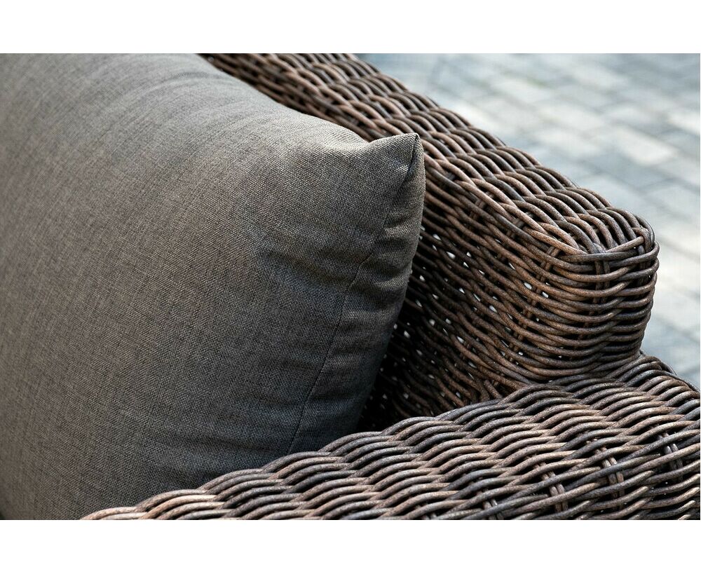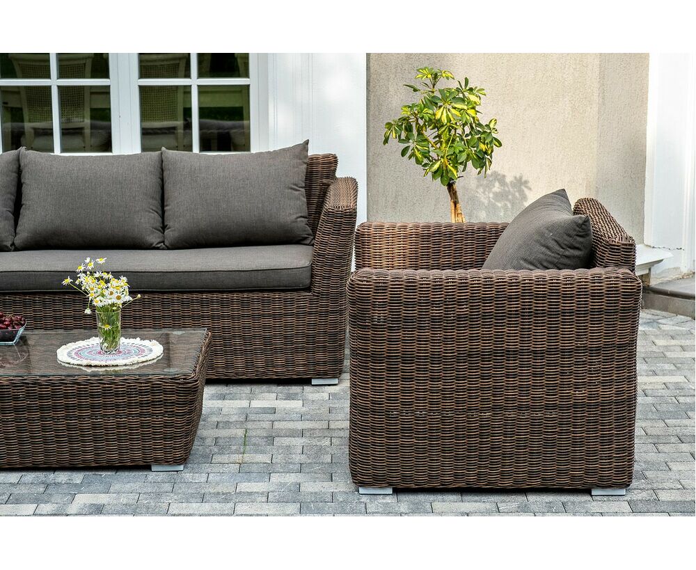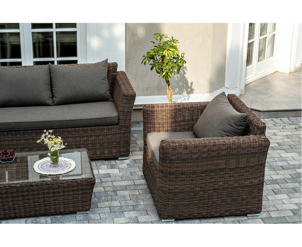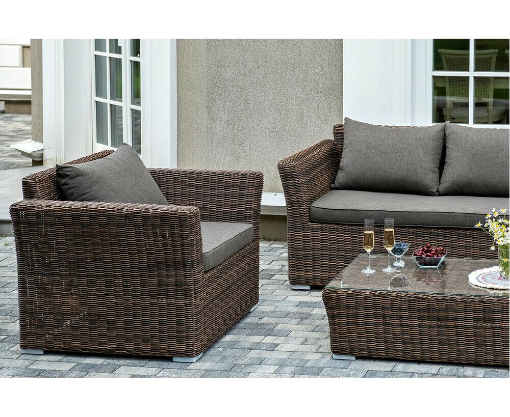 В качестве основы применяется алюминиевый каркас. Из круглого искусственного ротанга сделана ручная оплетка. Цвет комплекта – коричневый.