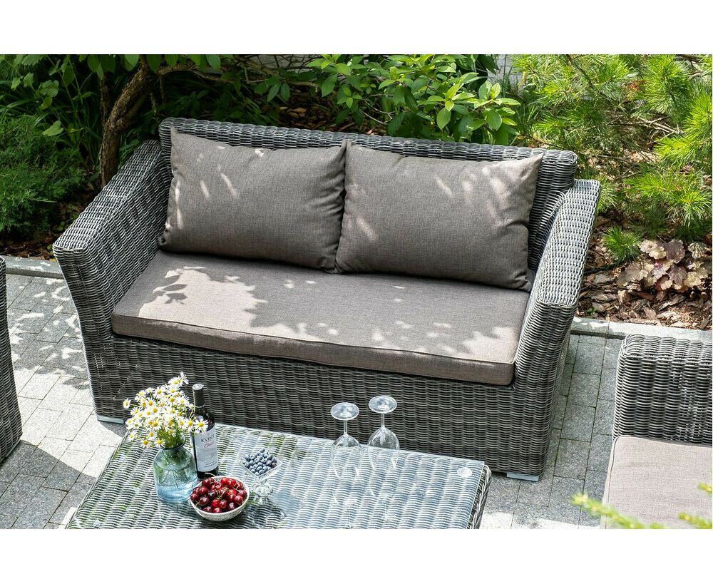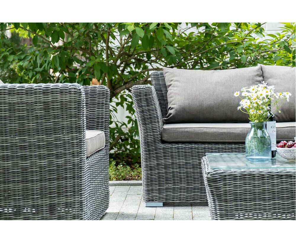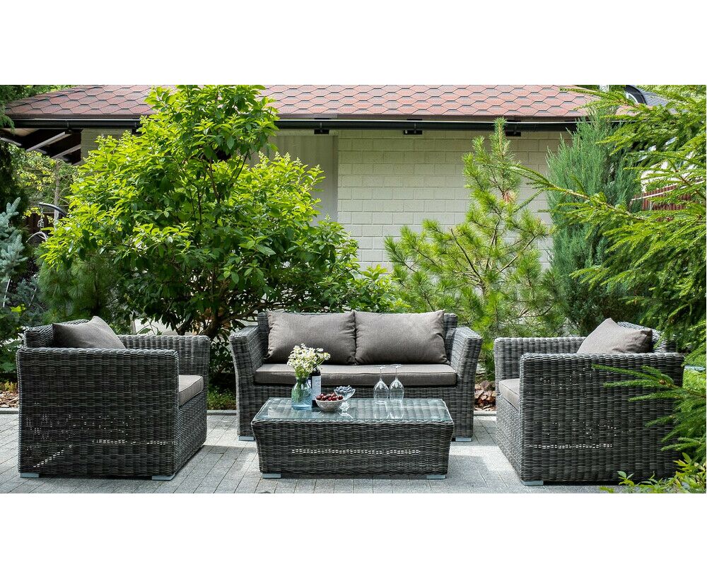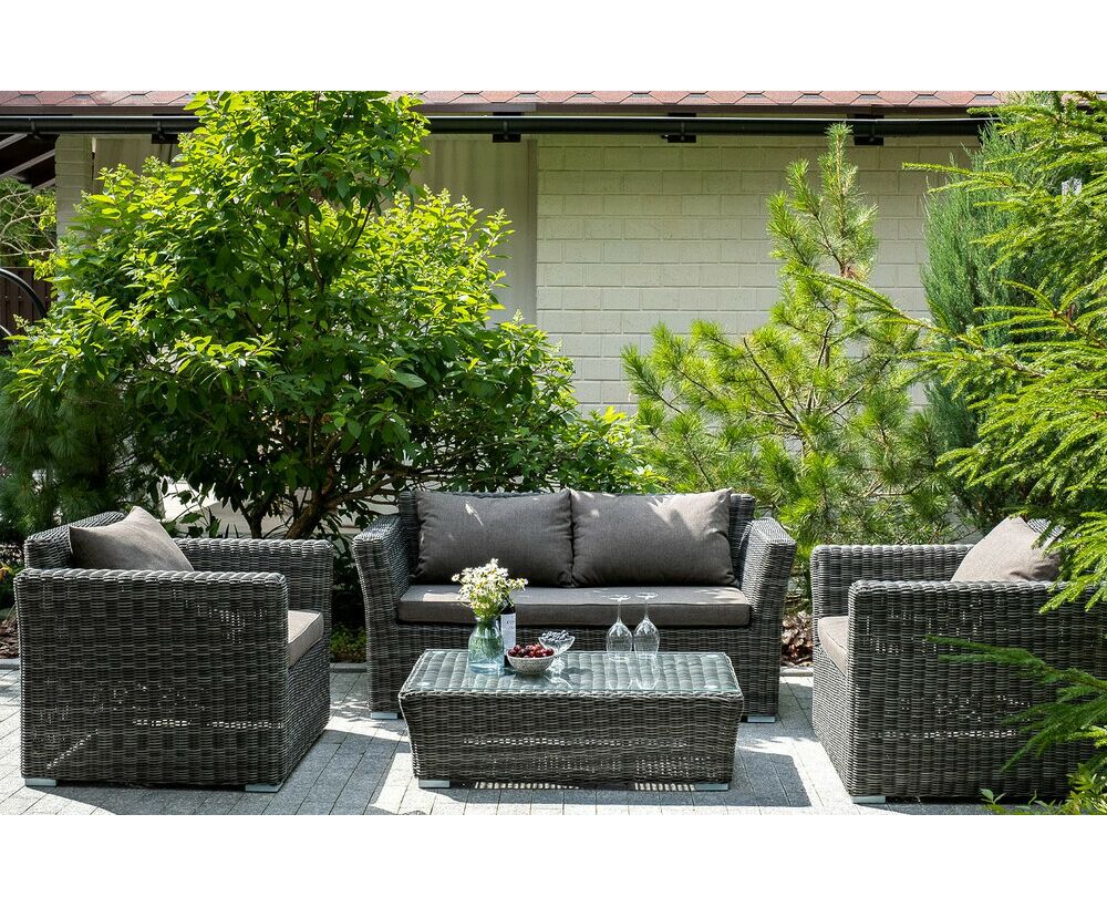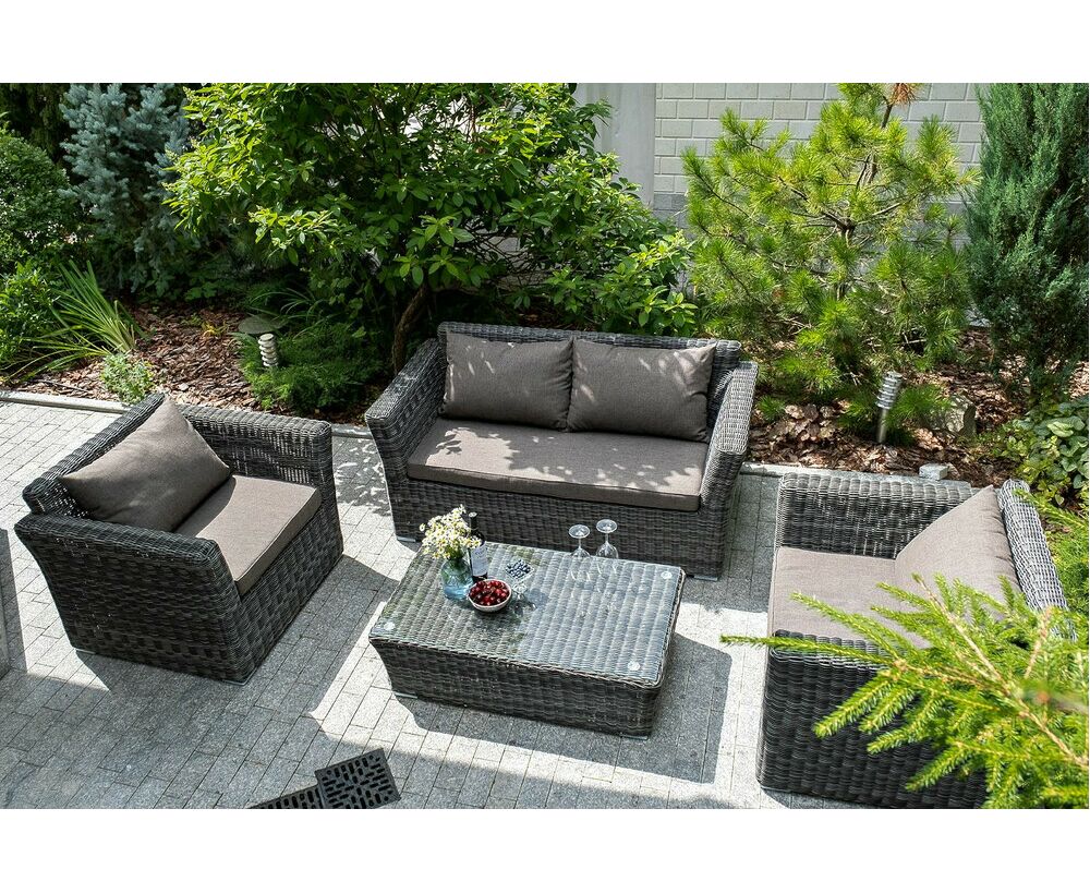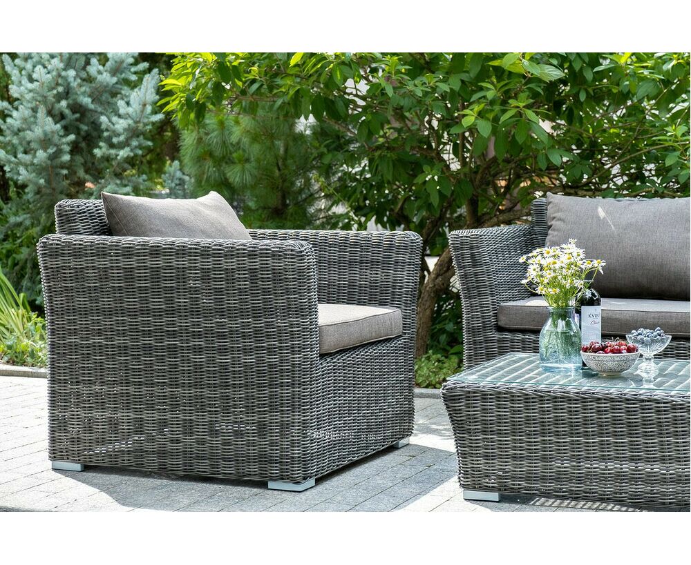 Прочный алюминиевый каркас усиливает устойчивость мебели. Его дополняет плетение в цвете "графит", которое представлено из круглого искусственного ротанга.