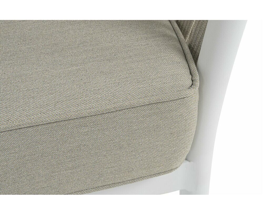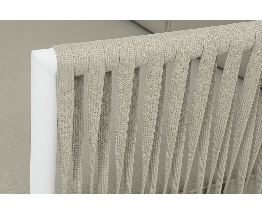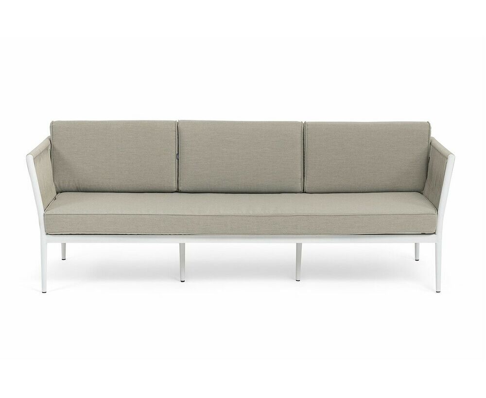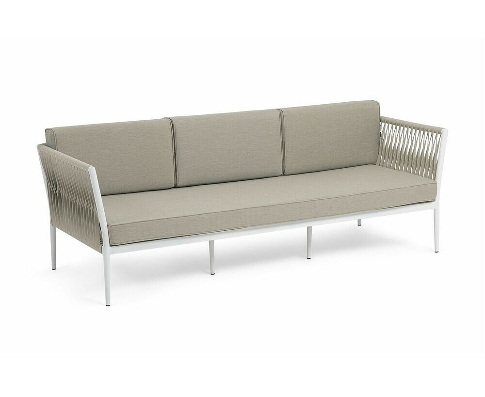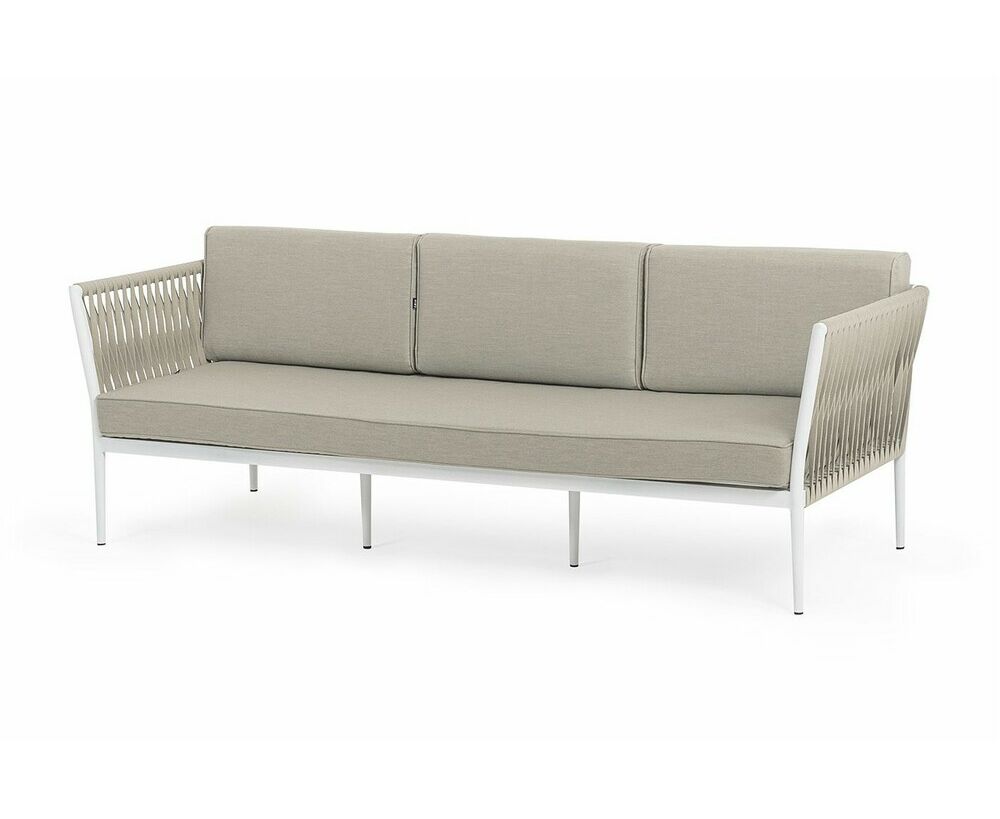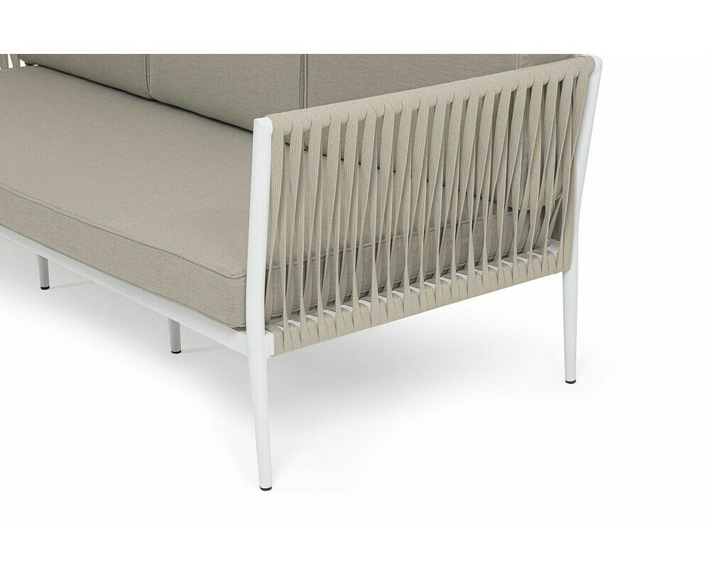 "Касабланка" диван 3-местный плетеный из роупа, каркас алюминий белый муар, роуп бежевый 20мм, ткань бежевая 052