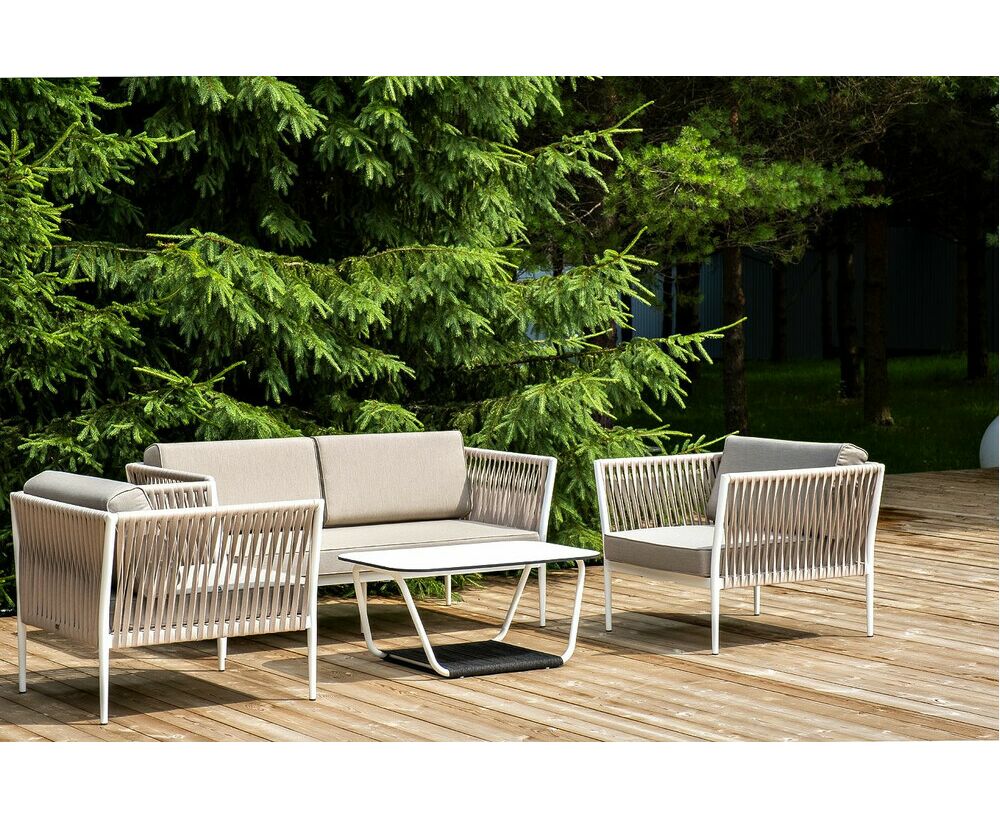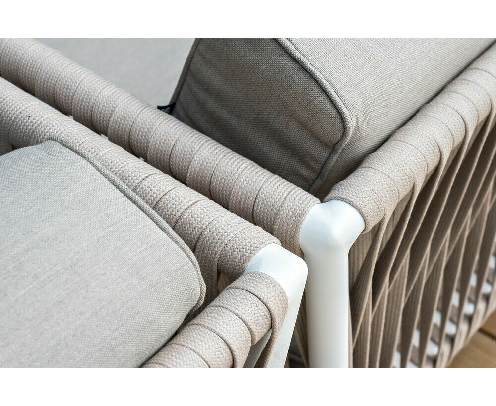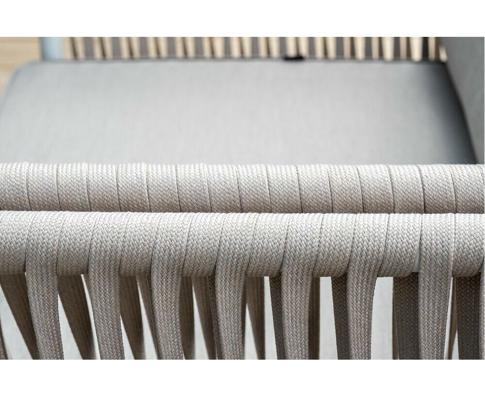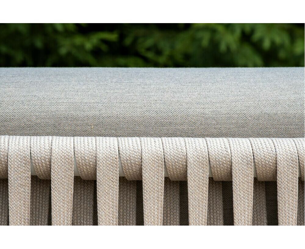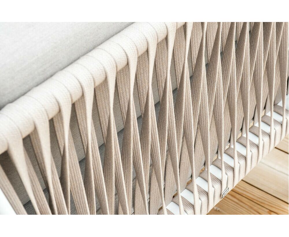 Диван и кресла изготовлены их алюминиевого прочного каркаса, оплетенного ручным способом роупом серо-коричневого цвета. Это эластичные ленты из полиэфирных волокон высокого качества.