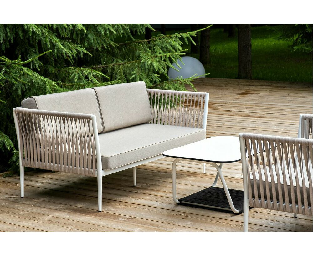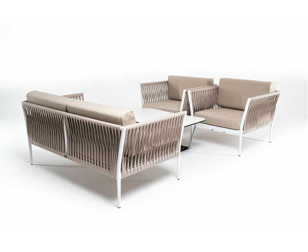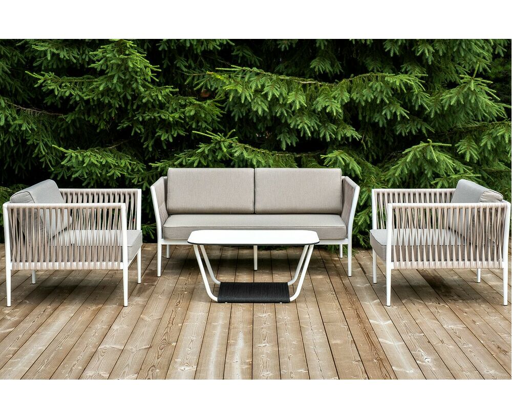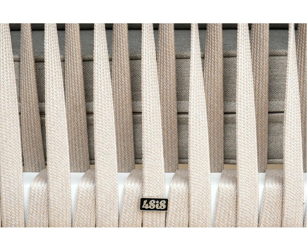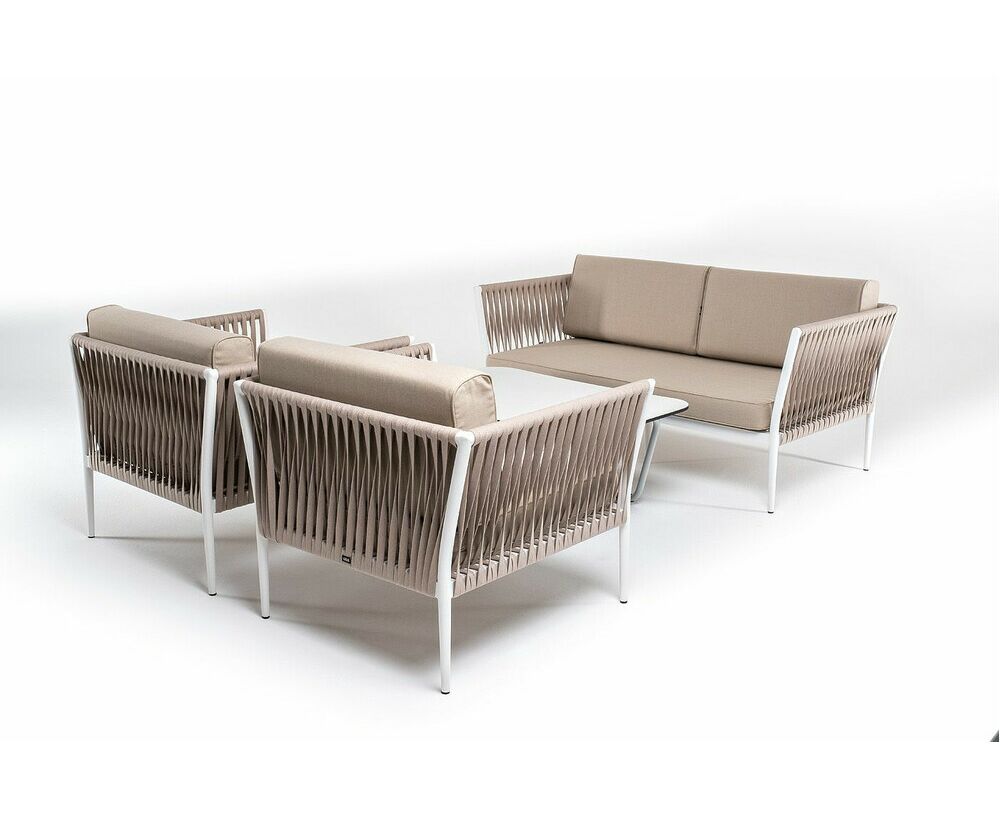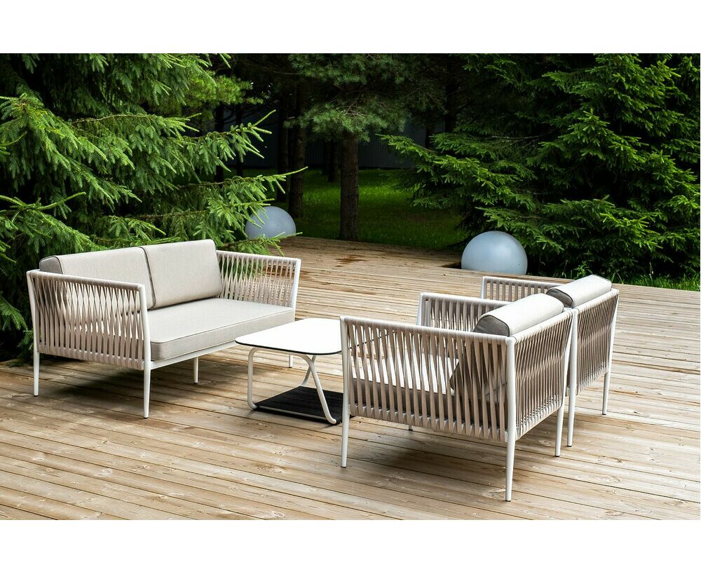 Диван и кресла изготовлены их алюминиевого прочного каркаса, оплетенного ручным способом роупом серо-коричневого цвета. Это эластичные ленты из полиэфирных волокон высокого качества.