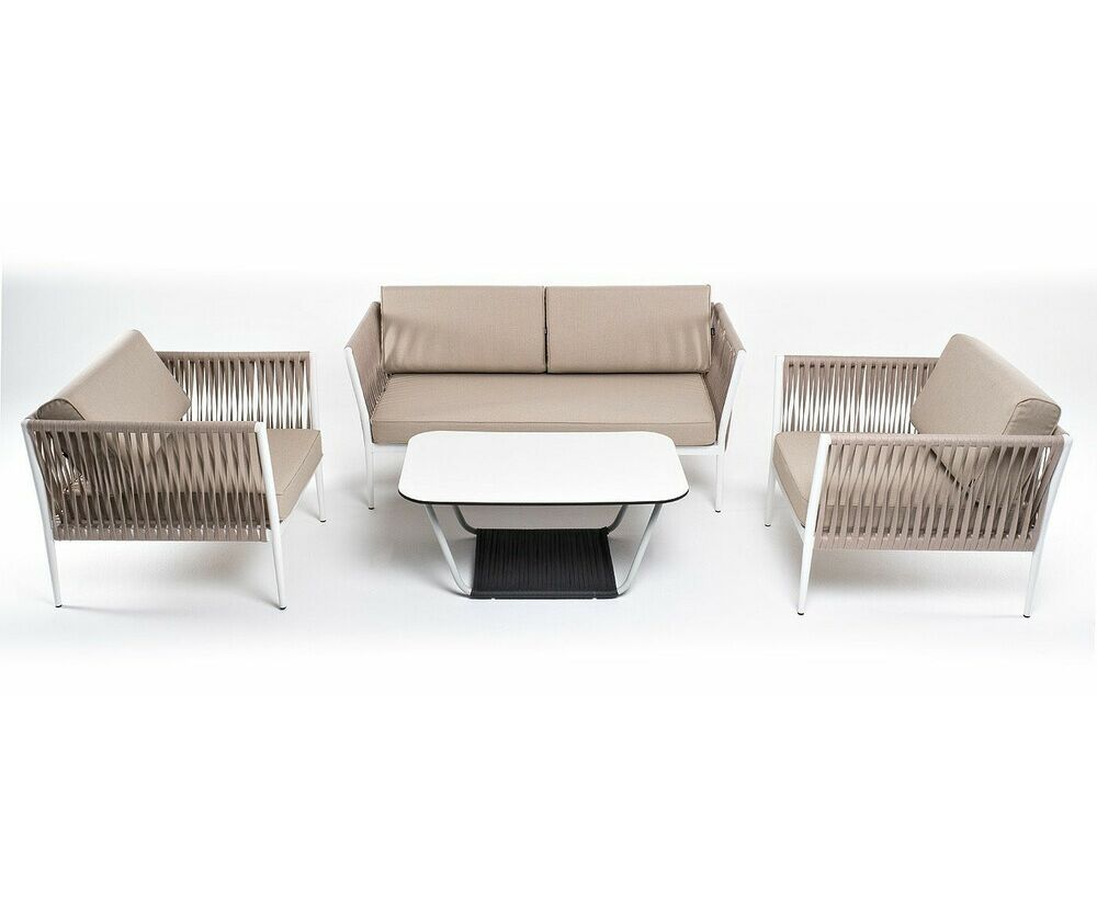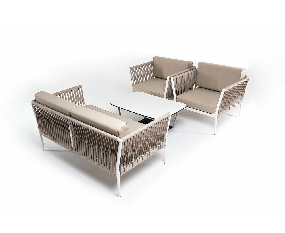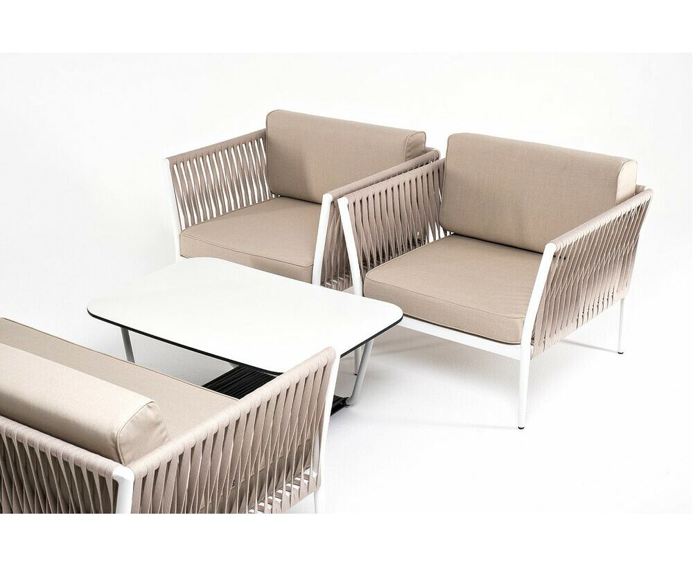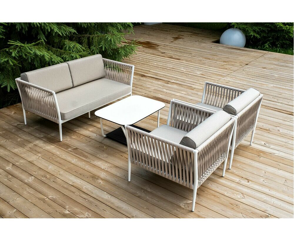 Журнальный столик также имеет алюминиевый каркас белого цвета. Столешница выполнена из монолитного компакт-пластика HPL молочного оттенка. Нижняя часть столика задекорирована роупом серого цвета и представляет дополнительную полку для хранения. "Касабланка" диван 2-местный плетеный из роупа, каркас алюминий белый муар, роуп бежевый 20мм, ткань бежевая 035 1шт. 1 600Х800Х695, "Касабланка" кресло плетеное из роупа, каркас алюминий белый муар, роуп бежевый 20мм, ткань бежевая 035 2шт. 900Х800Х695, "Глория" журнальный стол 100х65см из HPL, цвет молочный 1шт. 1 000Х650Х420,