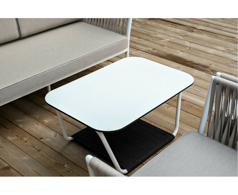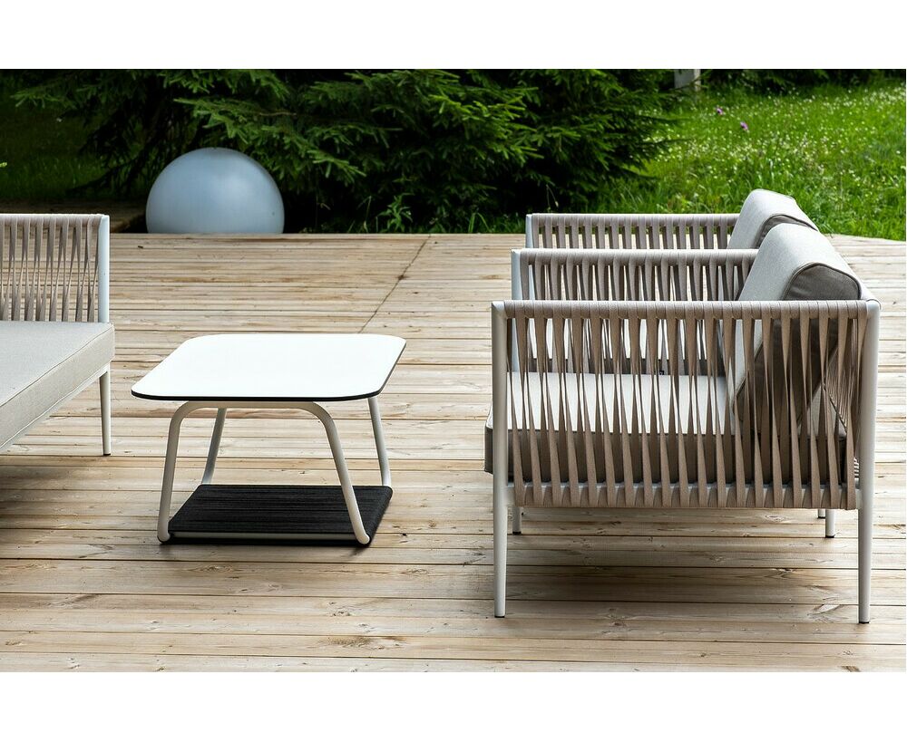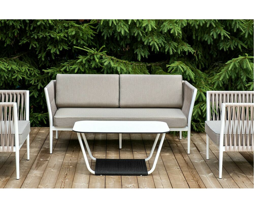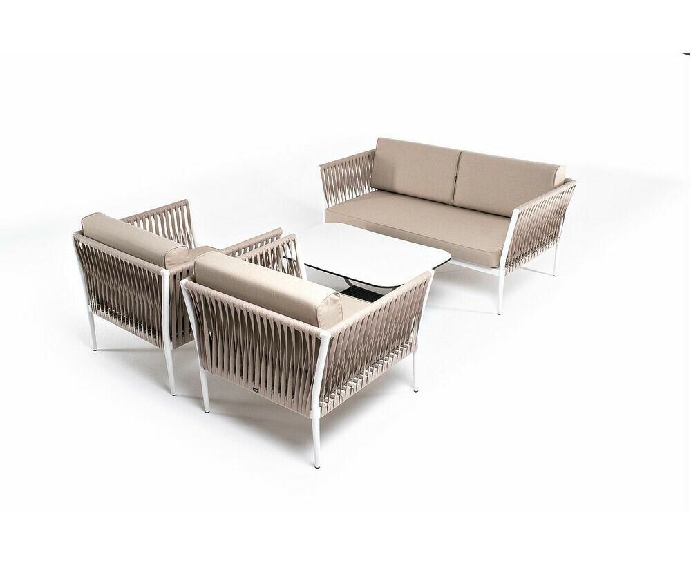 Журнальный столик также имеет алюминиевый каркас белого цвета. Столешница выполнена из монолитного компакт-пластика HPL молочного оттенка. Нижняя часть столика задекорирована роупом серого цвета и представляет дополнительную полку для хранения. "Касабланка" диван 2-местный плетеный из роупа, каркас алюминий белый муар, роуп бежевый 20мм, ткань бежевая 035 1шт. 1 600Х800Х695, "Касабланка" кресло плетеное из роупа, каркас алюминий белый муар, роуп бежевый 20мм, ткань бежевая 035 2шт. 900Х800Х695, "Глория" журнальный стол 100х65см из HPL, цвет молочный 1шт. 1 000Х650Х420,