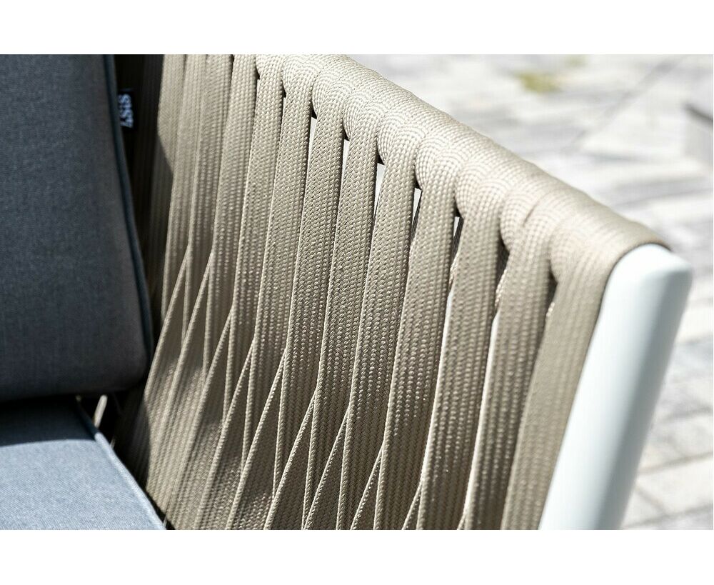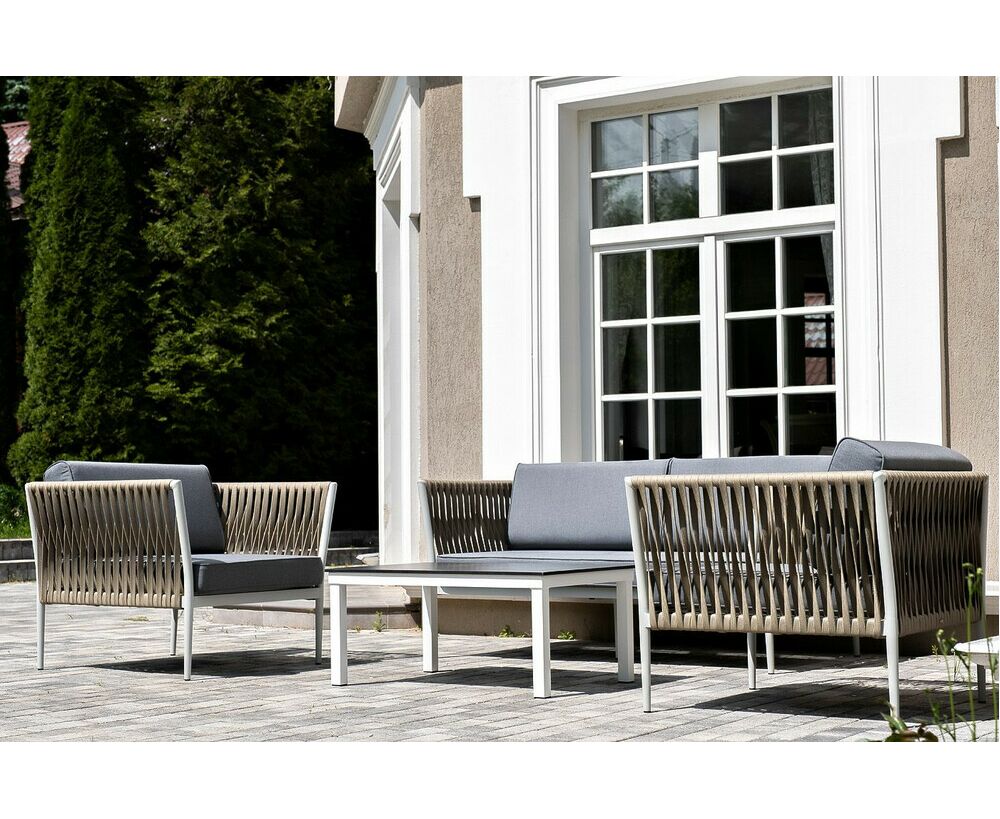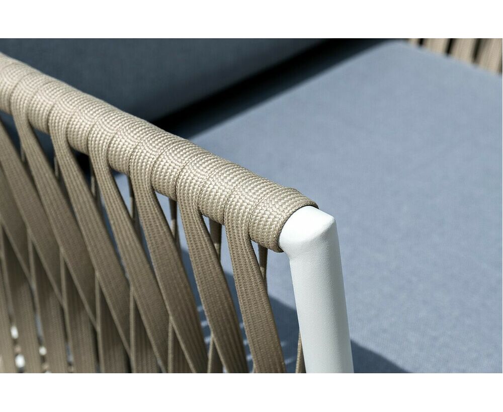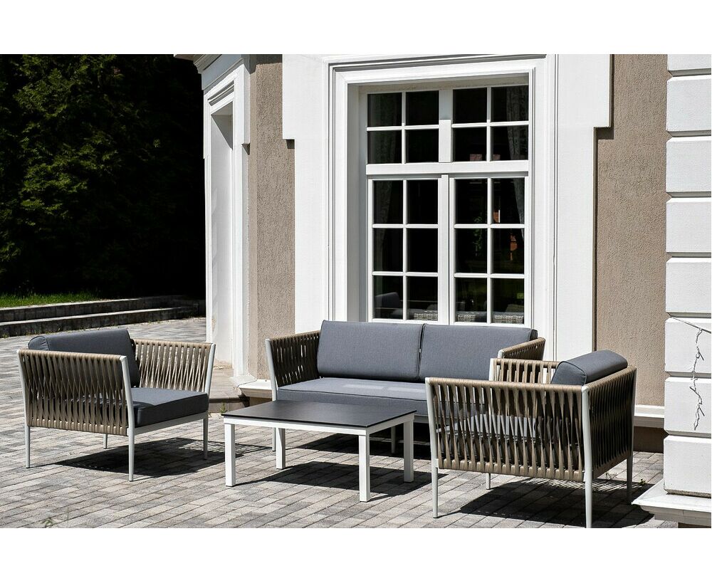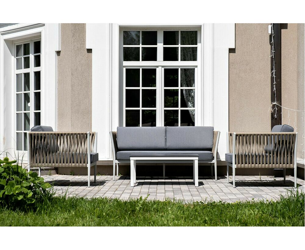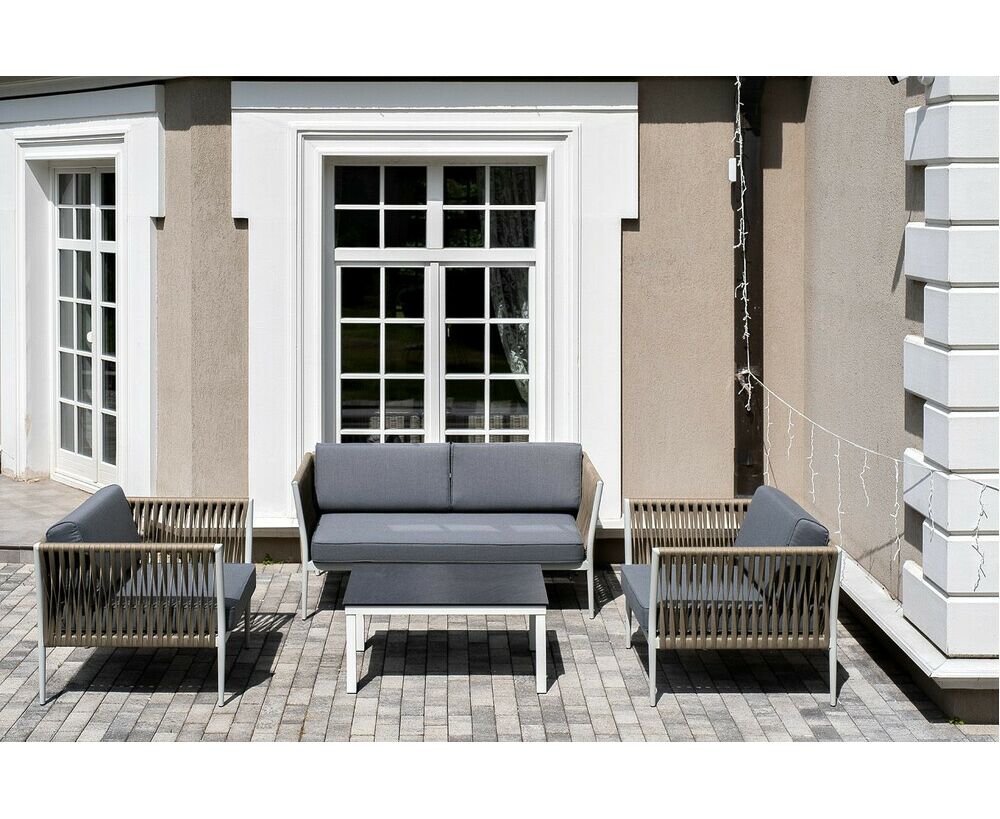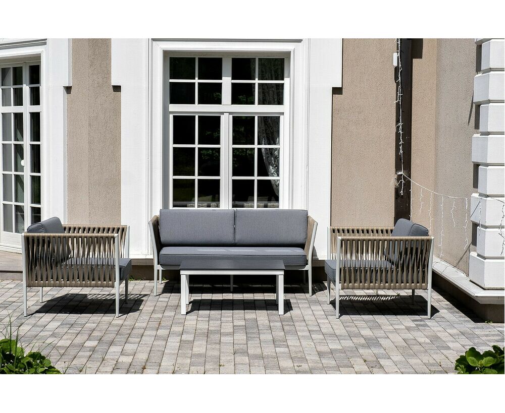 Диван и кресла изготовлены их алюминиевого прочного каркаса, оплетенного ручным способом роупом серо-коричневого цвета. Это эластичные ленты из полиэфирных волокон высокого качества.