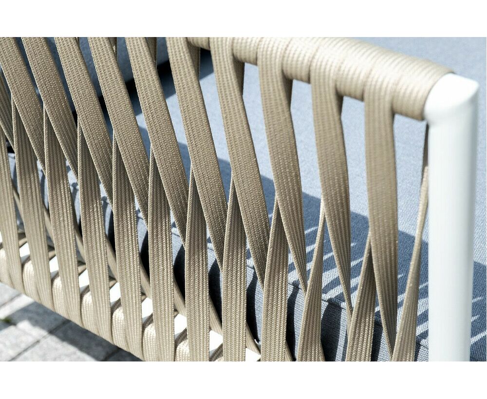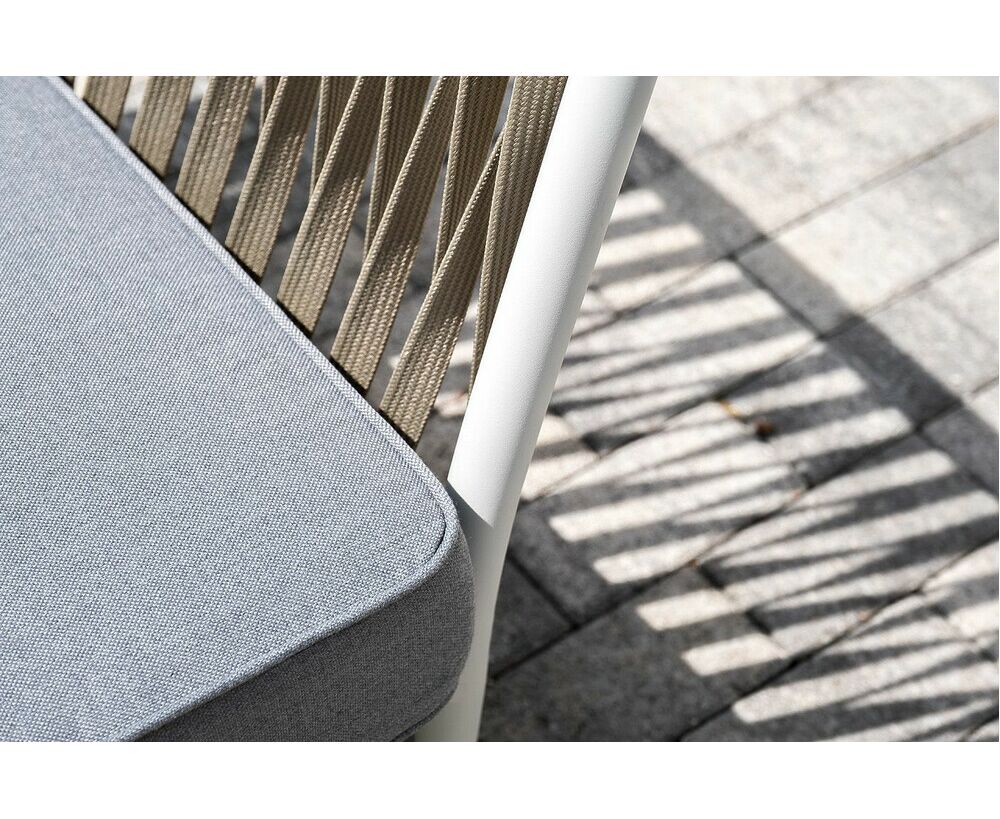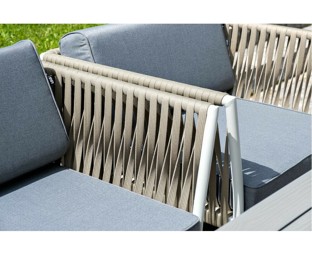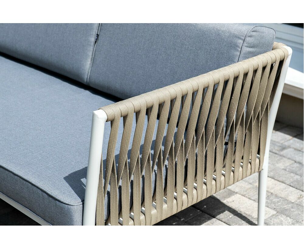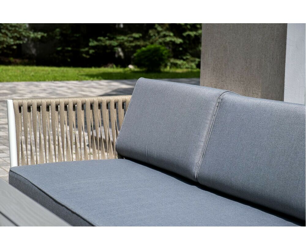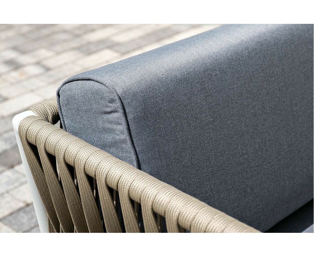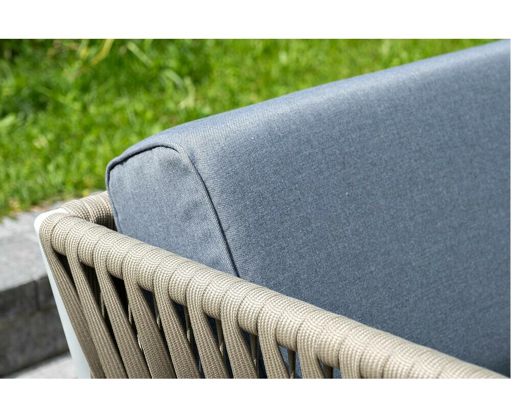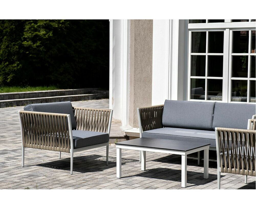 Диван и кресла изготовлены их алюминиевого прочного каркаса, оплетенного ручным способом роупом серо-коричневого цвета. Это эластичные ленты из полиэфирных волокон высокого качества.
