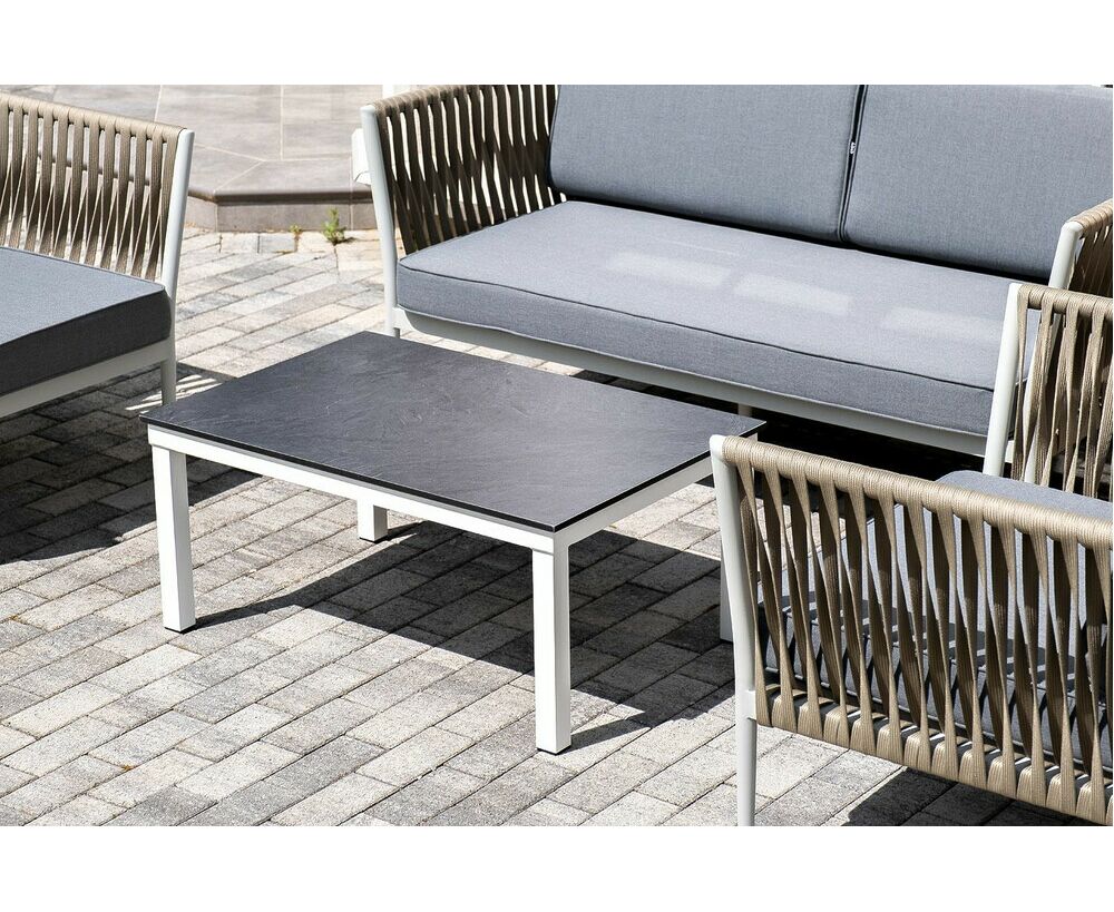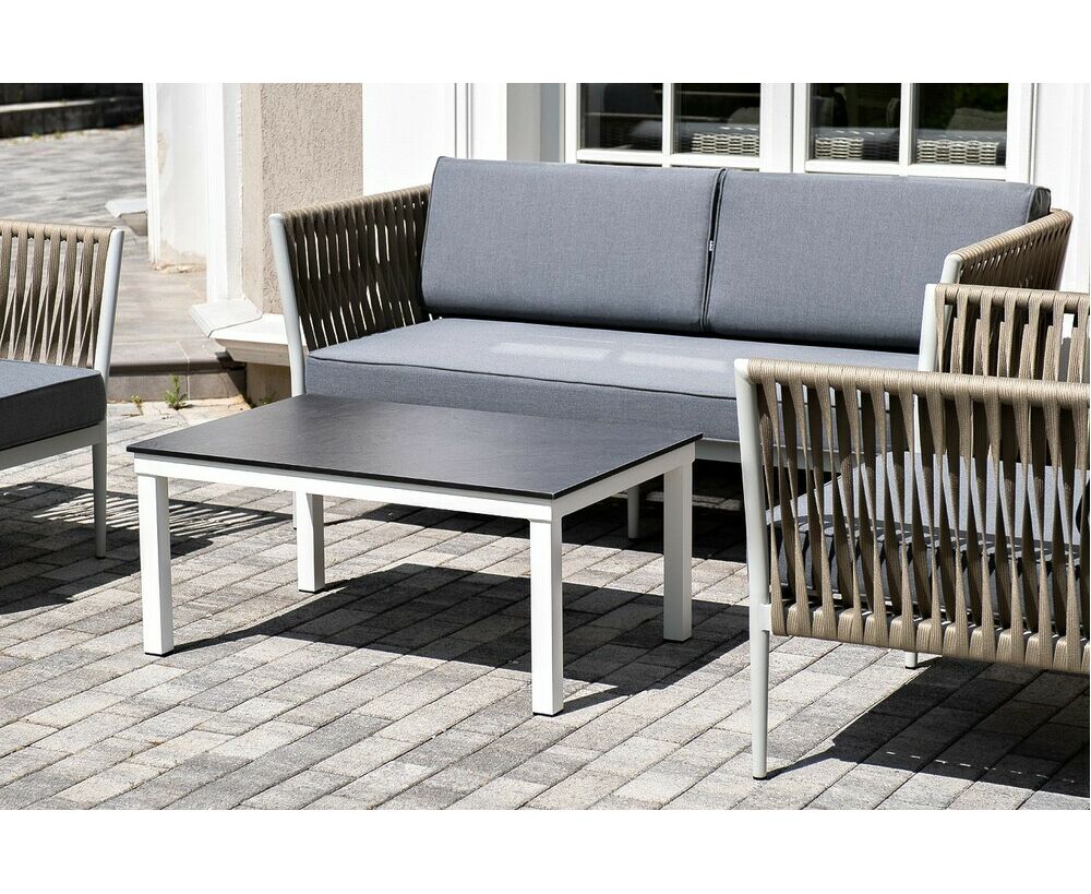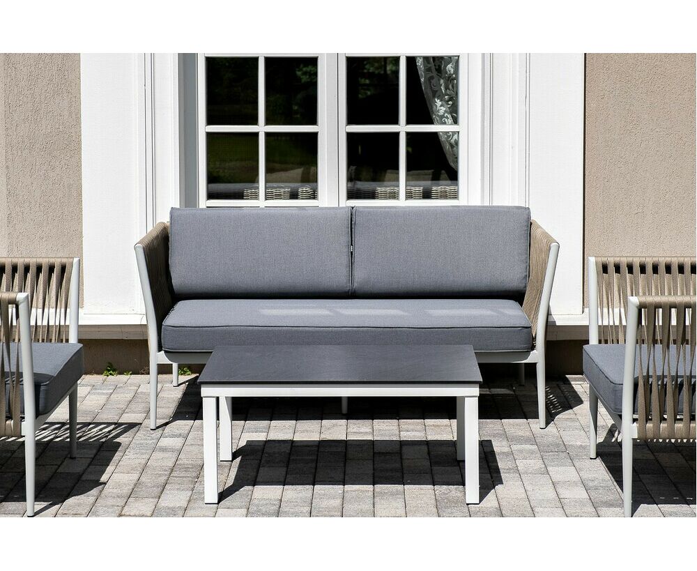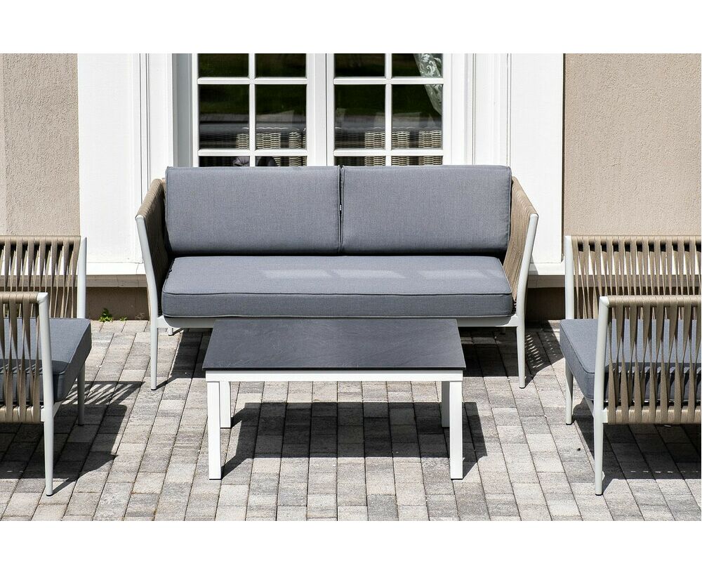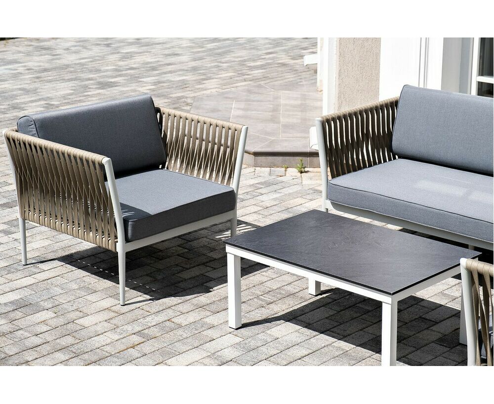 Журнальный столик также имеет алюминиевый каркас белого цвета. Столешница выполнена из монолитного компакт-пластика HPL цвета "серый гранит". "Касабланка" диван 2-местный плетеный из роупа, каркас алюминий светло-серый (RAL7035) муар, роуп серо-коричневый 23мм, ткань серая 017 1шт. 1 600Х800Х695, "Касабланка" кресло плетеное из роупа, каркас алюминий светло-серый (RAL7035) муар, роуп серо-коричневый 23мм, ткань серая 017 2шт. 900Х800Х695, "Канны" журнальный столик из HPL 95х60, H40, каркас белый, цвет столешницы "серый гранит" 1шт. 950Х600Х400,