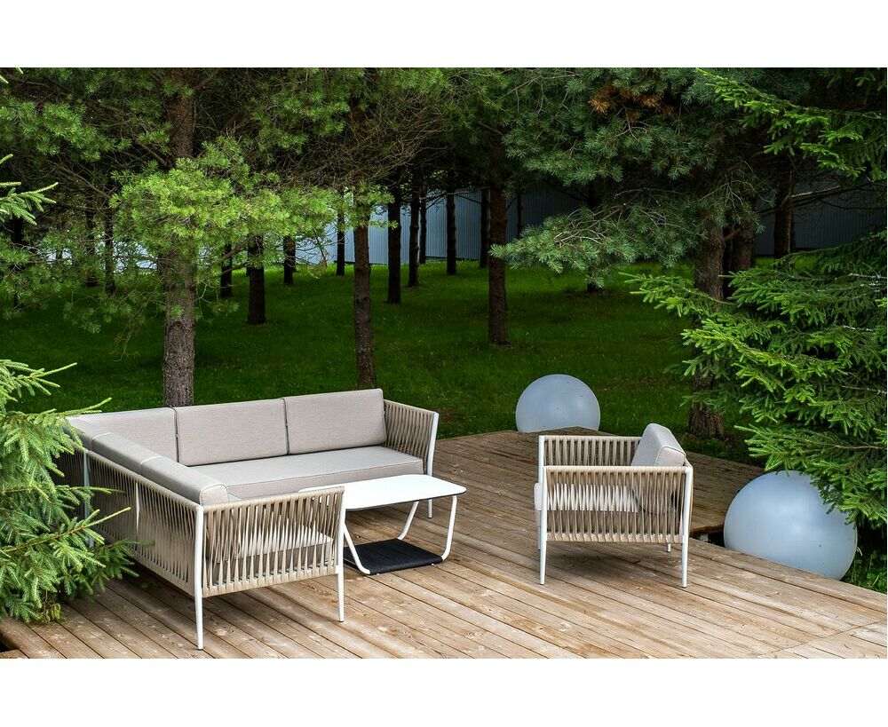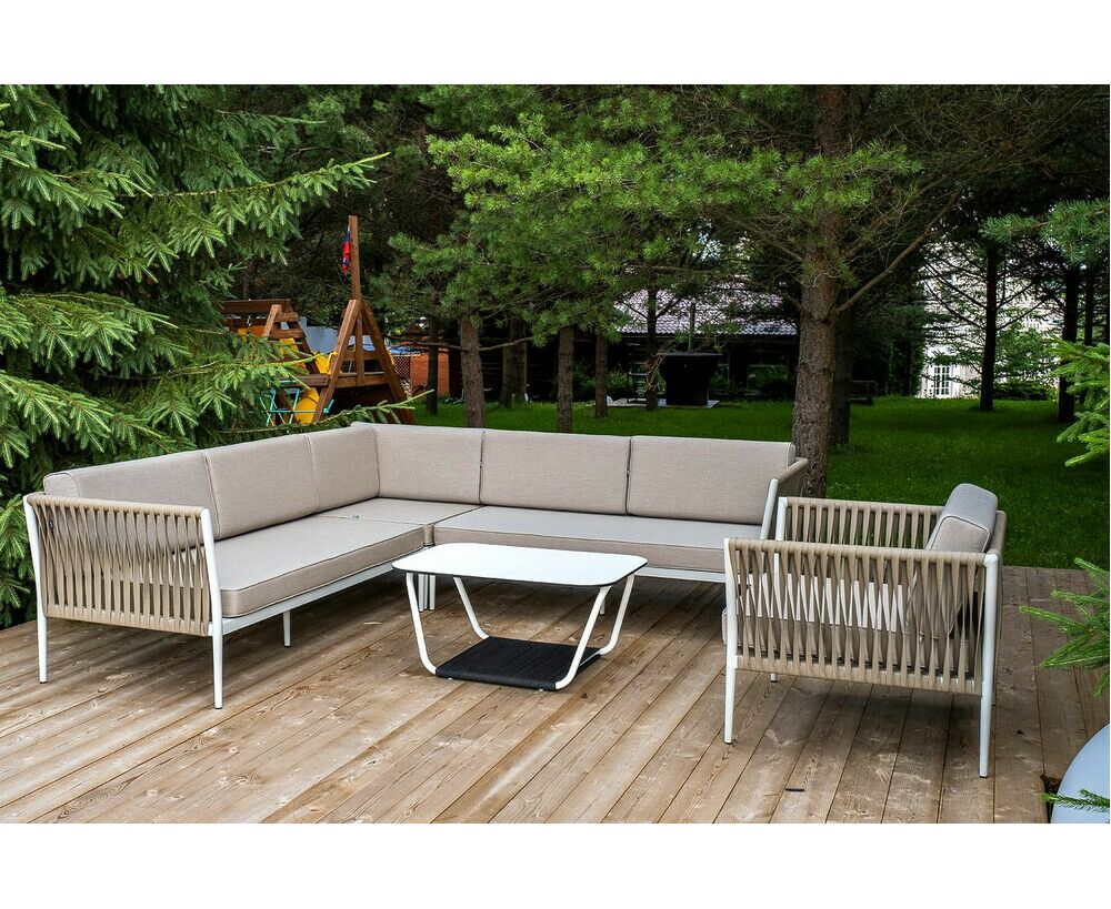 Кресла и диван идут в комплекте с мягкими подушками в чехлах серого цвета. "Касабланка" правый модуль плетеный из роупа, каркас алюминий светло-серый (RAL7035) шагрень, роуп серо-коричневый 23мм, ткань Neo ash 1шт. 1 610Х800Х700, "Касабланка" левый модуль плетеный из роупа, каркас алюминий светло-серый (RAL7035) шагрень, роуп серо-коричневый 23мм, ткань Neo ash 1шт. 1 610Х800Х700, "Касабланка" угловой модуль плетеный из роупа, каркас алюминий светло-серый (RAL7035) шагрень, роуп серо-коричневый 23мм, ткань Neo ash 1шт. 800Х800Х700, "Касабланка" кресло плетеное из роупа, каркас алюминий светло-серый (RAL7035) шагрень, роуп серо-коричневый 23мм, ткань Neo ash 1шт. 900Х800Х695, "Глория" журнальный стол 100х65см из HPL, цвет молочный 1шт. 1 000Х650Х420,