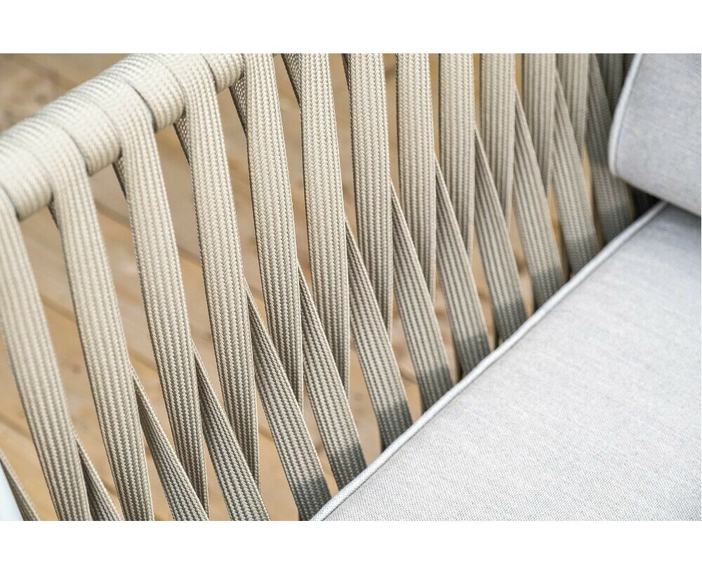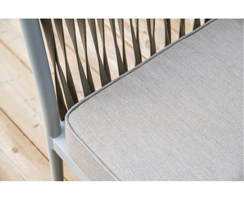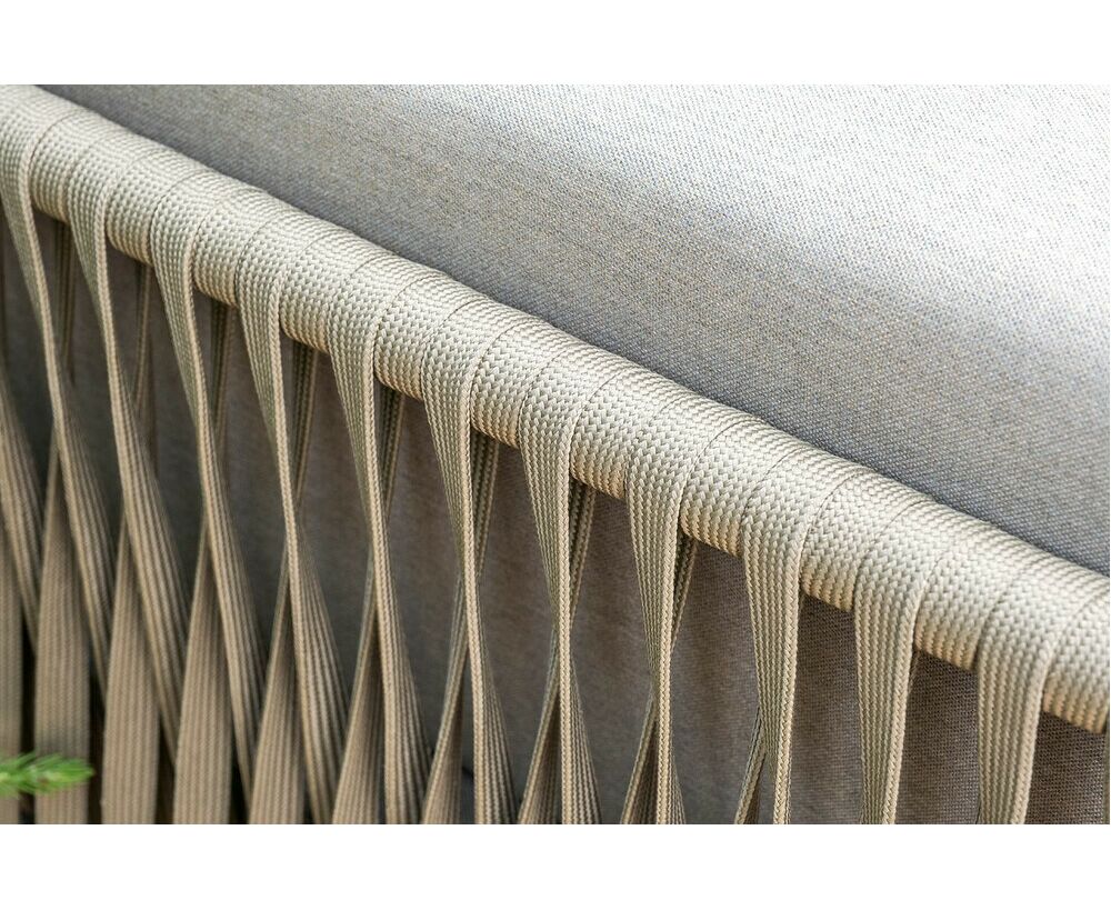 Каркас уличной мебели выполнен из износостойкого алюминия. Его дополняет серо-коричневая ручная оплетка, изготовленная на основе эластичных синтетических лент из полиэфирных волокон высокой прочности (роупа).