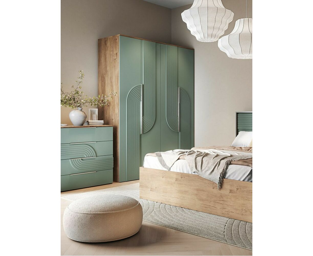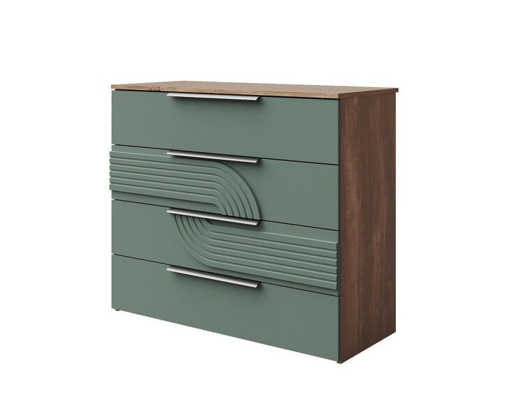 Комод для одежды и белья, в спальню «Монтиз» 4я КМК 1003.3, каркас изготовлен из ЛДСП цвета дуб мадура, фасады из МДФ цвета эвкалипт. Комод с четырьмя наружными выдвижными ящиками, установленные на направляющие скрытого монтажа с доводчиками.