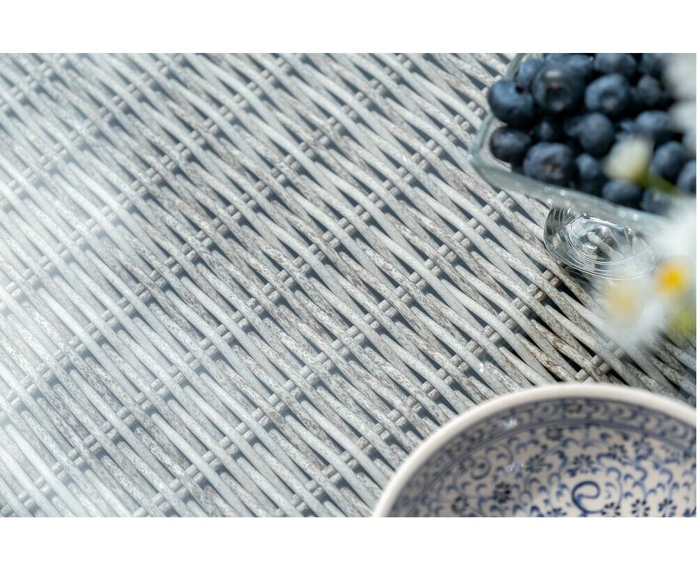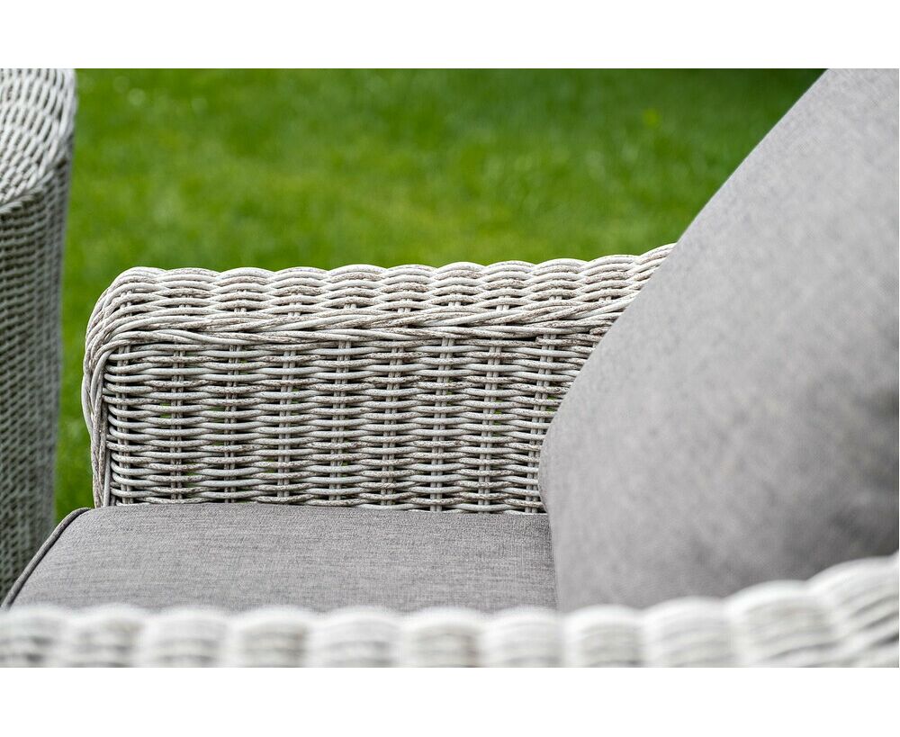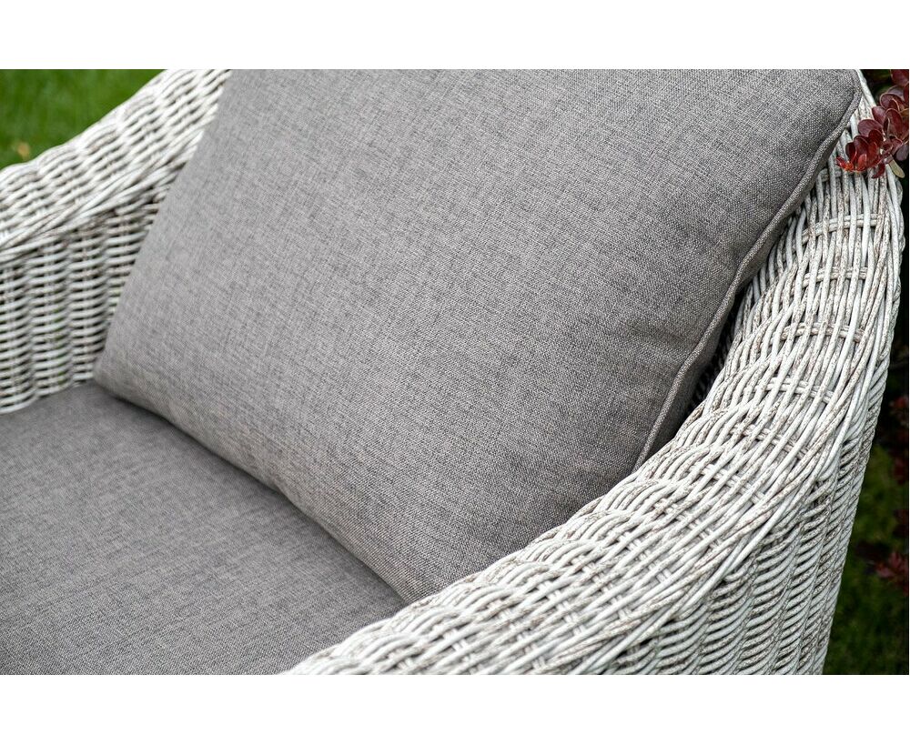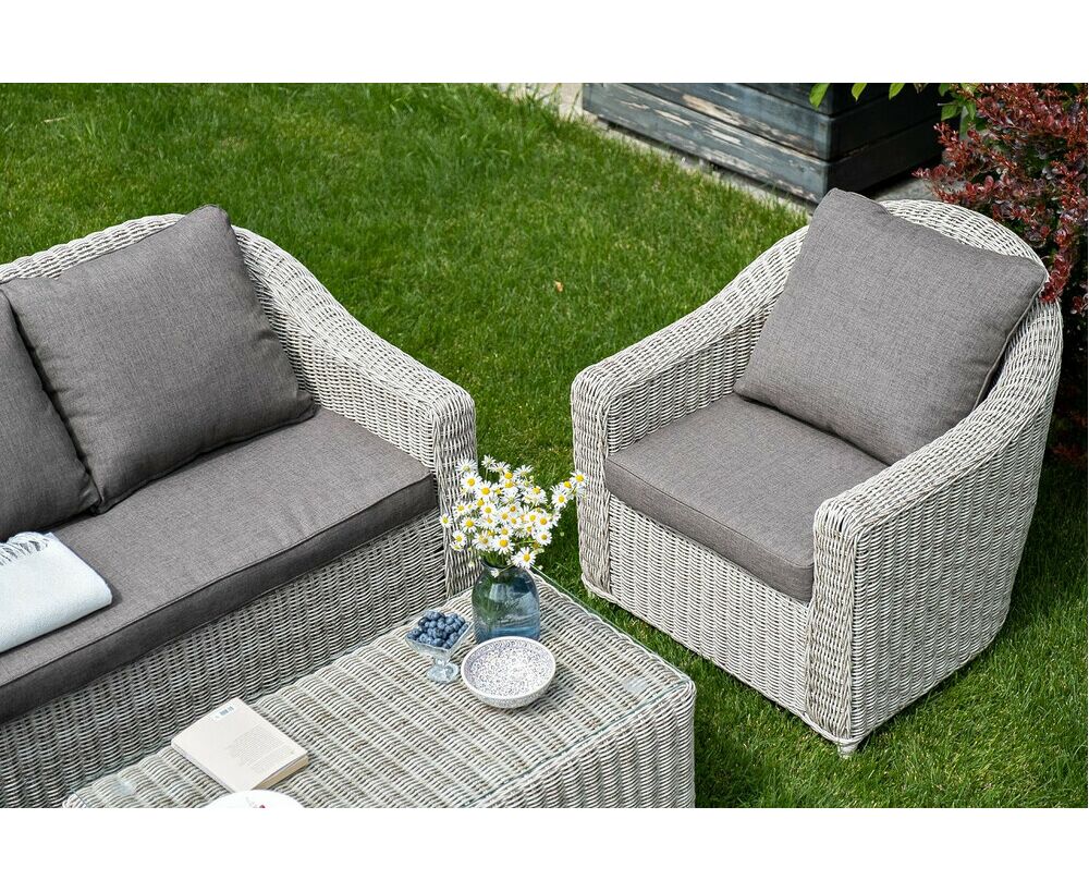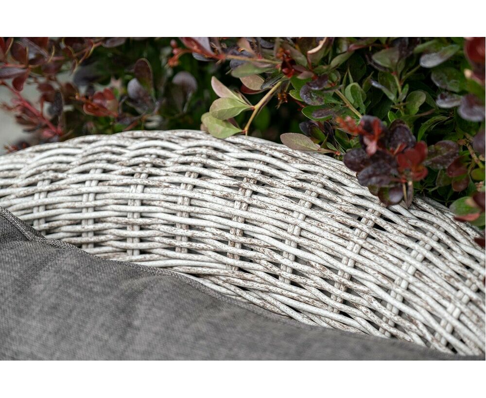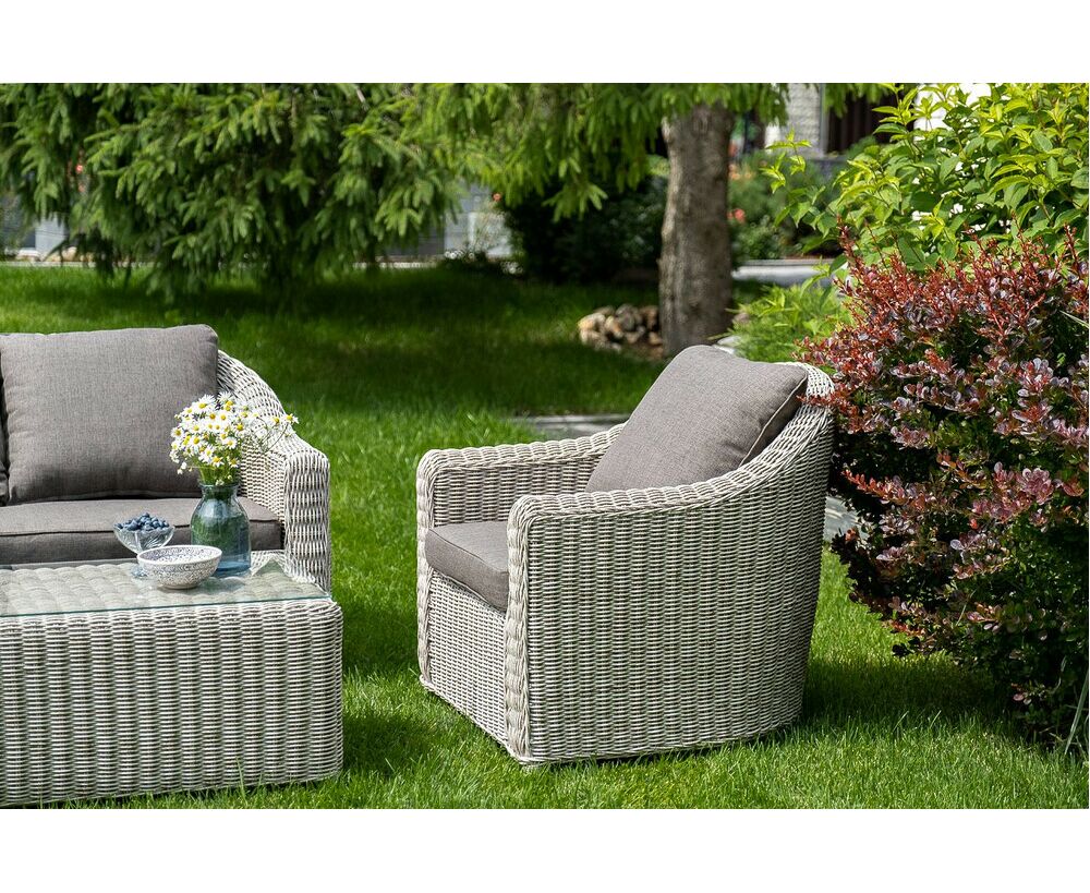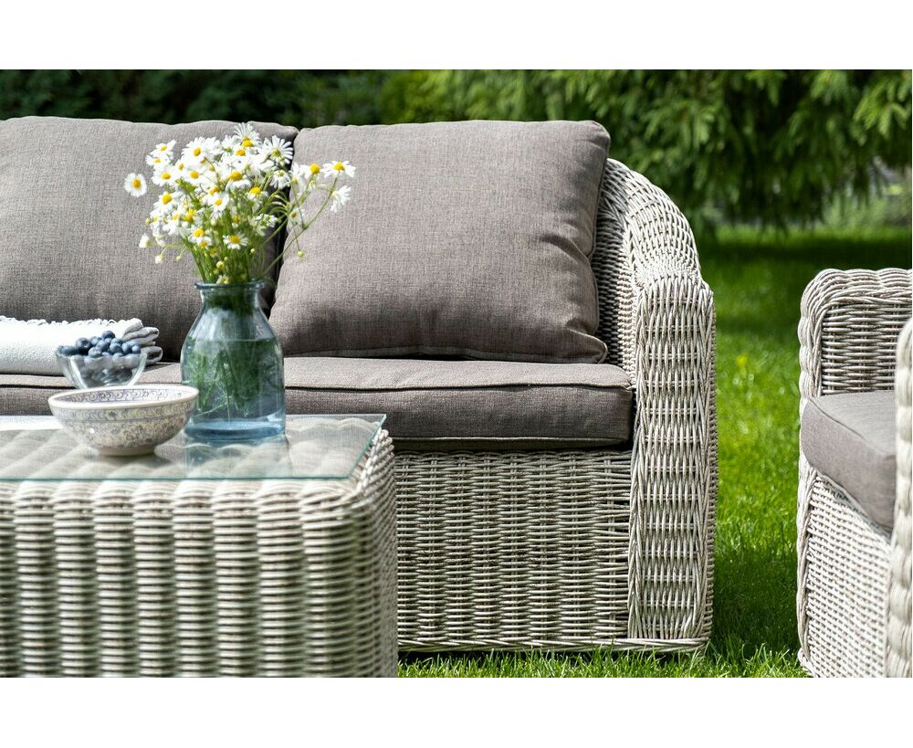 Садовая мебель выполнена из алюминиевого каркаса, выдерживающего большие нагрузки, и круглого искусственного ротанга. Каркас оплетен с помощью ручного метода и представлен в бежевом цвете.