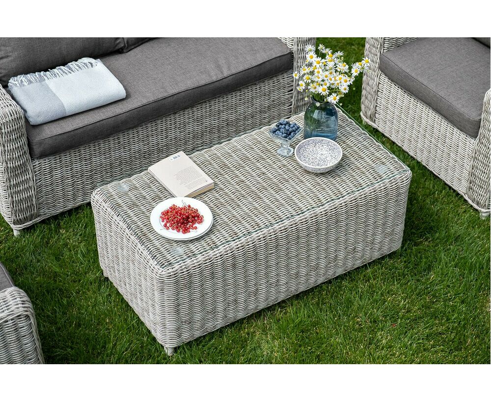 Журнальный столик дополняет рабочая поверхность из прочного стекла, толщина – 5 мм. "Кон Панна" диван из искусственного ротанга двухместный, цвет бежевый 1шт. 1 370Х800Х800, "Кон Панна" кресло из искусственного ротанга, цвет бежевый 2шт. 800Х800Х800, "Кон Панна" столик журнальный из искусственного ротанга, цвет бежевый 1шт. 1 000Х500Х420,