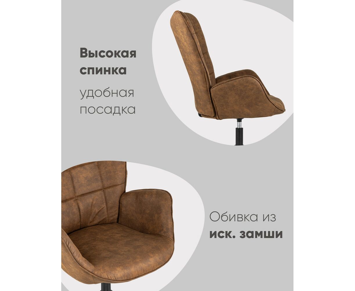 Мягкое сиденье с высокой поддерживающей спинкой анатомической формы подарит комфорт и уют. Пракрасно впишется в интерьер гостиной или столовой зоны. В качестве обивки используется искуственная замша – прочный и приятный на ощупь материал. Внутренняя часть спинки украшена геометричной строчкой в виде квадратов. Крестовина выполнена из металла в черном цвете и обеспечивает хорошую устойчивость. Удобные подлокотники и функция вращения добавят еще больше комфорта.