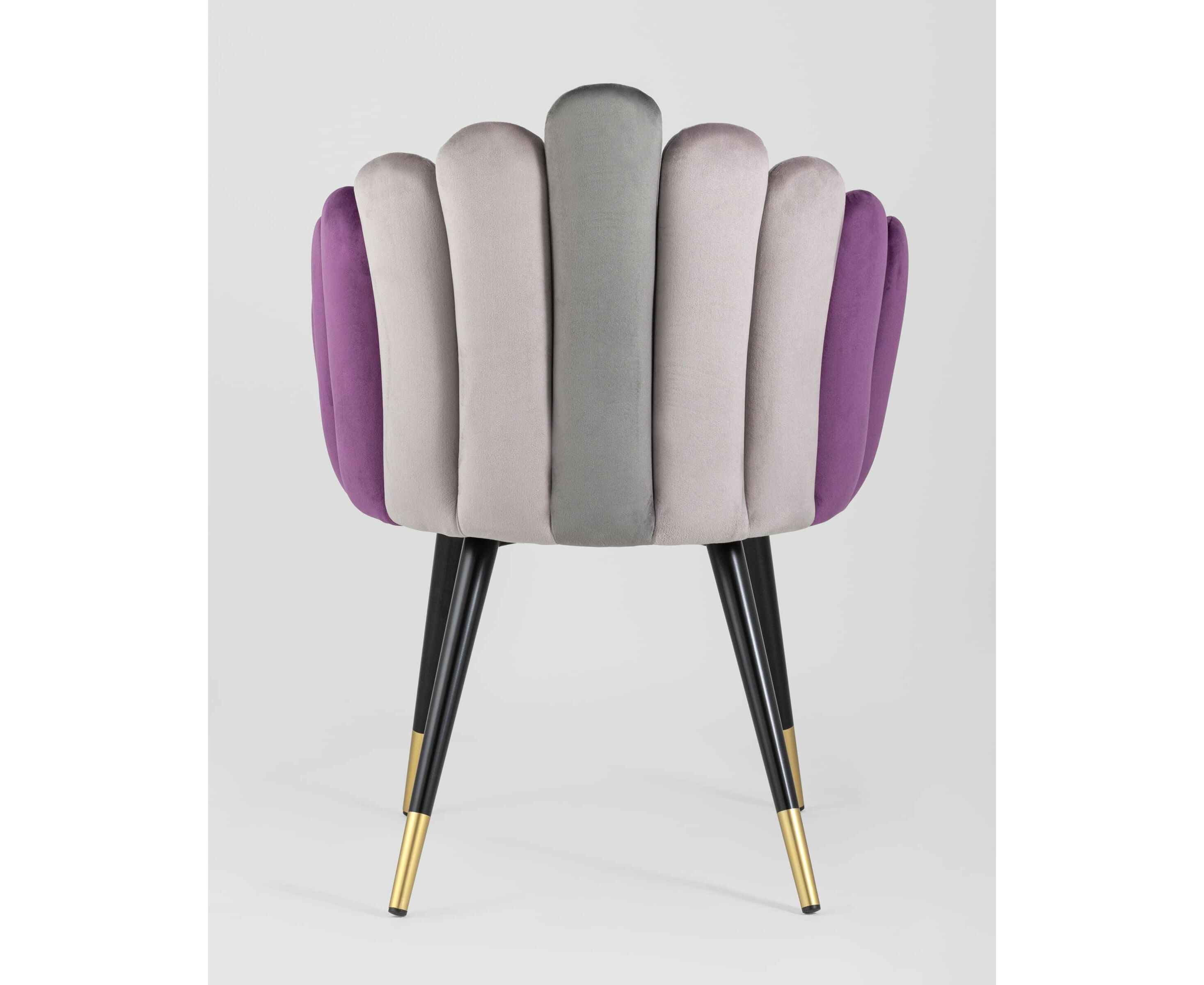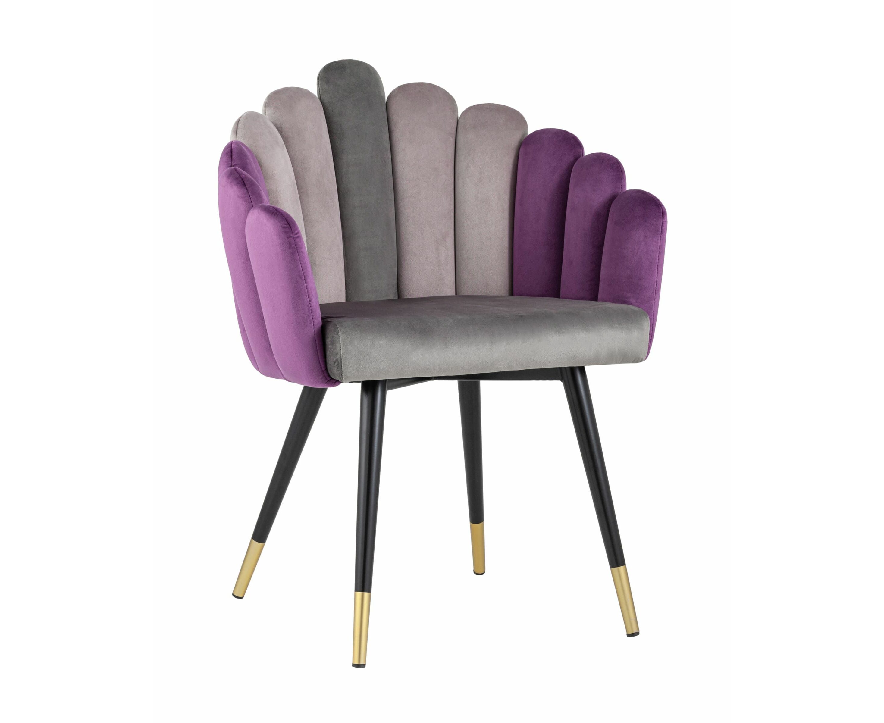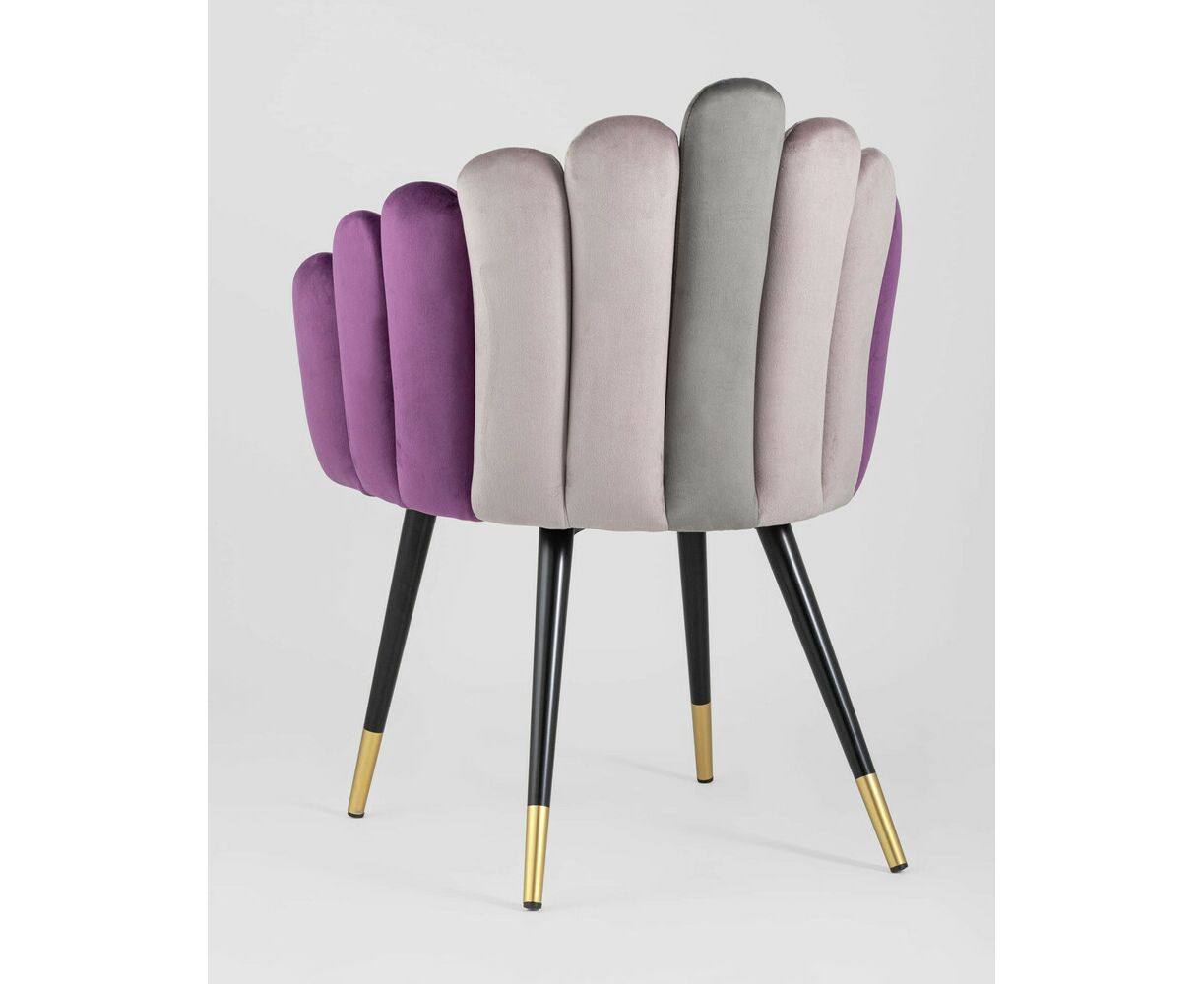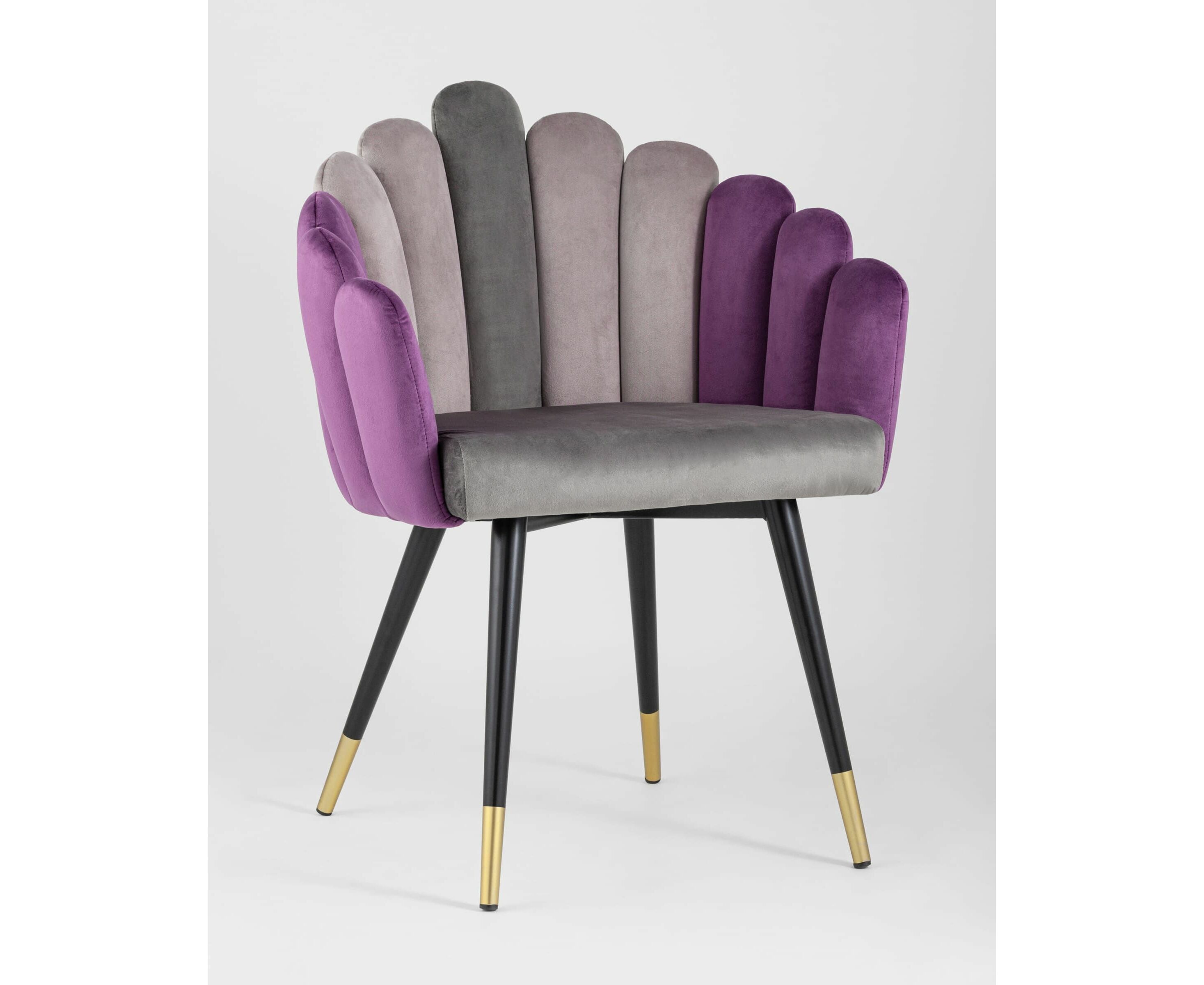 Яркое многоцветное кресло с обивкой из прочного велюра. Надежная опора достигается благодаря металлическому каркасу и удобным устойчивым ножкам с золотым декором. Спинка с оригинальным дизайном украшена широкими полосами в виде веера.