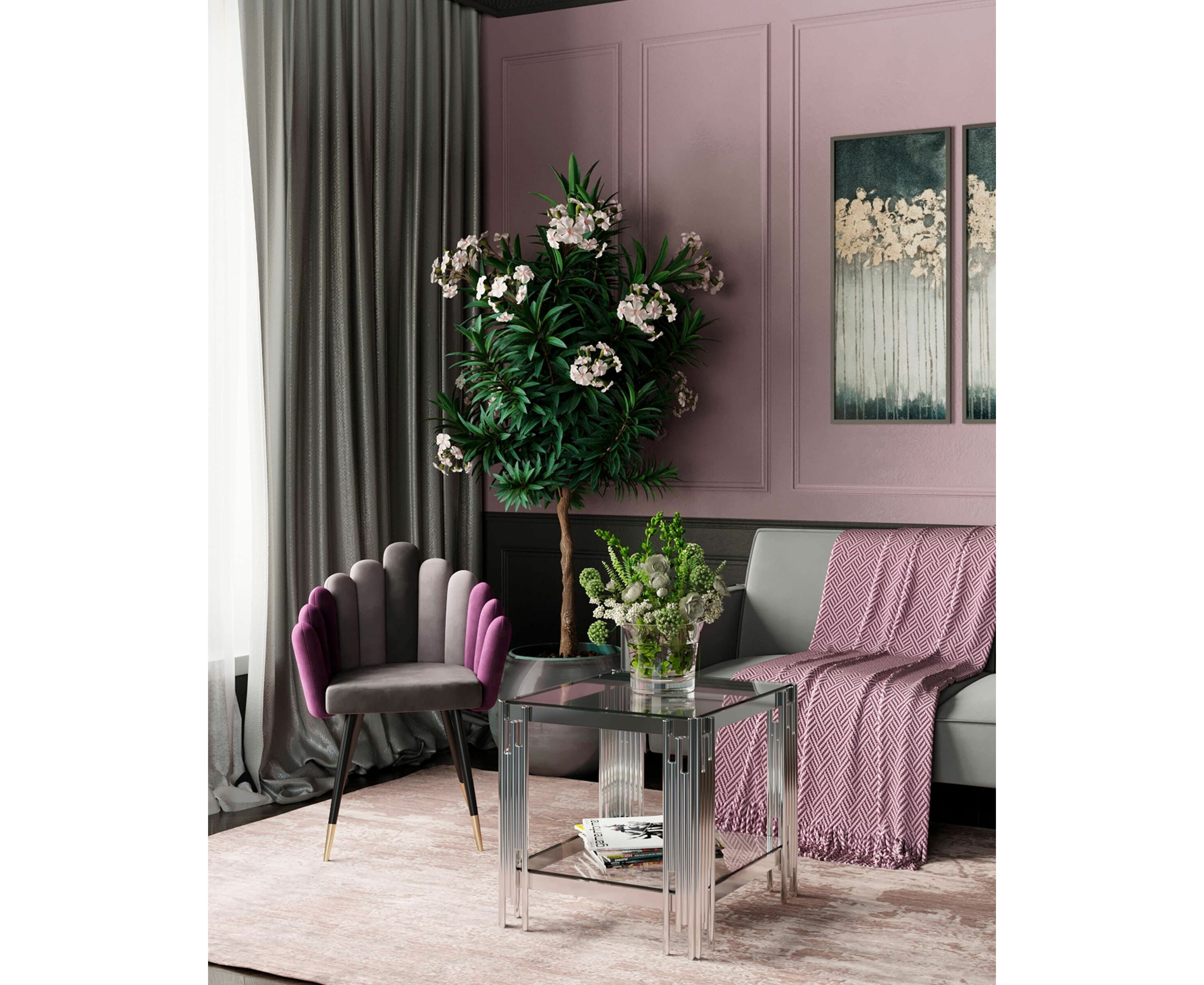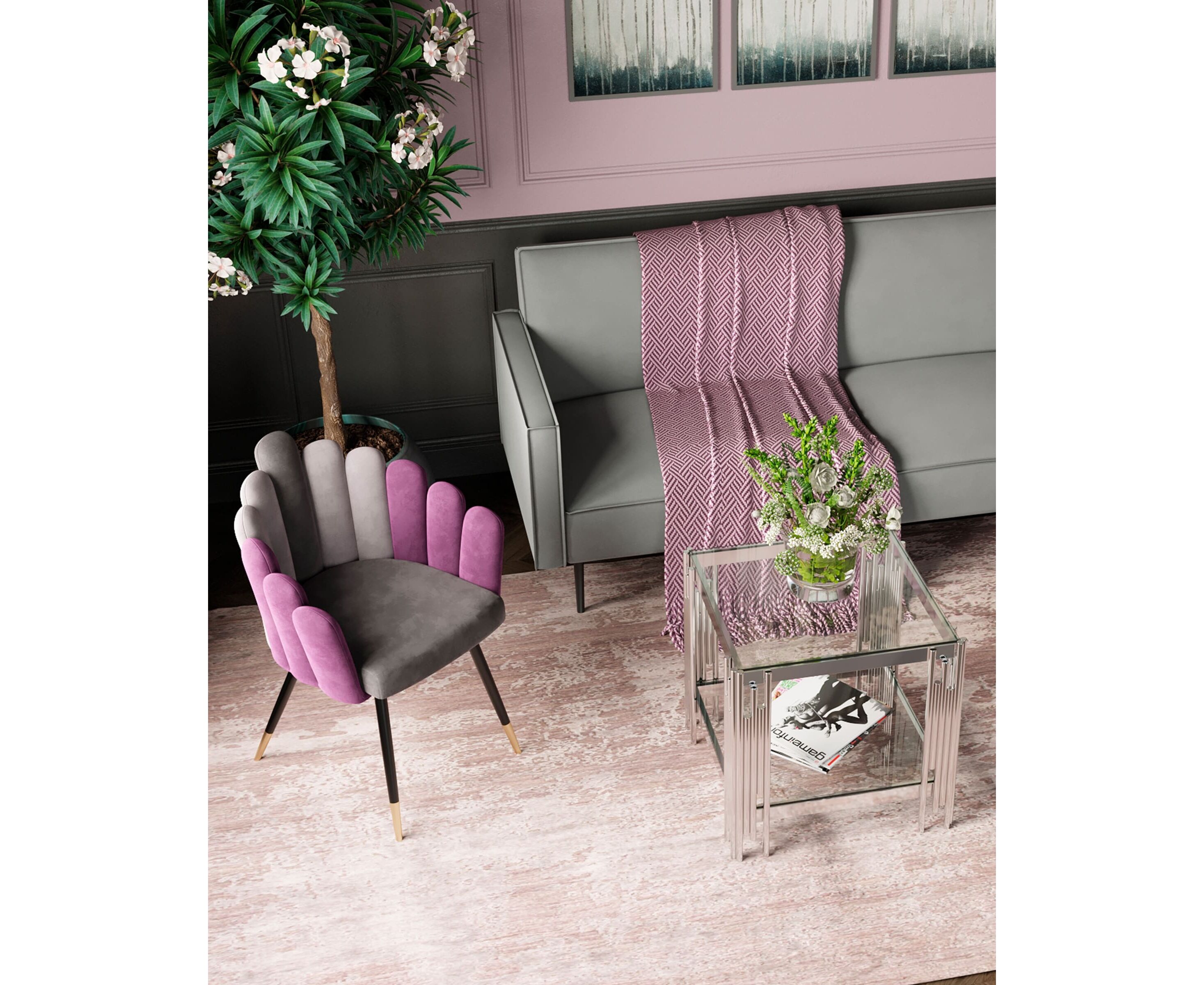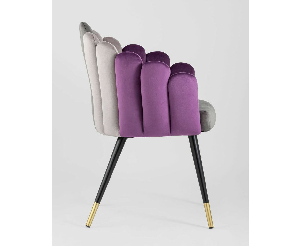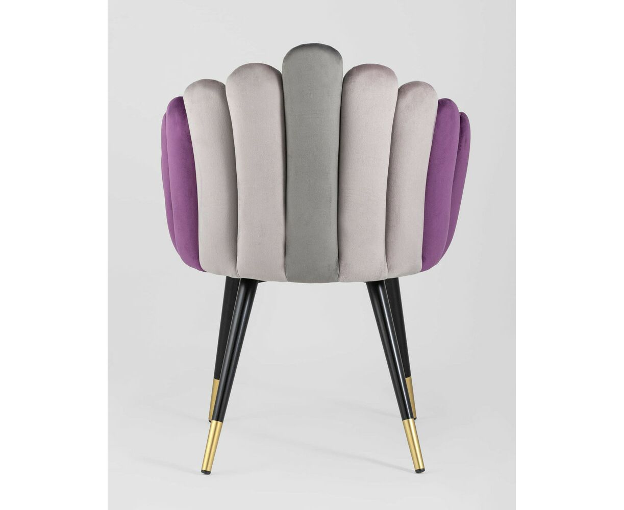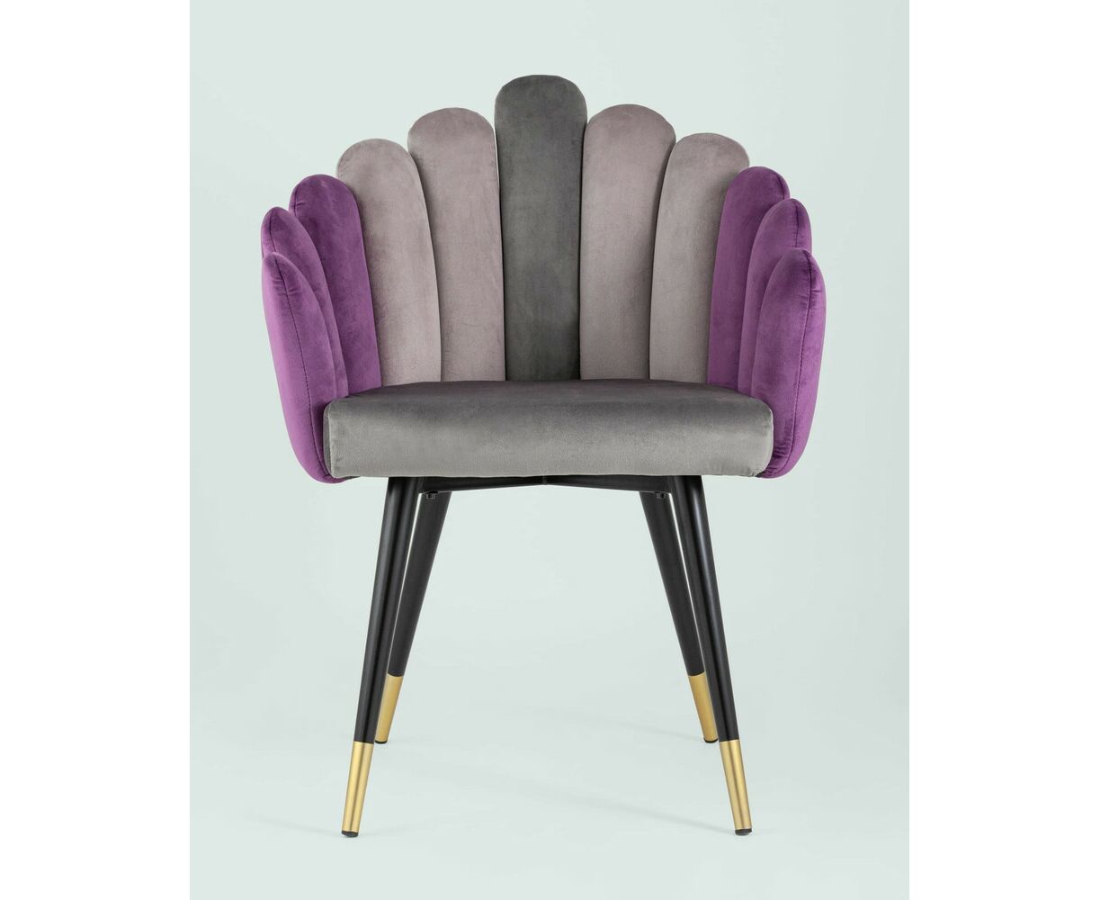 Яркое многоцветное кресло с обивкой из прочного велюра. Надежная опора достигается благодаря металлическому каркасу и удобным устойчивым ножкам с золотым декором. Спинка с оригинальным дизайном украшена широкими полосами в виде веера.