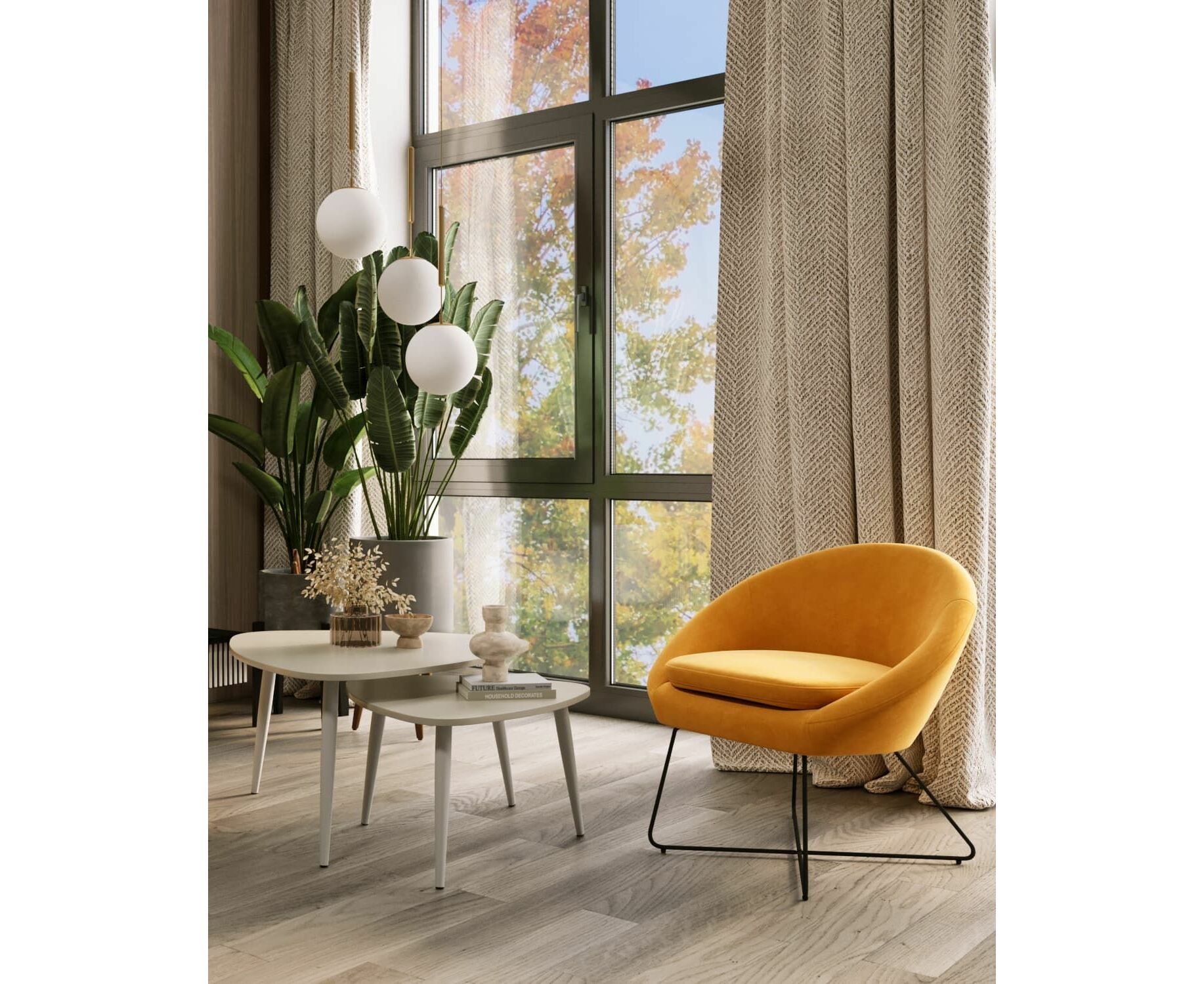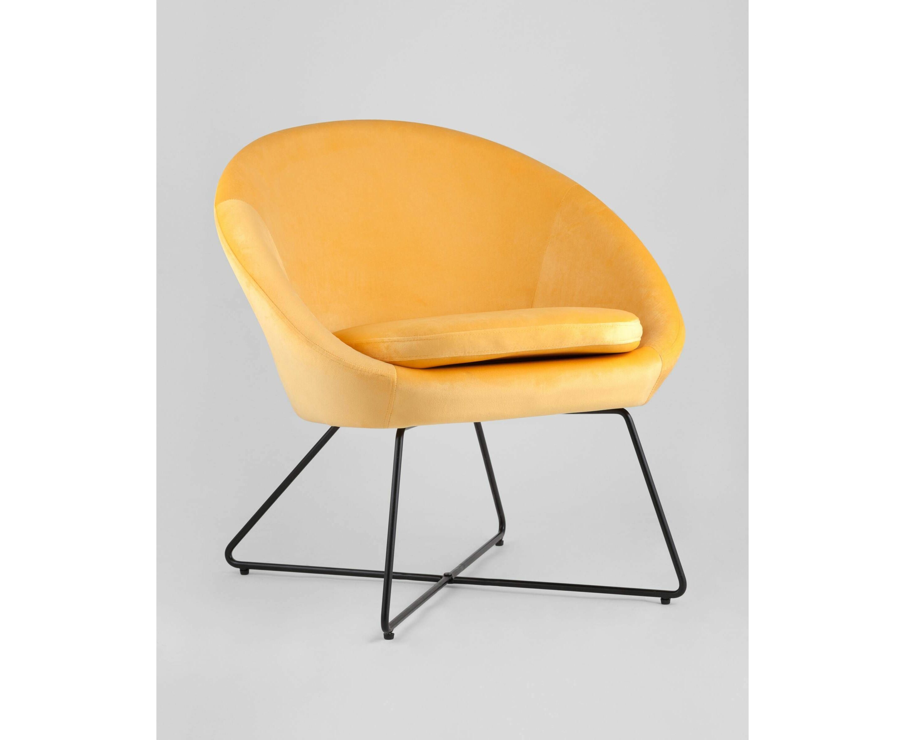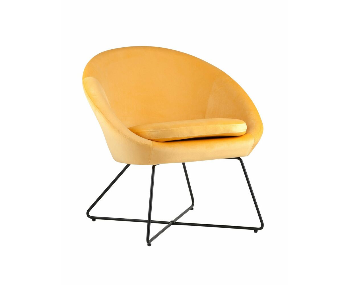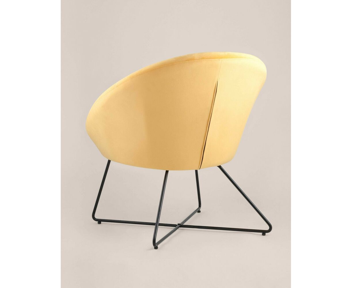 Широкая спинка плавно переходит в удобные подлокотники. Перекрещенные ножки изготовлены из металла и добавляют креслу оригинальности. Для дополнительного комфорта в кресле есть мягкое плотное сиденье. В качестве обивки используется велюр, приятный на ощупь. Металлический каркас добавляет устойчивости и выдерживает нагрузку до 120 кг.