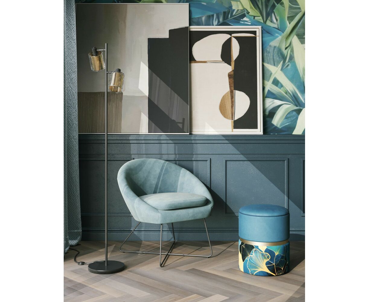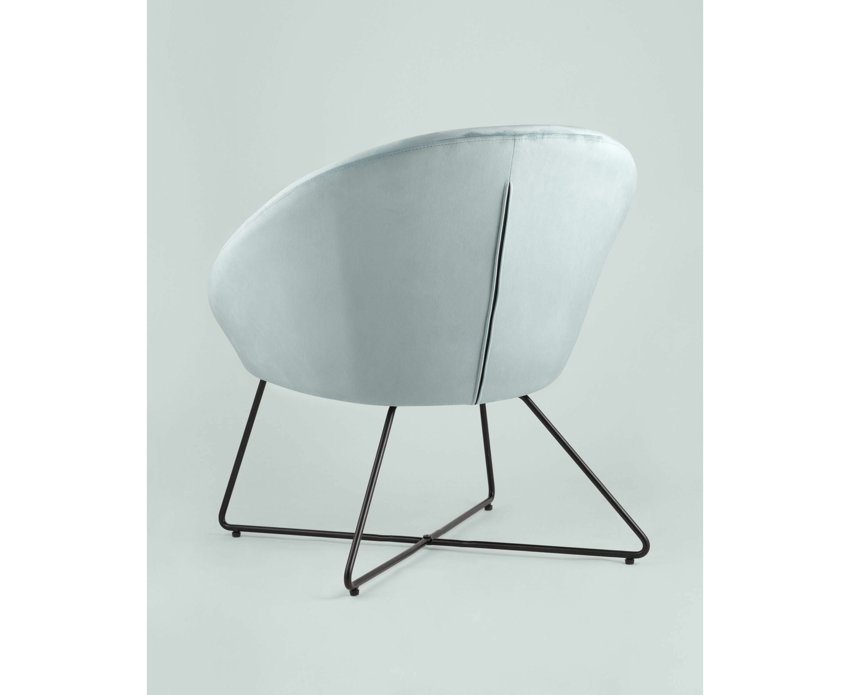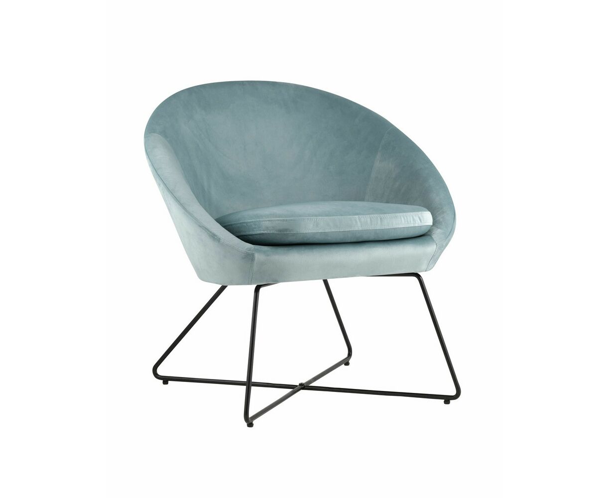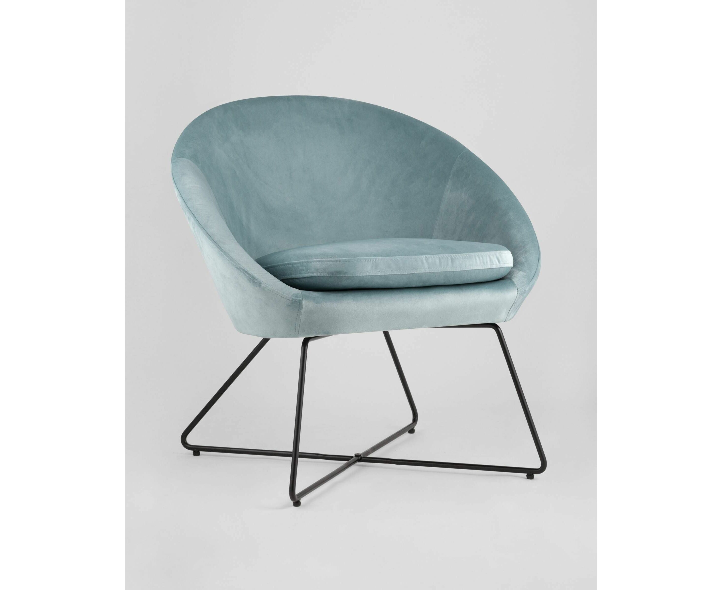 Широкая спинка плавно переходит в удобные подлокотники. Перекрещенные ножки изготовлены из металла и добавляют креслу оригинальности. Для дополнительного комфорта в кресле есть мягкое плотное сиденье. В качестве обивки используется велюр, приятный на ощупь. Металлический каркас добавляет устойчивости и выдерживает нагрузку до 120 кг.