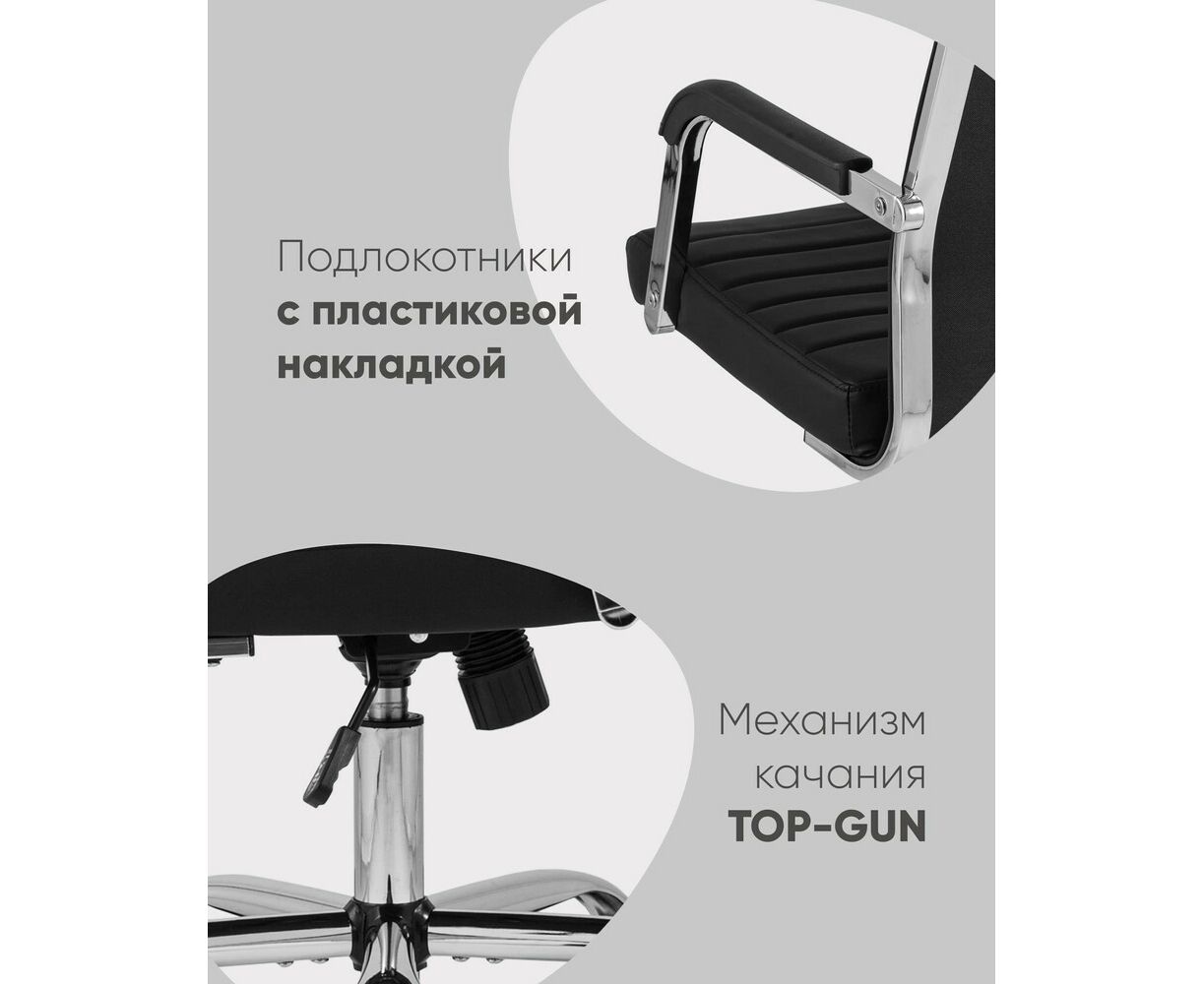Современное, компактное и функциональное офисное кресло. Удобная спинка оказывает качественную поддержку и позволяет провести в кресле долгое время без усталости. Обивка спинки и сиденья изготовлена из качественной экокожи. Механизм регулировки по высоте и качания Top Gun позволяет выбрать максимально удобное положение.