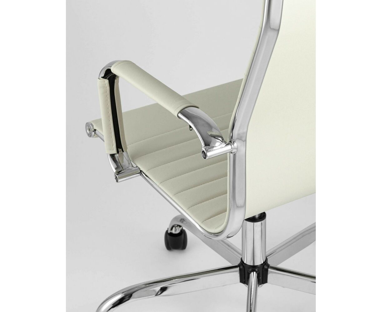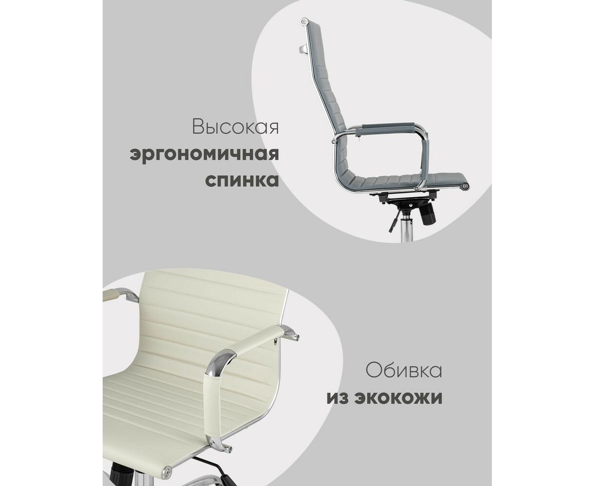Сиденье и спинка кресла изготовлены из экокожи. Этот же материал используется для чехлов на подлокотниках. Крестовина и подлокотники выполнены из хромированного металла.
