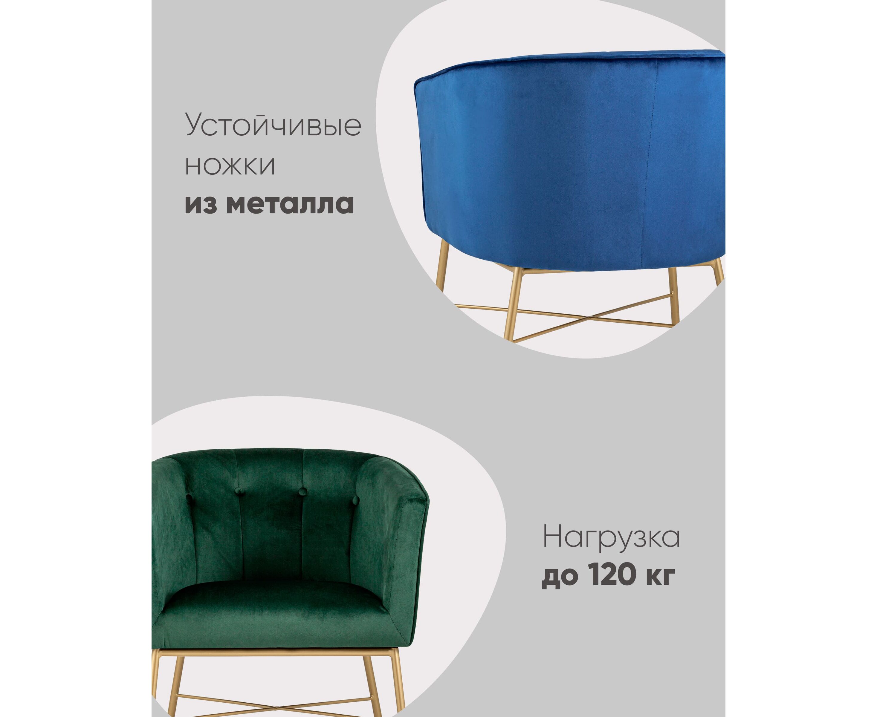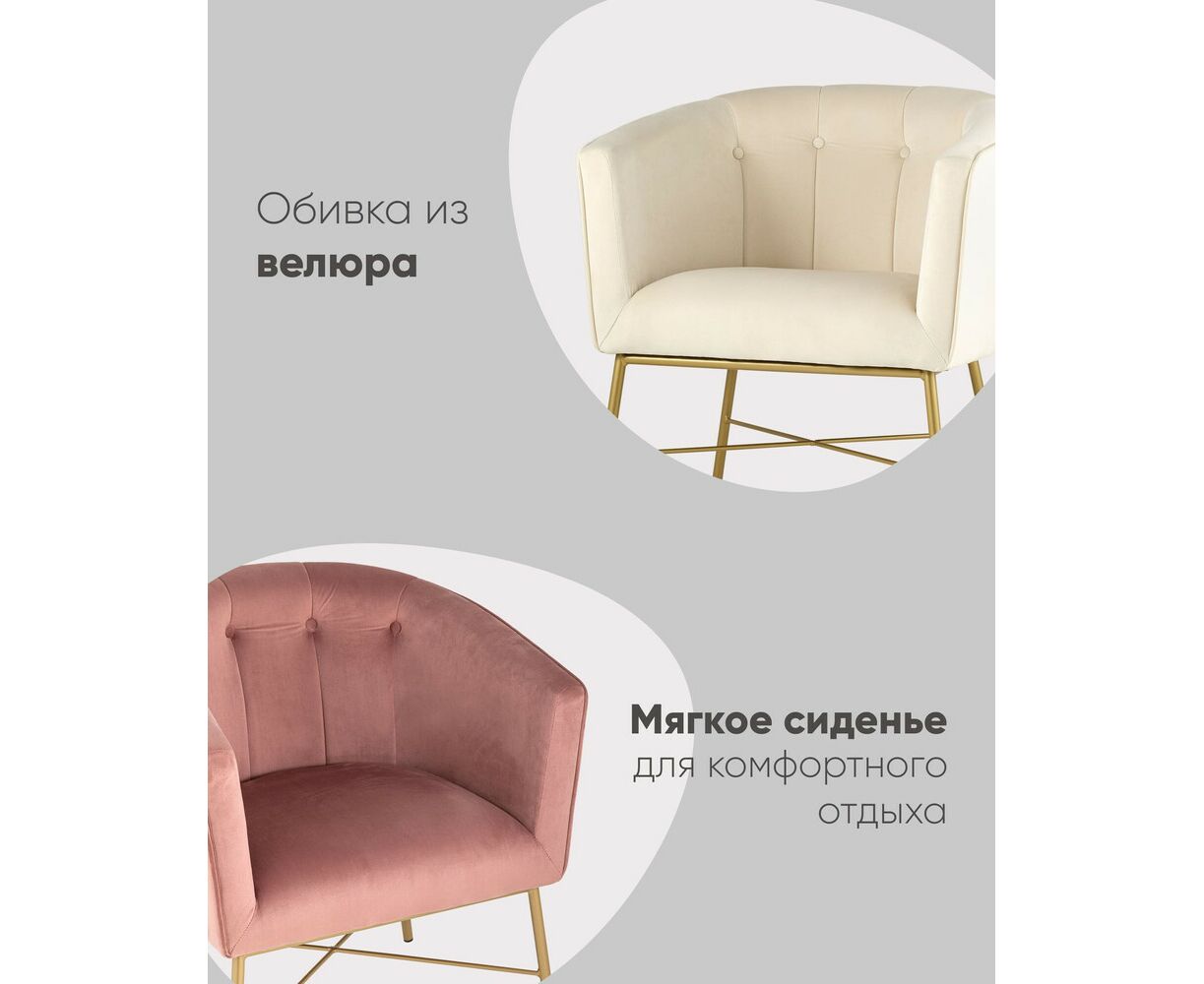 Современное кресло с подлокотниками и металлическими ножками. Обивка выполнена из прочного и износостойкого велюра. Широкая спинка, переходящая в подлокотники высотой 70 см от пола, и мягкое сиденье обеспечивает удобную посадку и уют. Украшает кресло декор на внутренней стороне спинки и металлический каркас в золотом цвете.